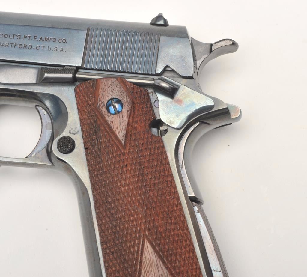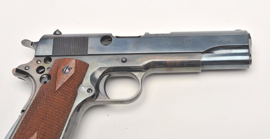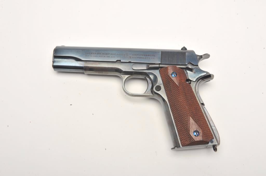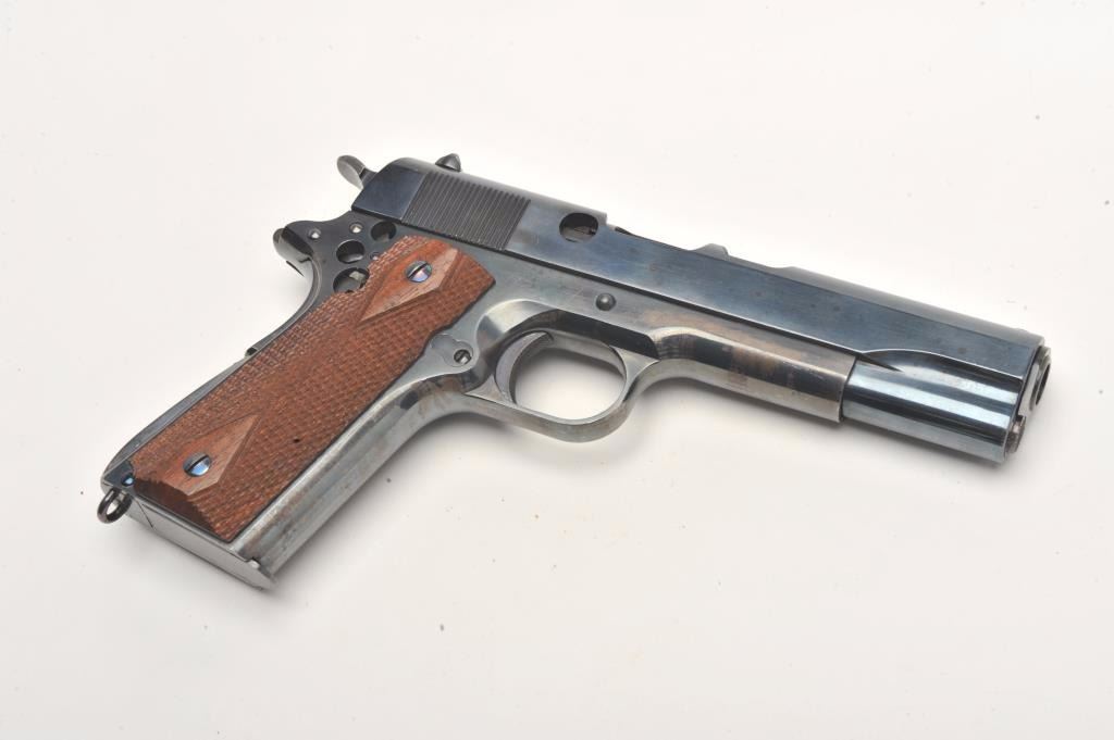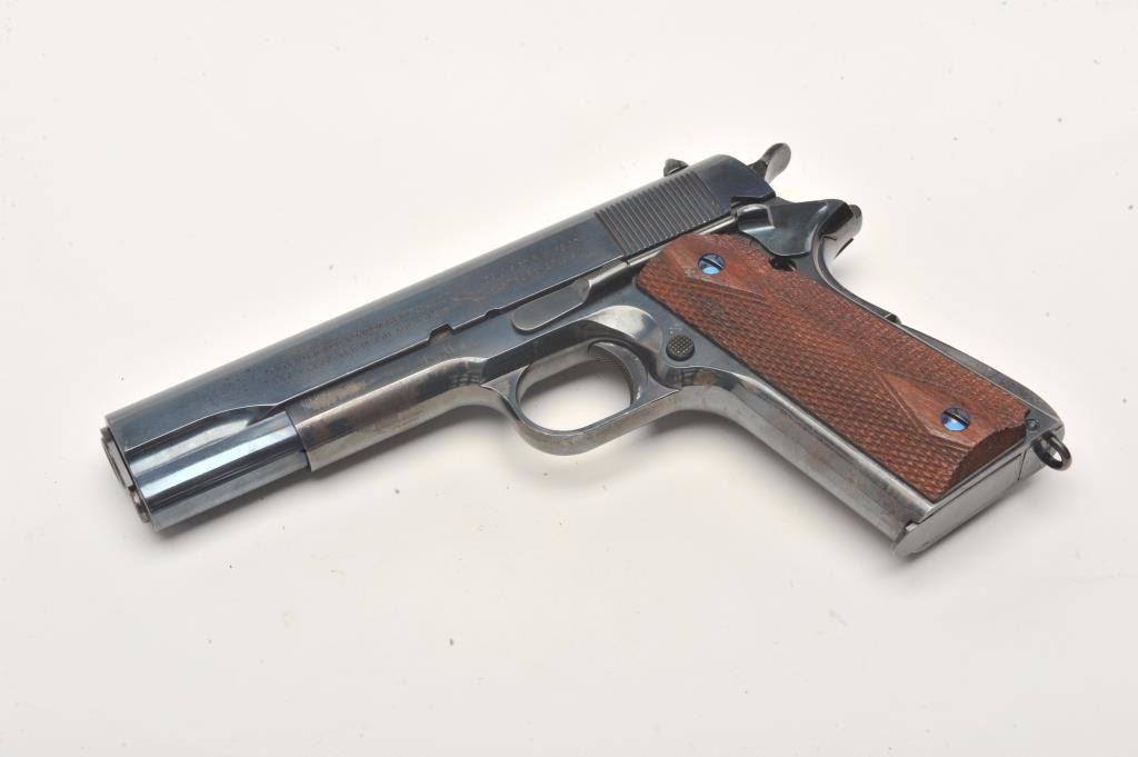 Colt Model 1911A-1 “Cut-away” semi-automatic pistol, .45 caliber, 5” barrel, re-blued finish, checkered wood grips, two-tone magazine, no visible S/N, in overall very good + condition as refinished and cut-awaymachined to show working interior pistol parts and action. (C&R/PPT). Est.: $1,400-$2,800.
