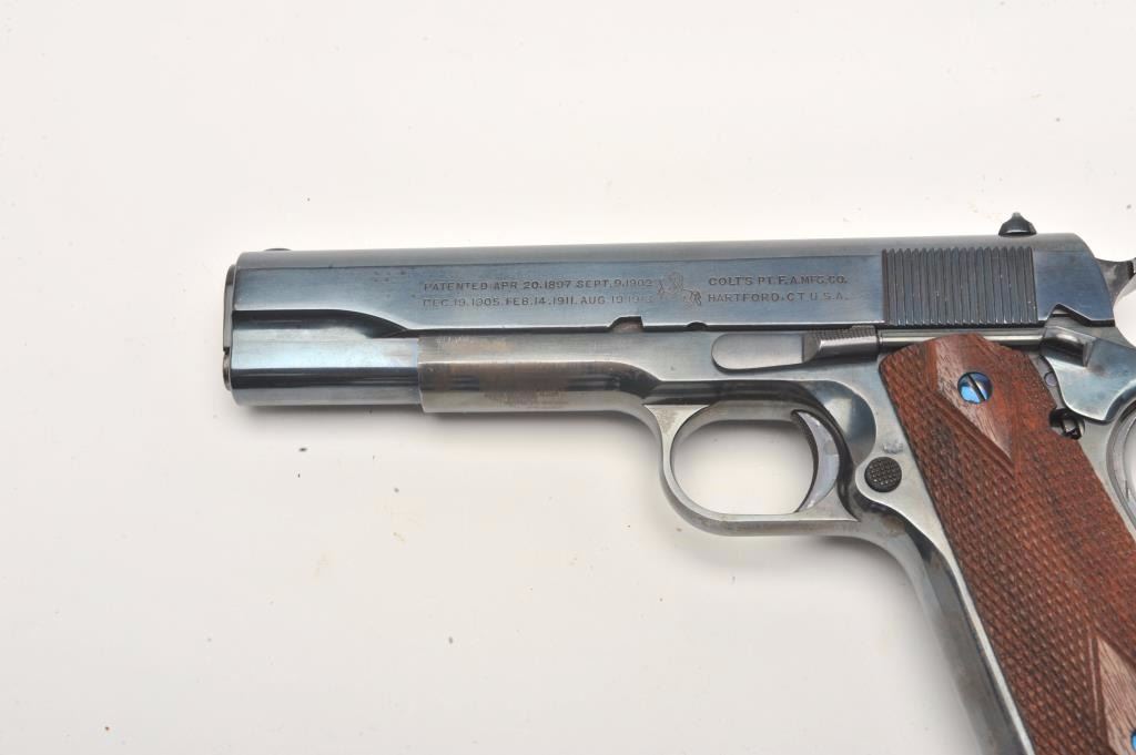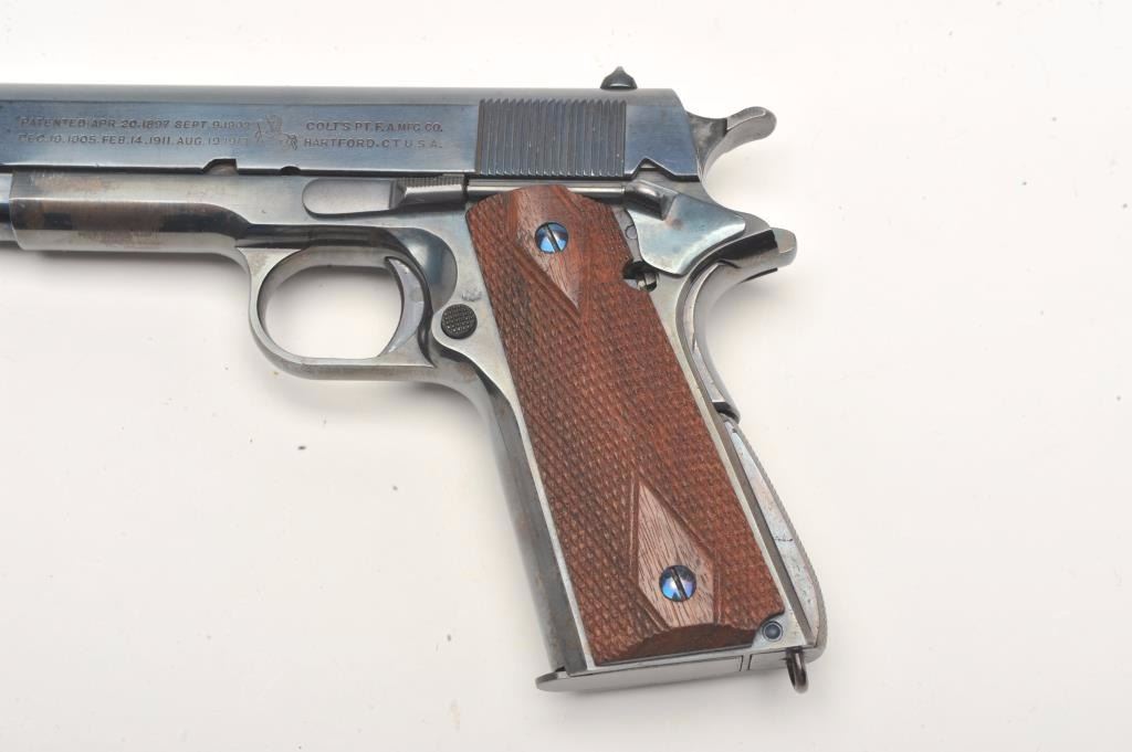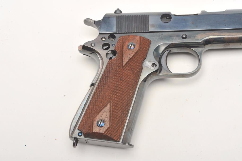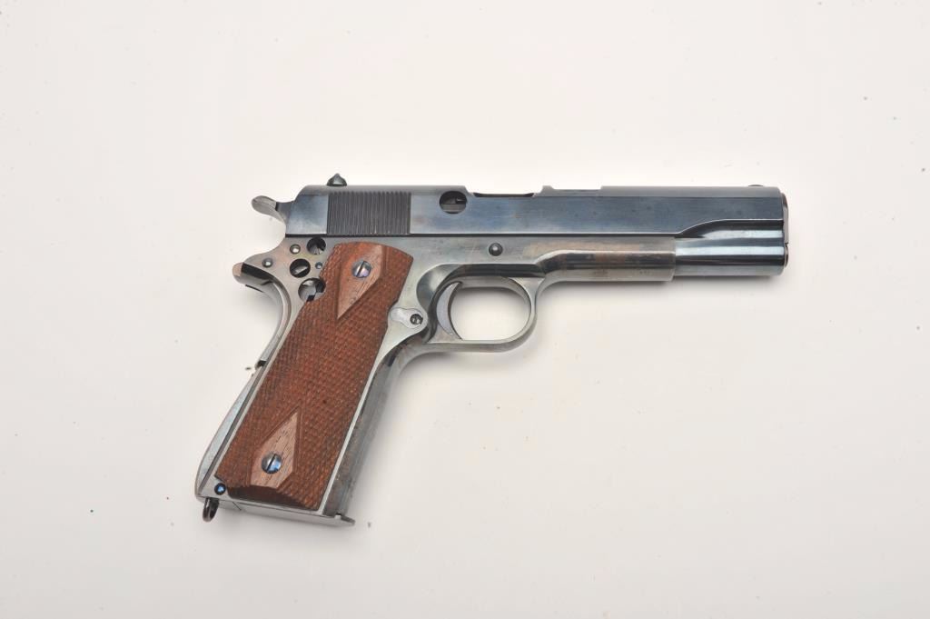 Colt Model 1911A-1 “Cut-away” semi-automatic pistol, .45 caliber, 5” barrel, re-blued finish, checkered wood grips, two-tone magazine, no visible S/N, in overall very good + condition as refinished and cut-awaymachined to show working interior pistol parts and action. (C&R/PPT). Est.: $1,400-$2,800.