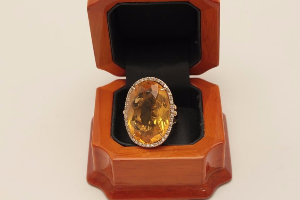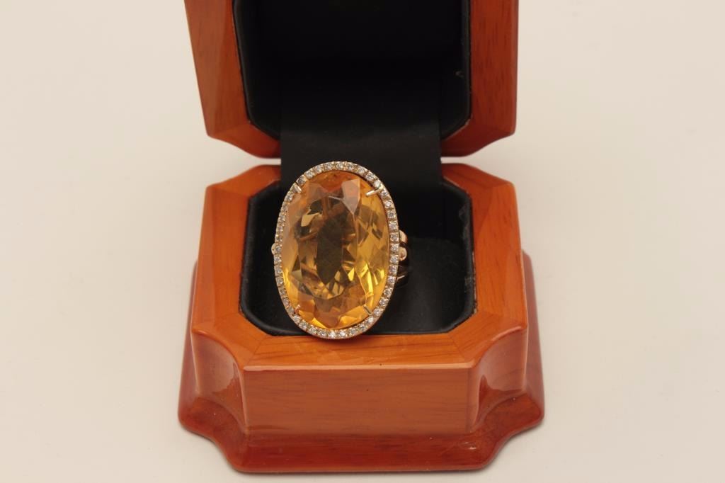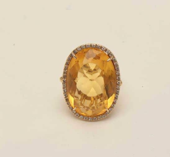 Rare Estate piece 'made in Italy' 14 karat yellow gold ladies designer ring set with vivid yellow Citrine with approx 50 carats and surrounded by round brilliant cut diamonds of G-H colors and VS/SI clarity.Est;1,500-3,000