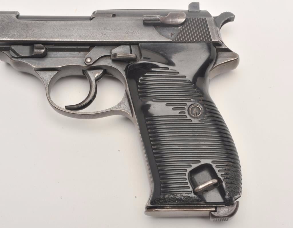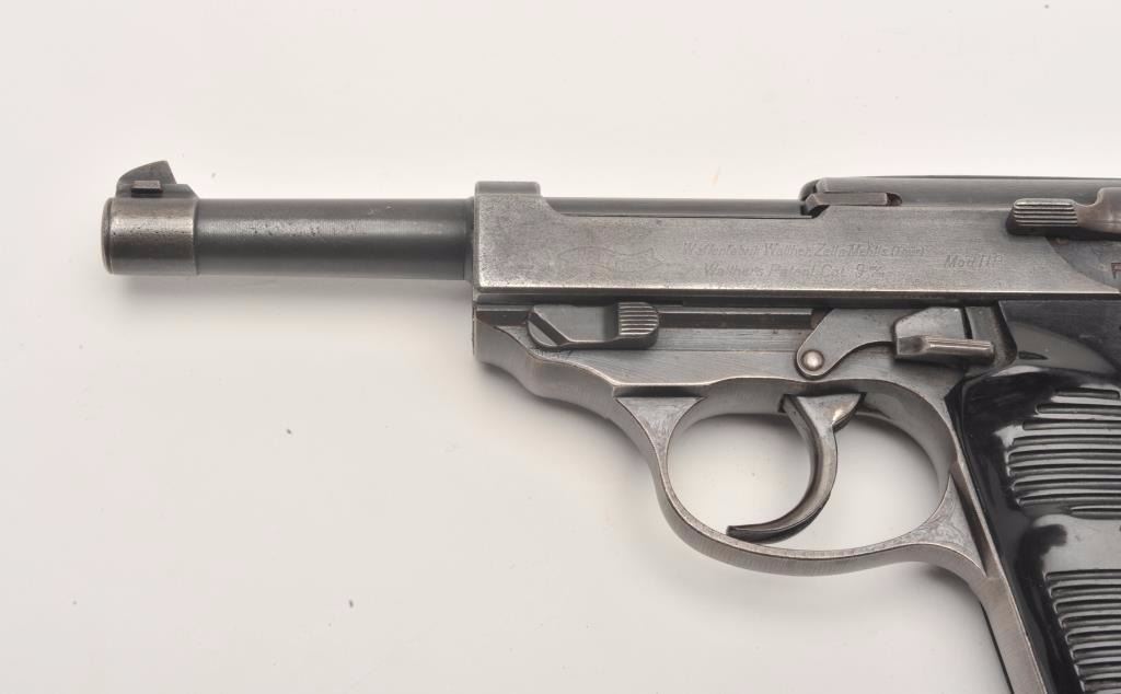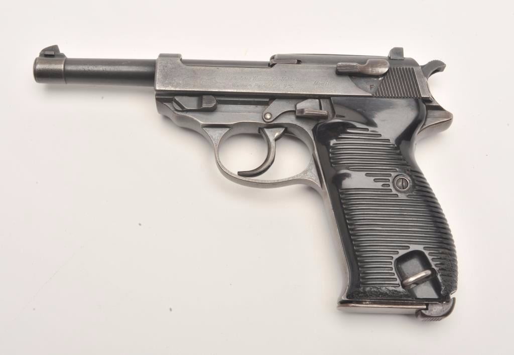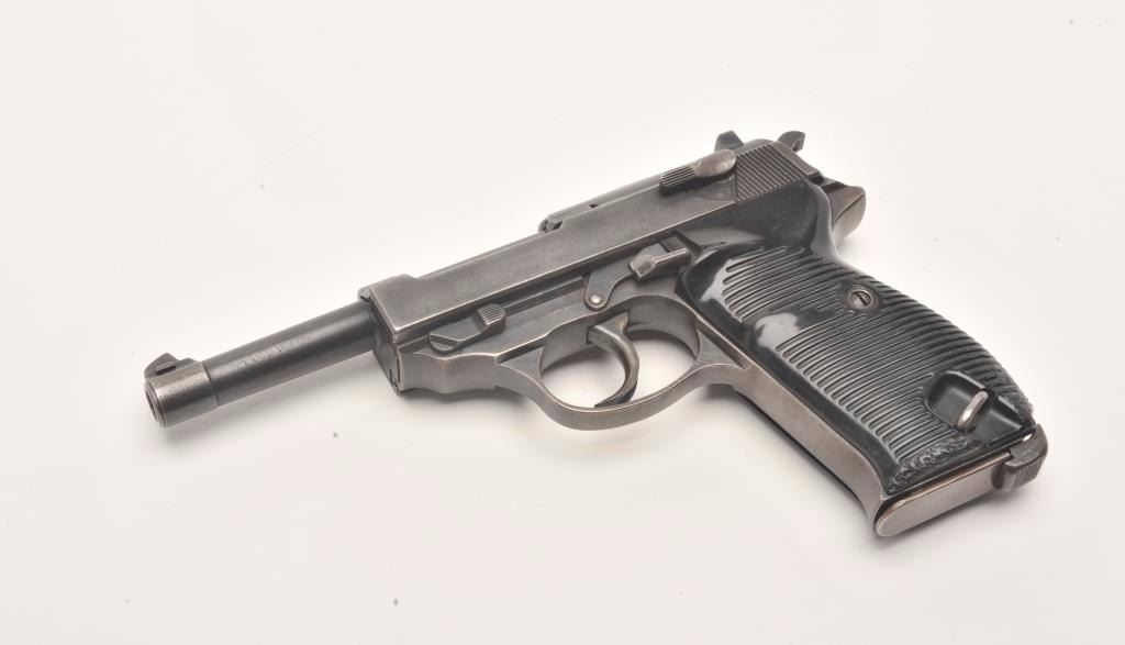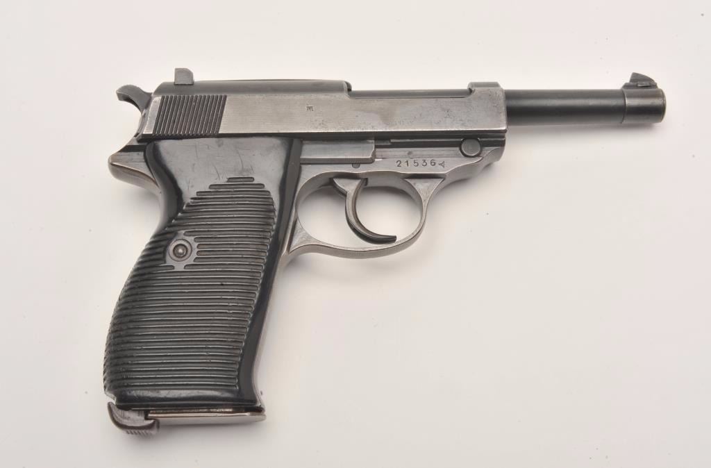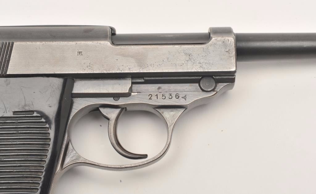 Walther Model HP semi-automatic pistol, nazi proofed, 9mm caliber, 4.75” barrel, military blue finish, black grips, S/N 21536, in overall very good condition displaying the majority of its muted military finish withhigh point wear, near fine bore, crisp action and good markings. The grips show scattered wear and some marring to the butt area of the left grip. (C&R/PPT). Est.: $900-$1,800.