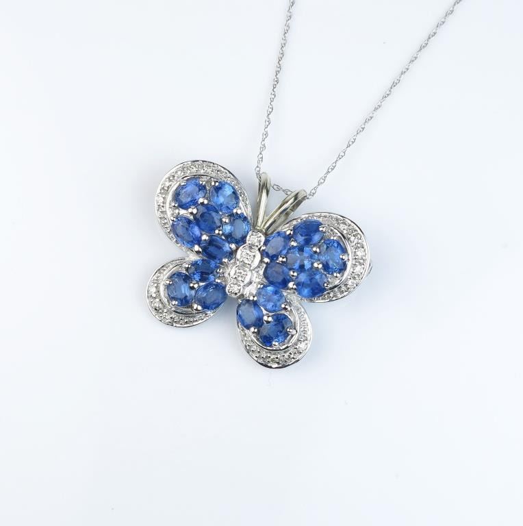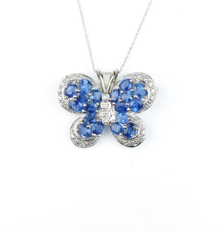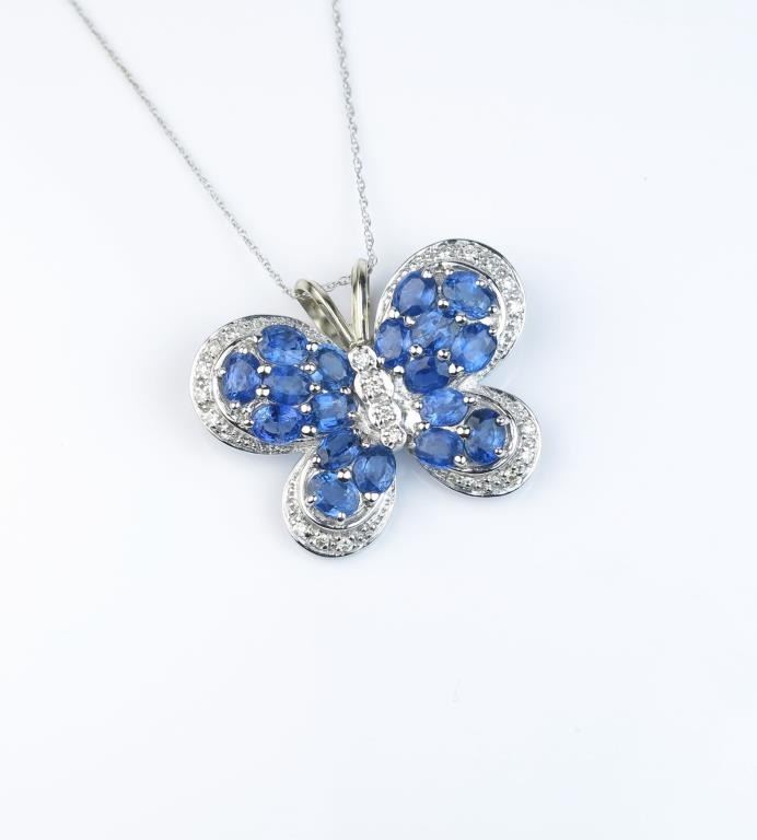 Exquisite designer Butterfly pin/pendant featuring eighteen oval Ceylon sapphires weighing approx. 5.00 carats and pave set with 18 round diamonds of G-H colors and VS clarity all set in an 18 karat white goldcustom made setting. Retail $3,000-$4,000 Estimates $2,000-$3,000 Nice