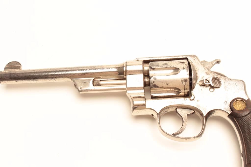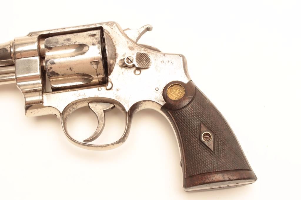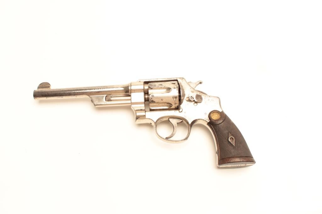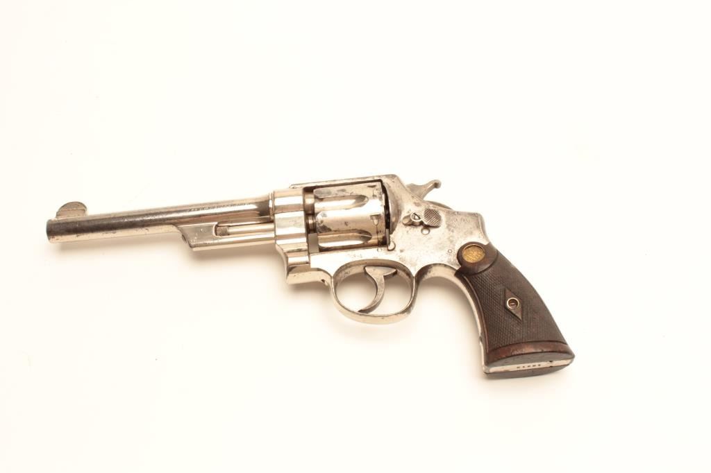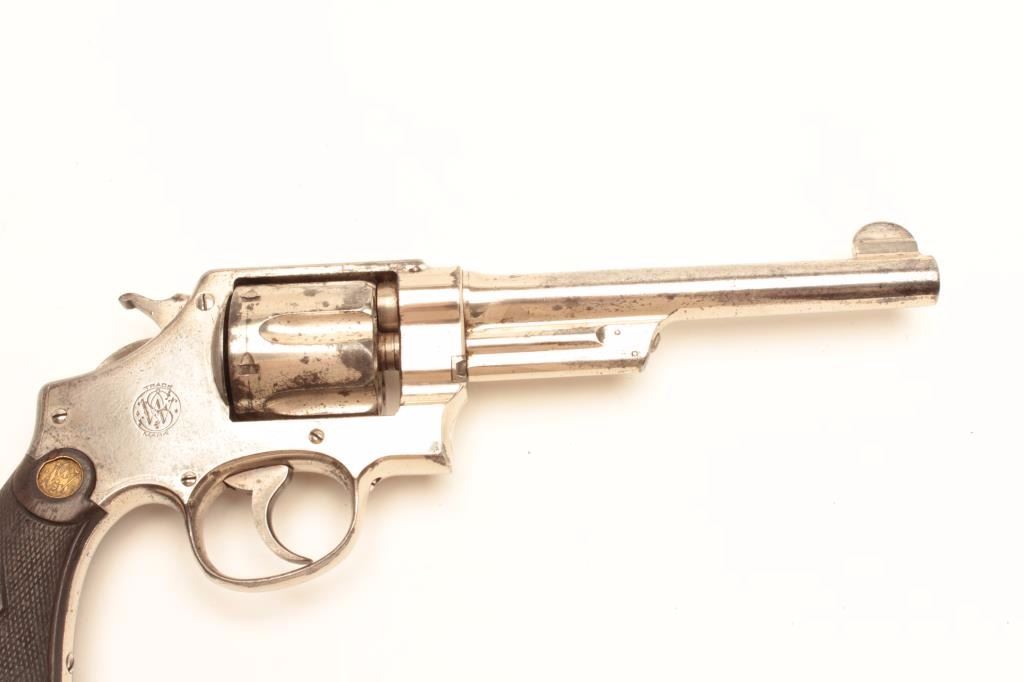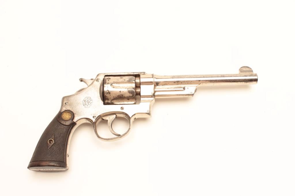 Smith and Wesson 1st Model Hand Ejector revolver, .44 S&W Special caliber, Serial #12212. The pistol is in very good overall condition with a 6 ½” barrel. The pistol retains the majority of its factory nickelfinish with knackering at the rear of the action and some flaking on the cylinder. The checkered wood gold medallion grips are in good condition showing mars, flattening of the checkering and compressions from use.The bore is good, the action is crisp and the markings are sharp. The pistol is accompanied by a Smith and Wesson factory letter indicating the pistol shipped from the factory to Cowdrey Exporters Co., New YorkCity, New York on July 15, 1915 with all features as described. Also known as the .44 New Century Triple Lock, 1st Model Hand Ejectors were introduced in 1908 and manufactured until 1915. From the estate ofLarry Gaertner. Est.: $900-$1,800. (C+R)