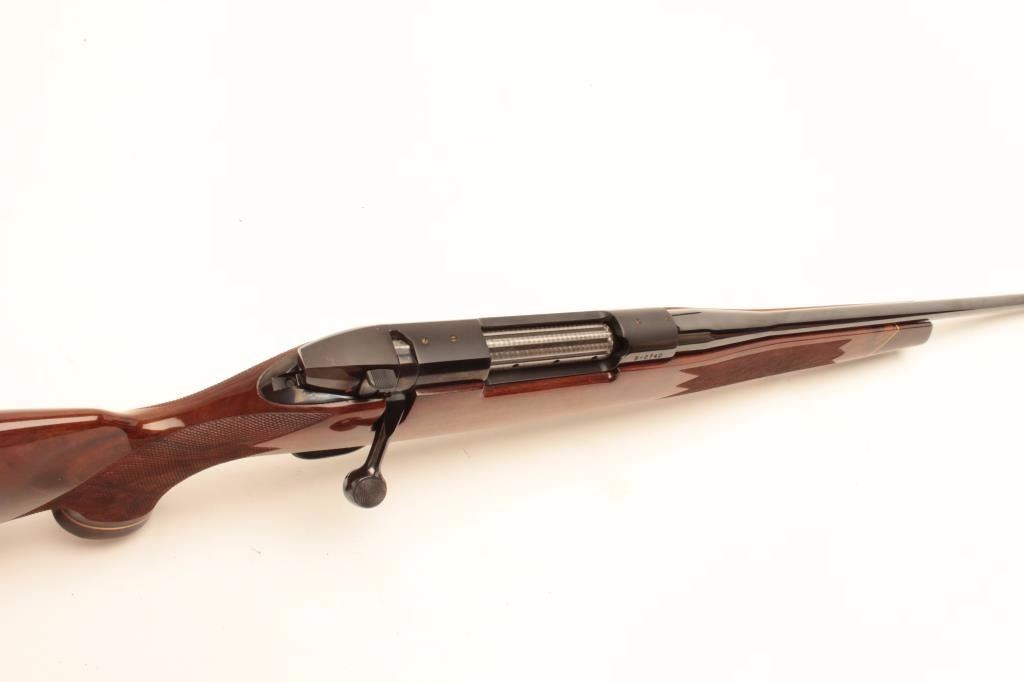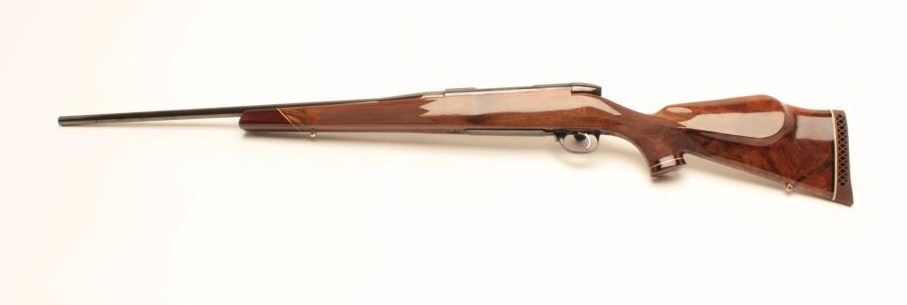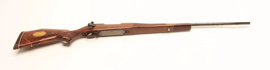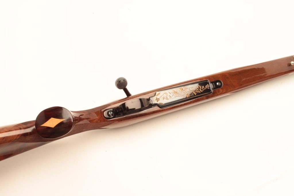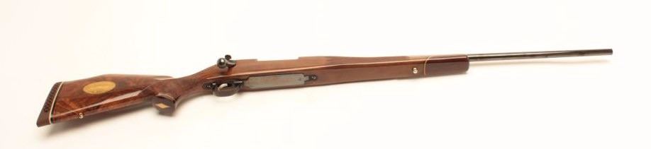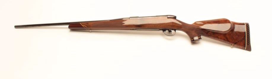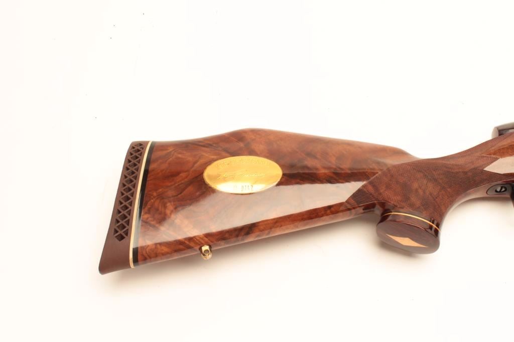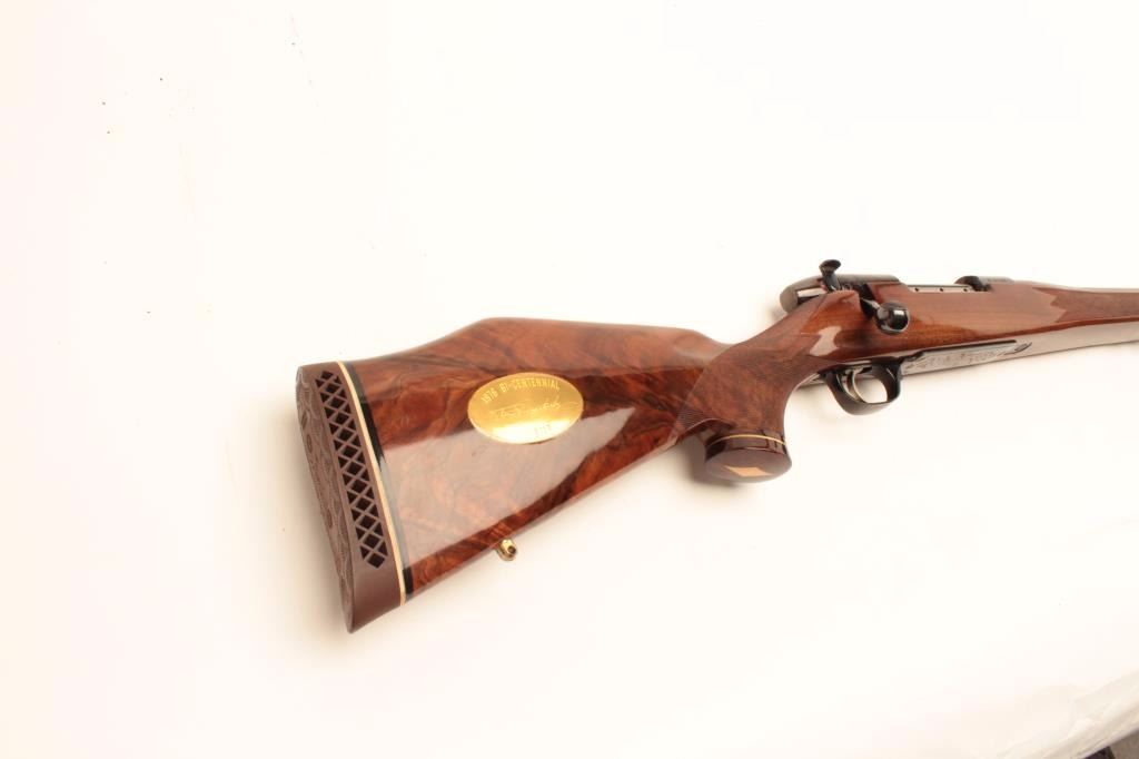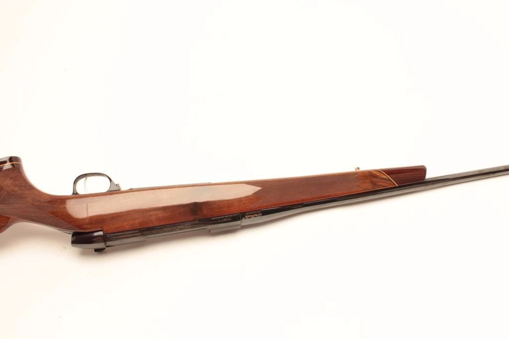 Weatherby Mark V bolt action rifle, 1976 Bi-Centennial edition, S/N B-0742, .300 Magnum caliber, 24.5” barrel, blued finish, deluxe checkered wood stock with Weatherby hard rubber butt pad; in overall excellentcondition showing little use or handling. (Modern/PPT). Est.: $600-$1,200.