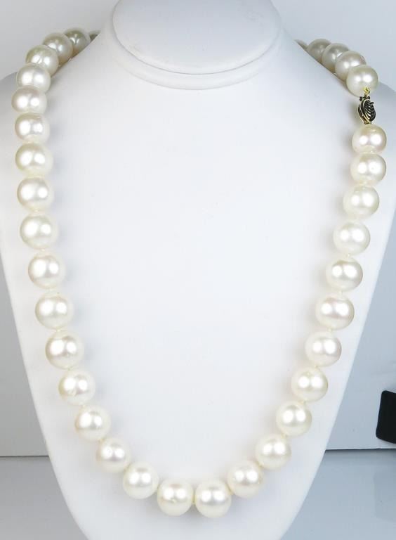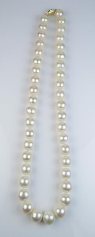 Elegant 18 inch strand of cultured pearls averaging over 10.00 MM in diameters of a light pink luster on a 14 karat yellow gold clasp. Estimates $800-$1,200