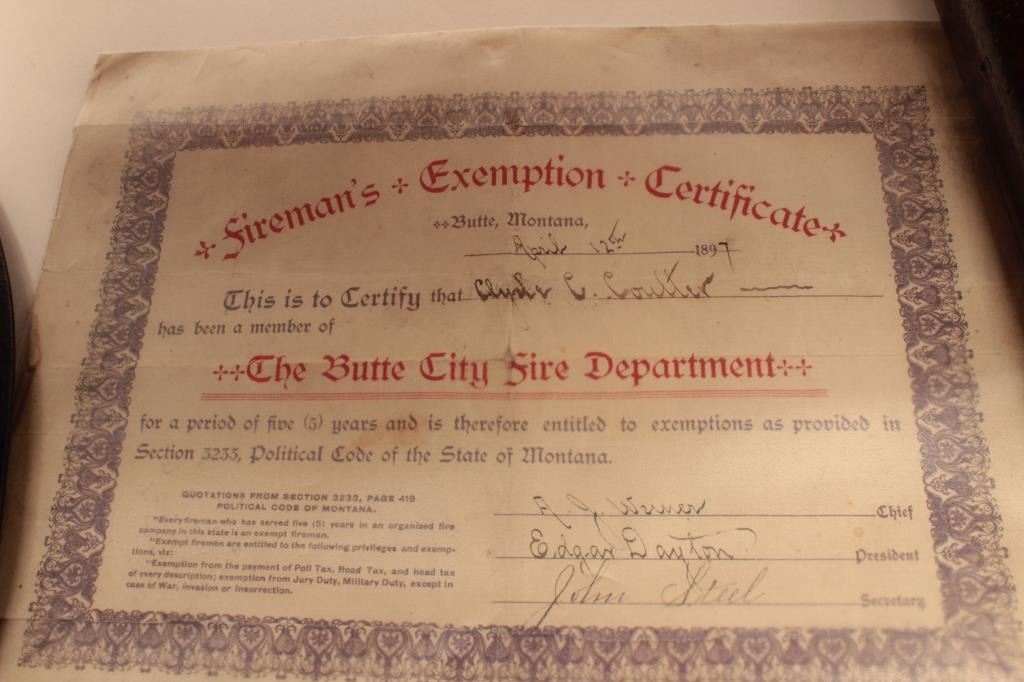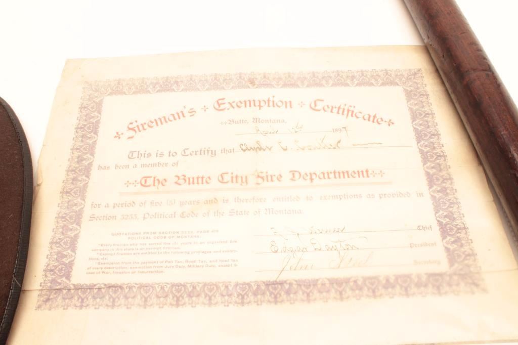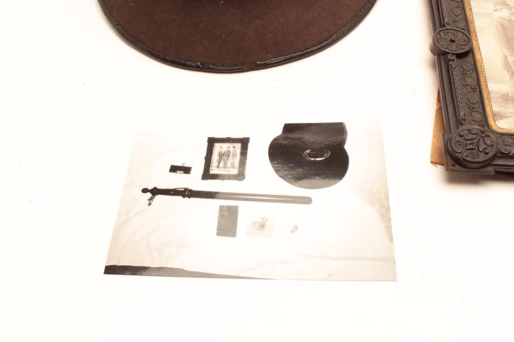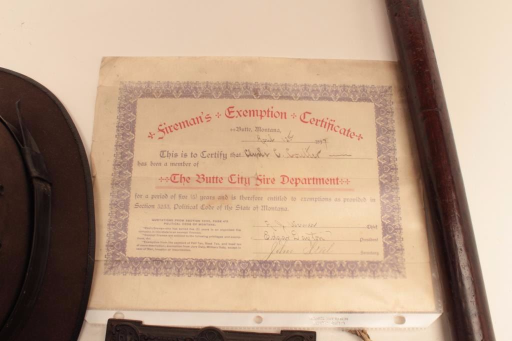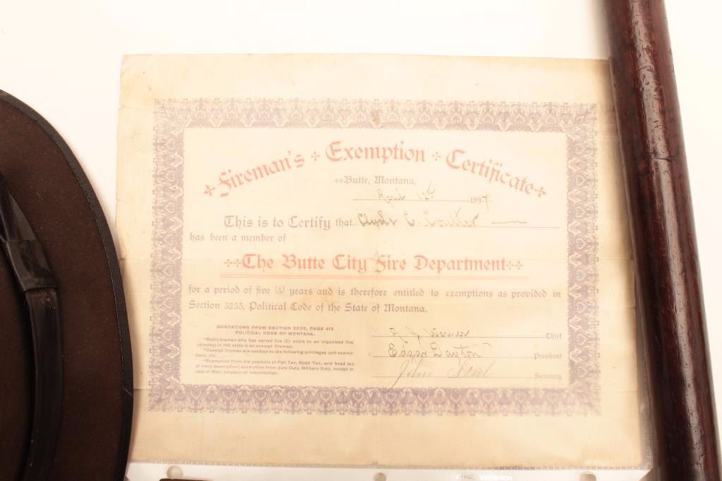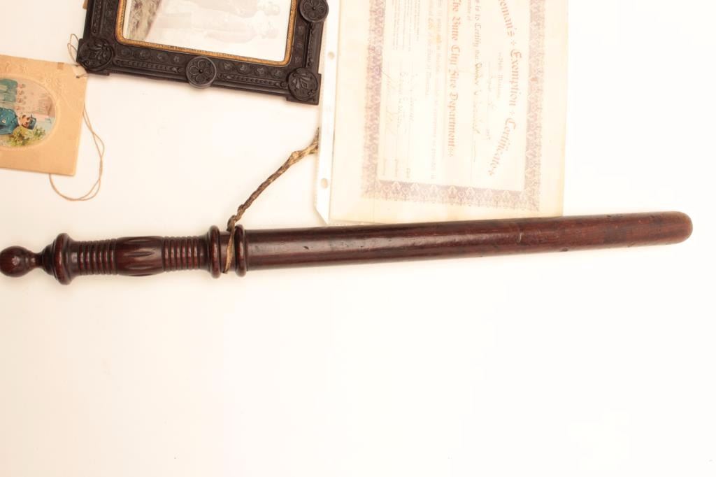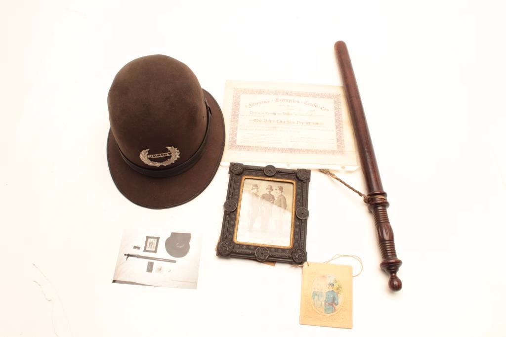 Nineteenth century Policeman’s lot consisting of: 1. Police hat with cap badge, brown felt ca. 1890’s in very good + condition, slight rim loss and minor wear; 2. Night stick turned rosewood or hardwood inscribedin initials “C.C./May 92/No. 14”; 3. Rubber stamp “C. Coulter-Policeman”; 4. Photo of C. Coulter with two other officers possibly in this hat with this night stick; Butte, MT. photographer-marked and in gutta perchaframe; 5. Invitation to Annual Police Ball, Butte MT., Jan. 23, 1896, stamped “C. Coulter”. 6. Fireman’s exemption Certificate dated 1897 Clyde C. Coulter, exempts from taxes, military service, juryduty, except in war; found in Montana with Coulter’s descendants. Est.: $400-$800.