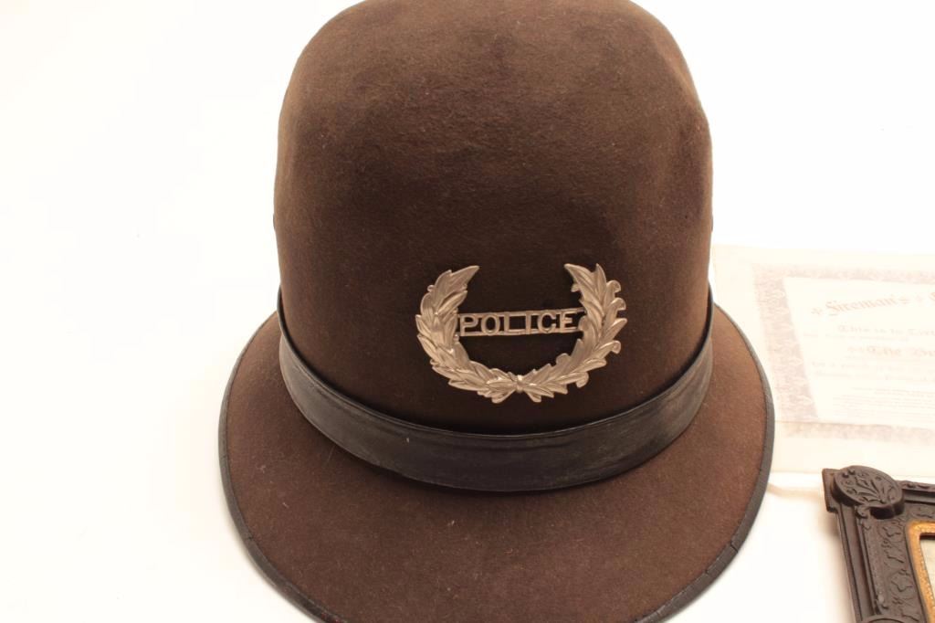 Lot 283 Nineteenth century Policeman’s lot consisting of: 1. Police hat with cap badge, brown felt ca. 18