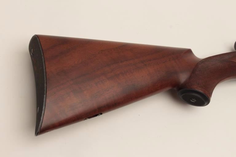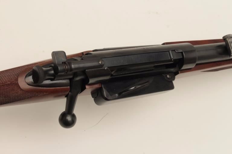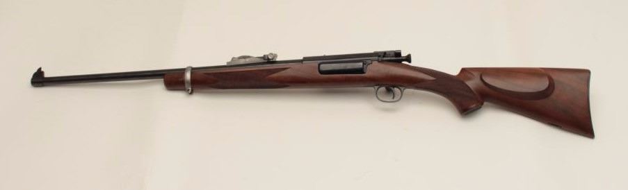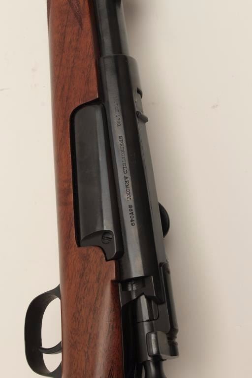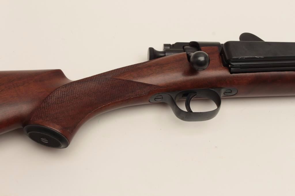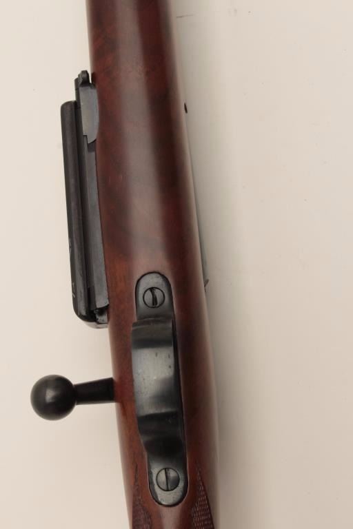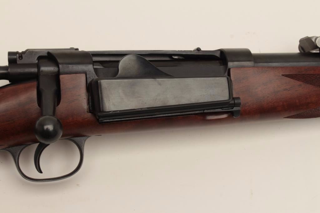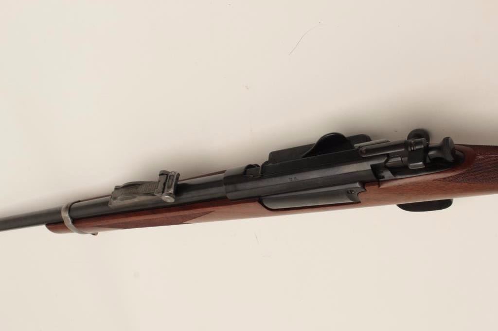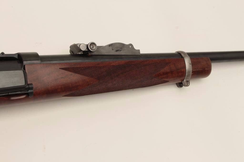 Fine early Sporter using a Model 1898 Krag barreled action, milled steel butt plate and grip cap; long pistol grip, fine wood, crisp checkering, very good quality. (C&R). Est.: $500-$1,000.