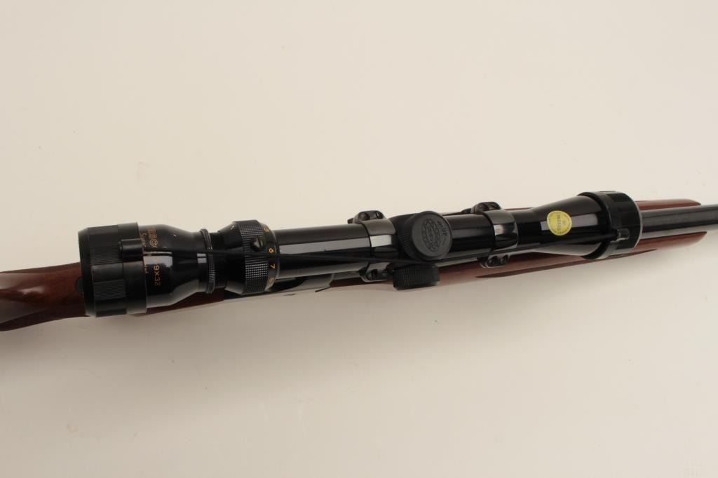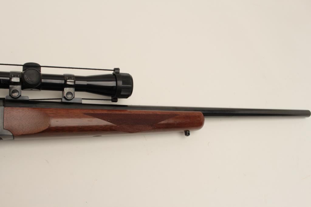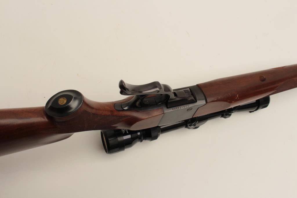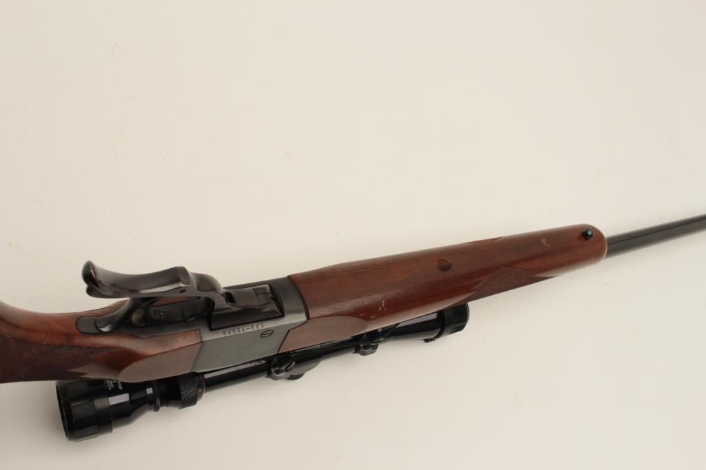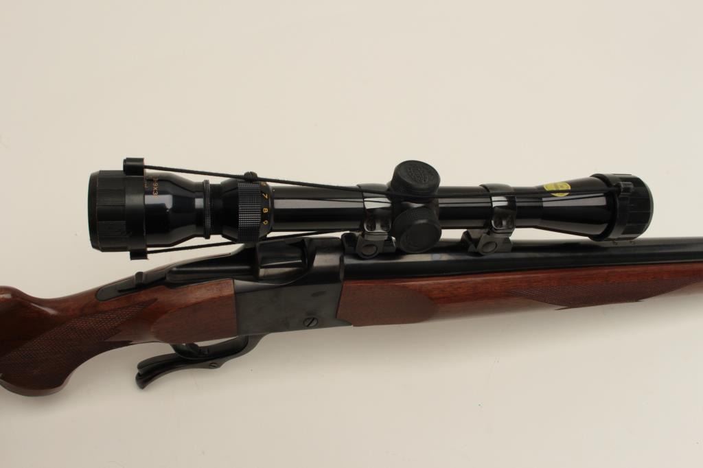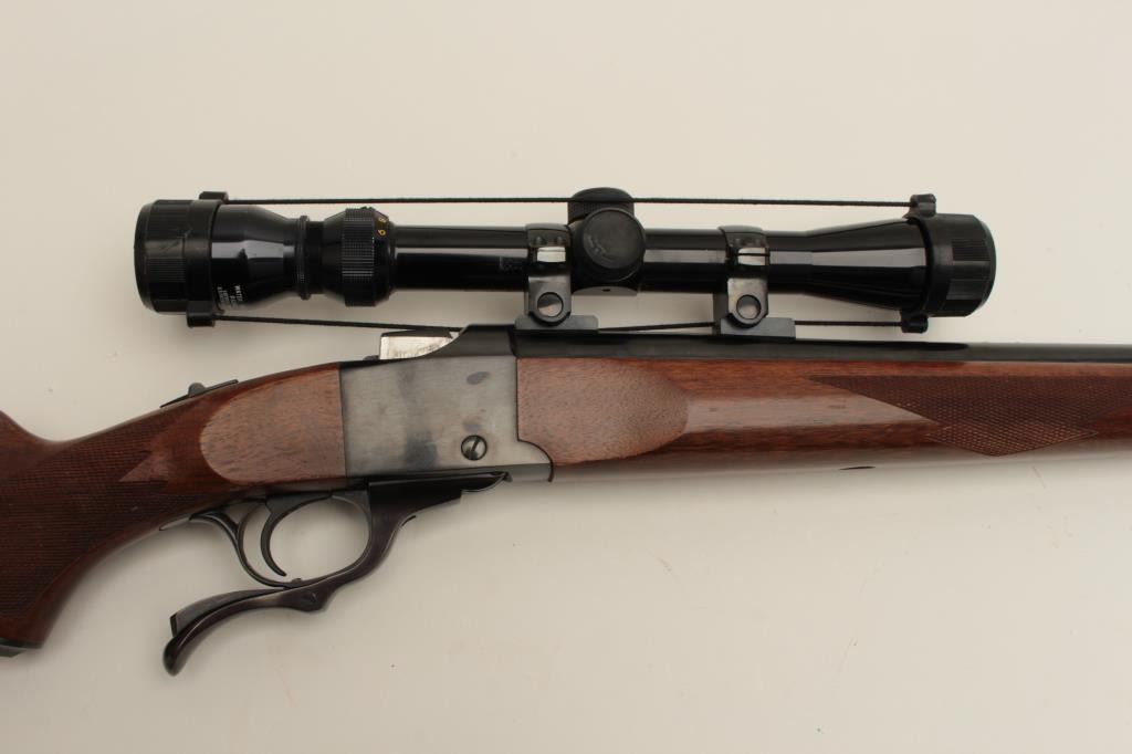 Ruger No. 1 single shot rifle, .220 Swift caliber, 26” round barrel, blued finish, checkered wood stocks, S/N 132-12579, mounted with a Tasco 3-9x32 scope with fine optics, in overall very good to fine condition with a fine bore, crisp action, sharp markings and very good to near fine wood stock. (Modern/No PPT). Est.: $500-$1,000.