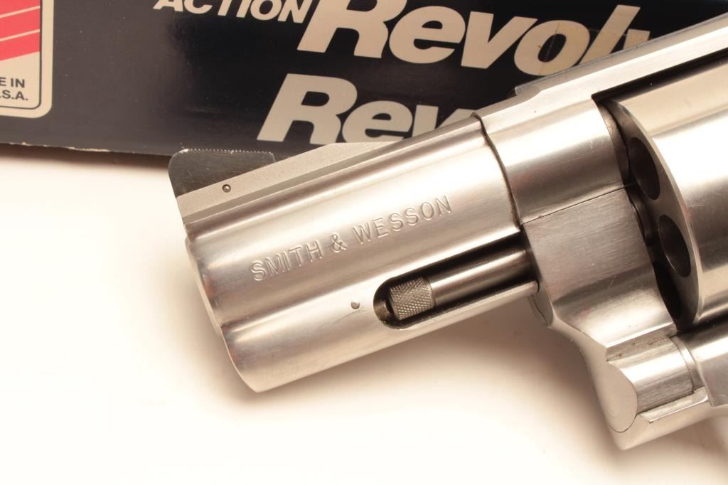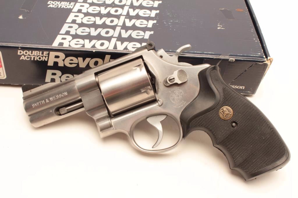 Smith & Wesson Model 629-2 DA revolver, .44 Magnum caliber, 3” barrel, stainless, checkered Pachmayr hard rubber grips, S/N BEE3120, with factory cardboard box numbered to this gun and including instructionsmanual; in overall fine condition showing minimal use. (Modern/PPT). Est.: $450-$900.