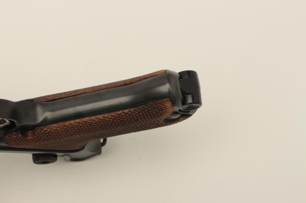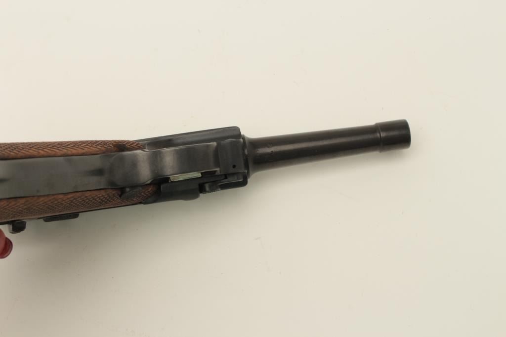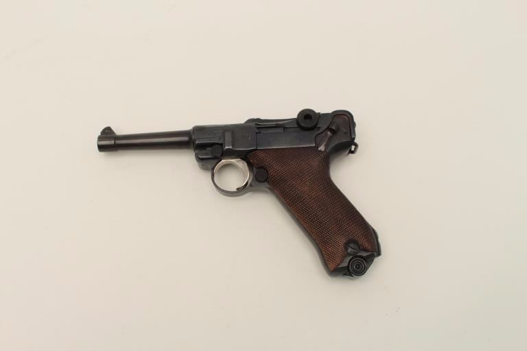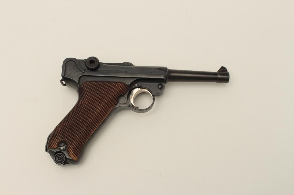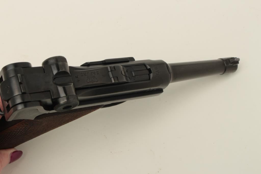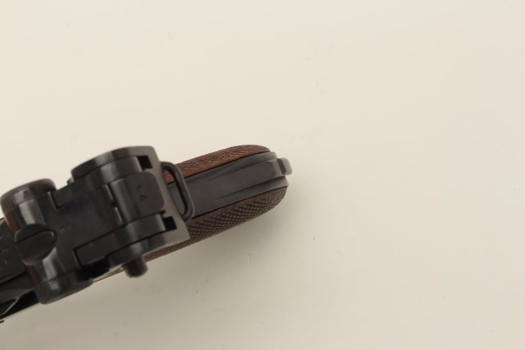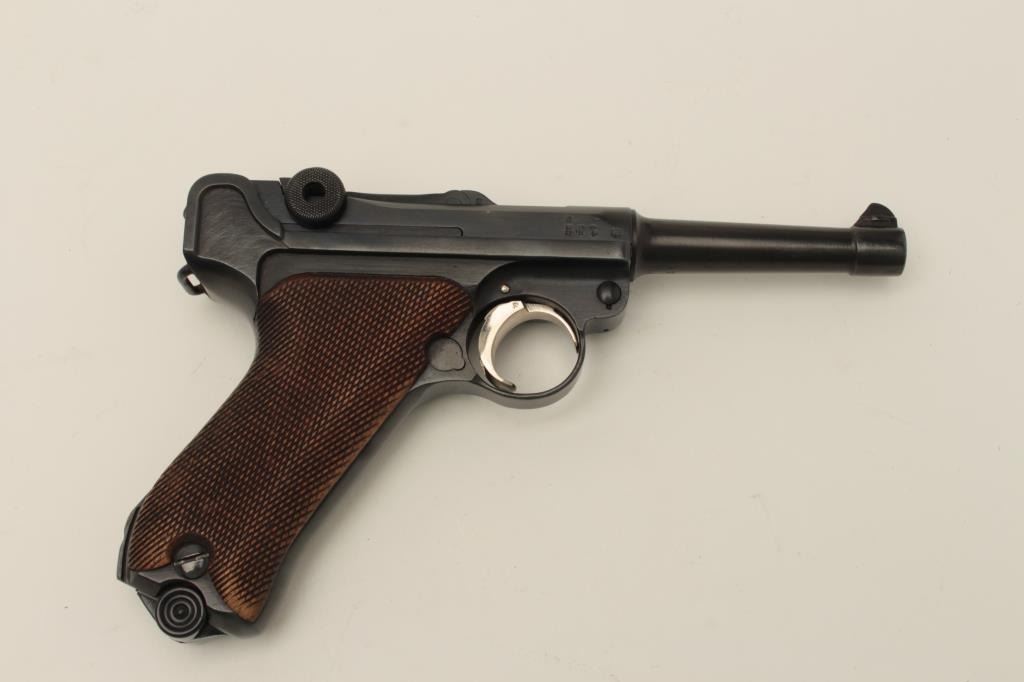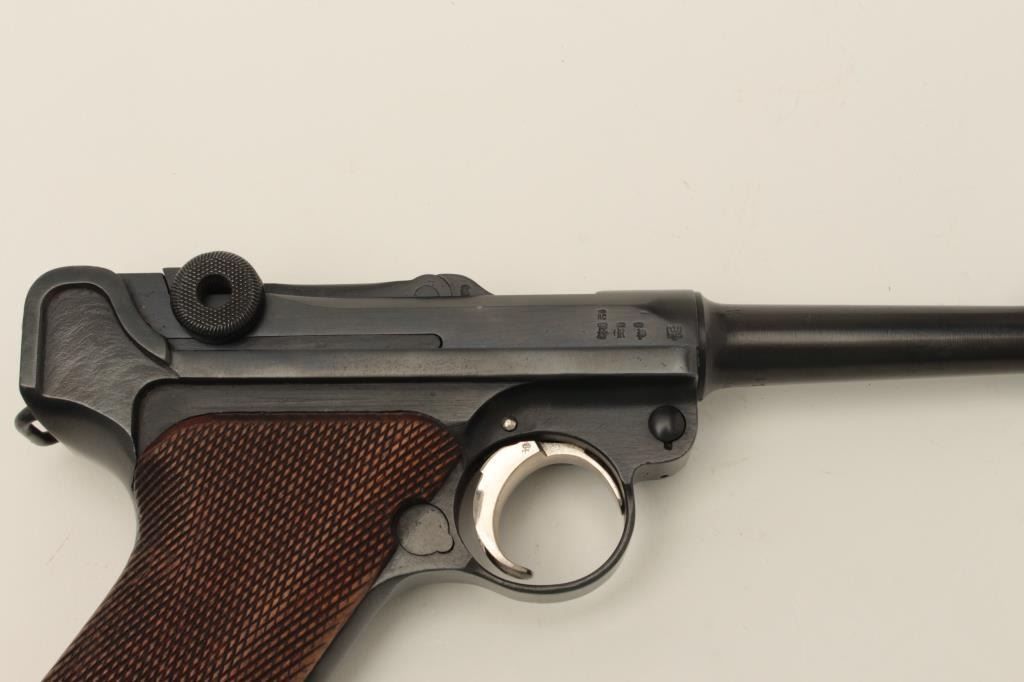Lot 306 Erfurt 1917 Luger semi-automatic pistol, 9mm caliber, 4” barrel, blued finish, checkered wood grip