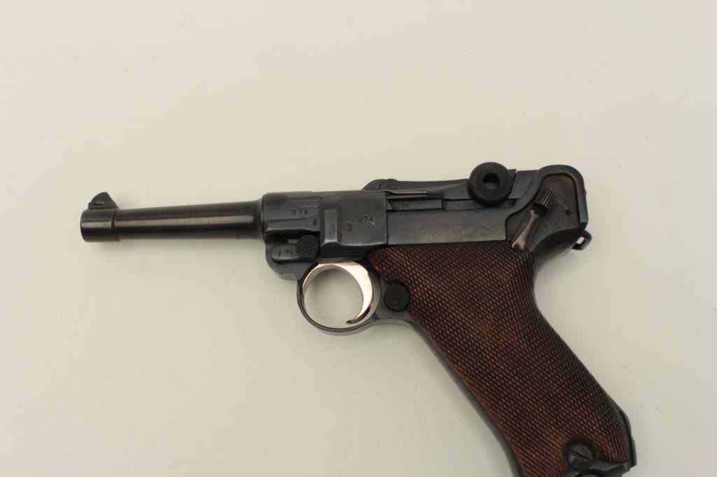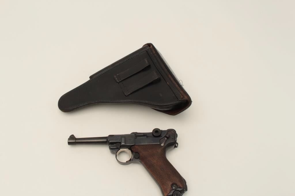 Erfurt 1917 Luger semi-automatic pistol, 9mm caliber, 4” barrel, blued finish, checkered wood grips, S/N 874n, all visible #s matching (except un-numbered magazine); with leather flap holster and extra magazine #3755. Thisgun is in overall good condition displaying the majority of its blued old refinish (trigger has been nickel plated), sharp markings and proofs, crisp action, very good bore, good grips and overall good leatherflap holster (no markings visible on back of holster). (C&R/PPT). Est.: $500-$1,000.