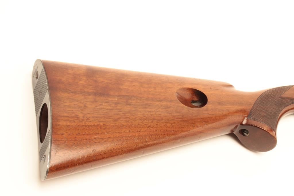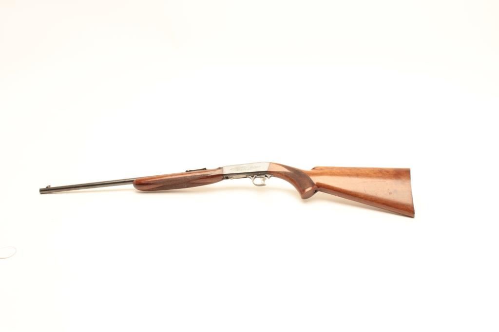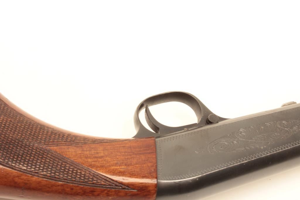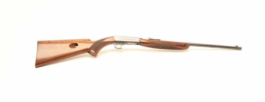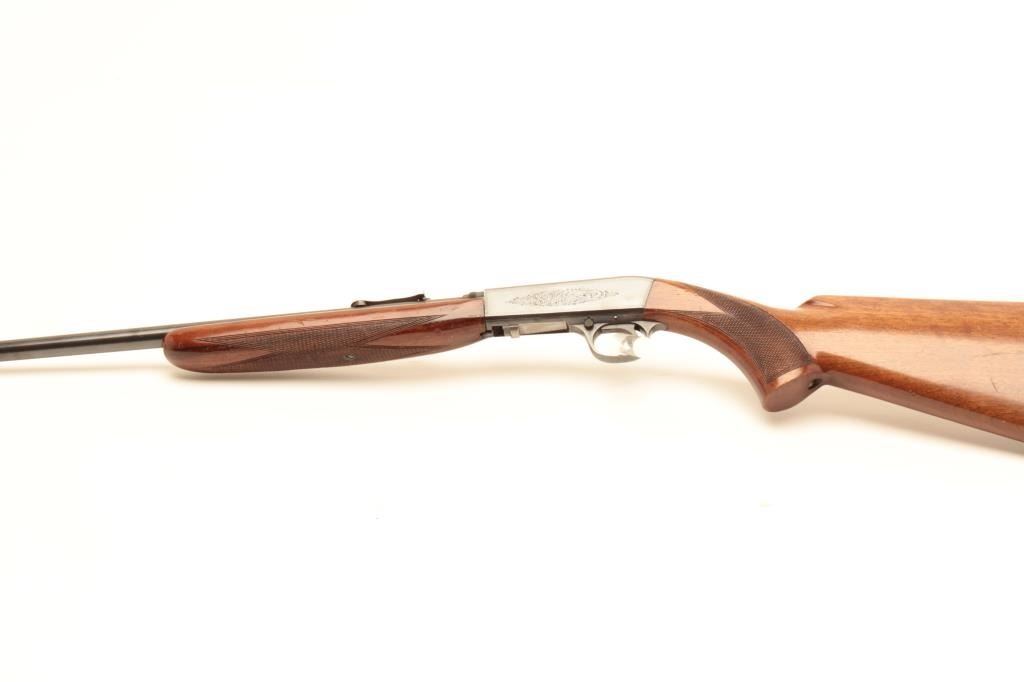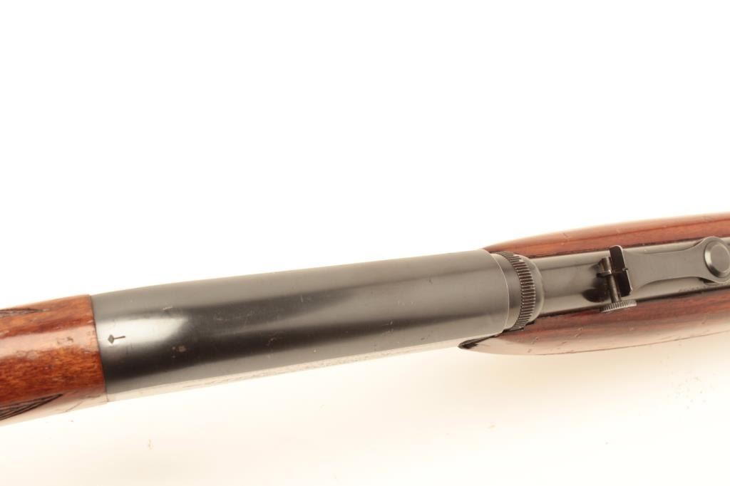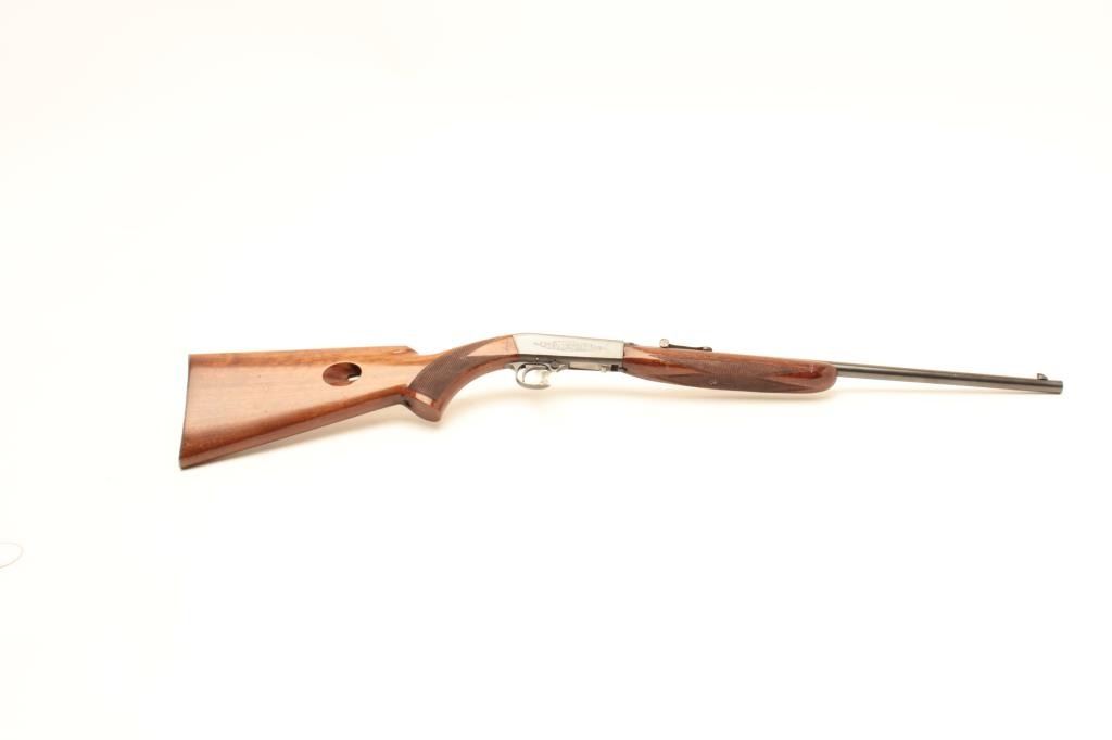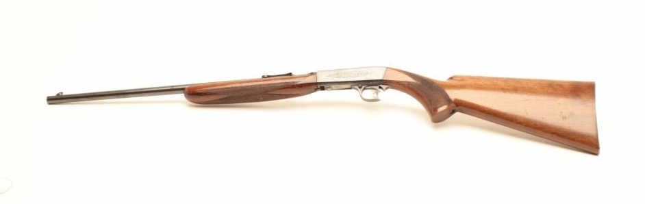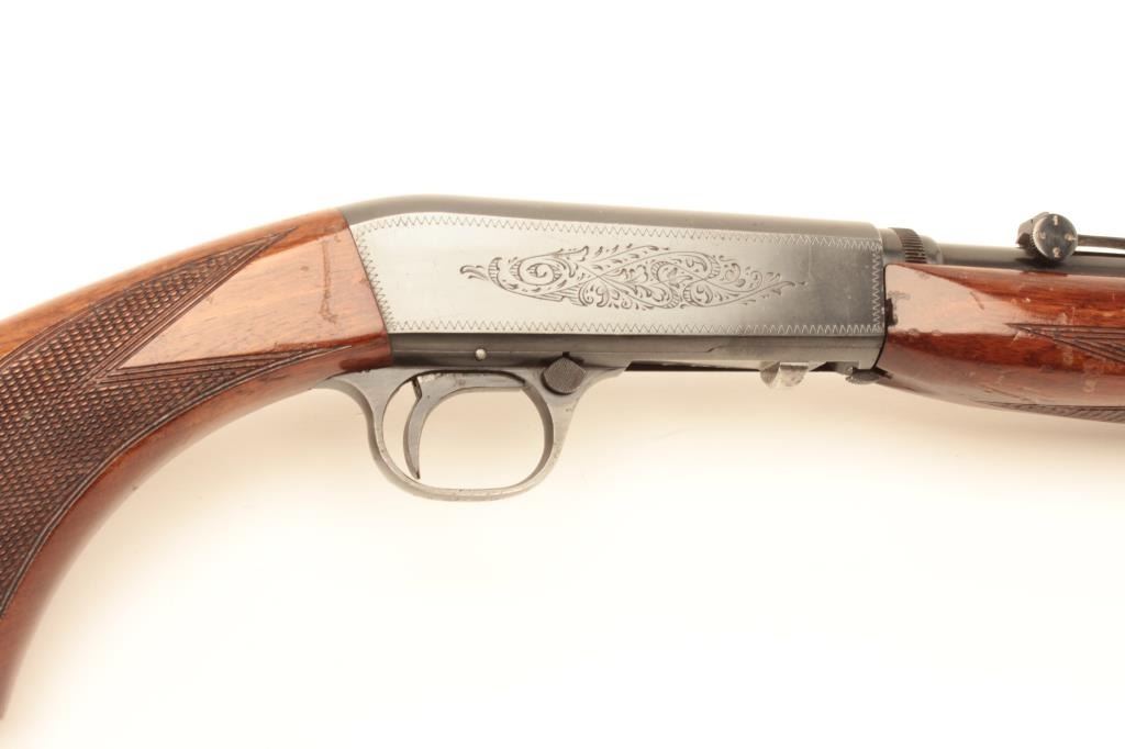 Belgian-made Browning takedown semi-automatic rifle, .22LR caliber, 19” barrel, blued finish, checkered wood stocks, S/N 6760, early “wheel” rear sight, in overall very good to fine condition with the majority ofits original finish to metal surfaces, very good to fine bore, crisp action, very good markings and stocks that show scattered mars and scratches from storage. (Modern/No PPT). Est.: $400-$800.