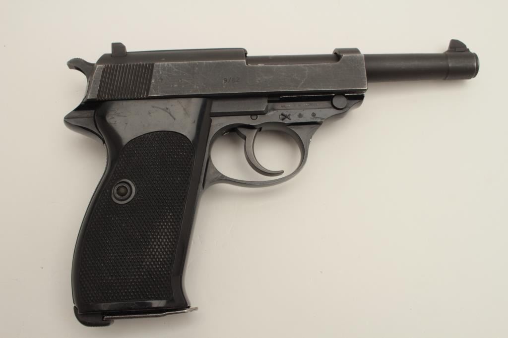 Walther Model P-1 DA semi-automatic pistol, 9mm caliber, 5” barrel, mat black finish, checkered black grips, S/N 184789, 9/62 dated, import marked; in overall very good condition with a very good bore, crispaction, sharp markings and very good grips. (C&R/PPT). Est.: $300-$600.