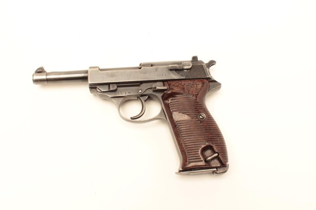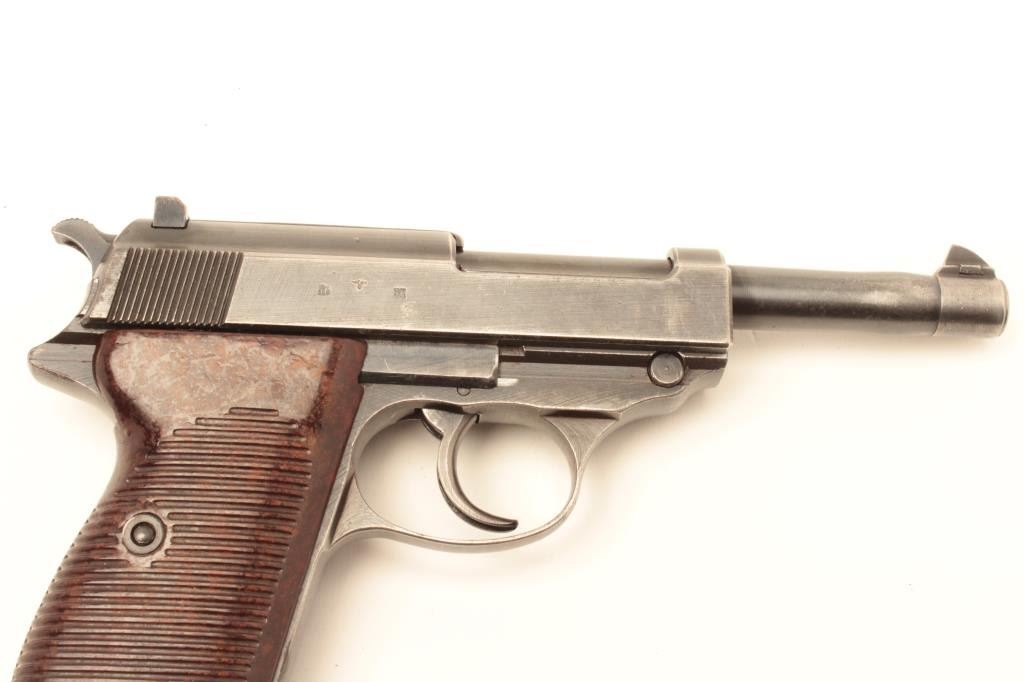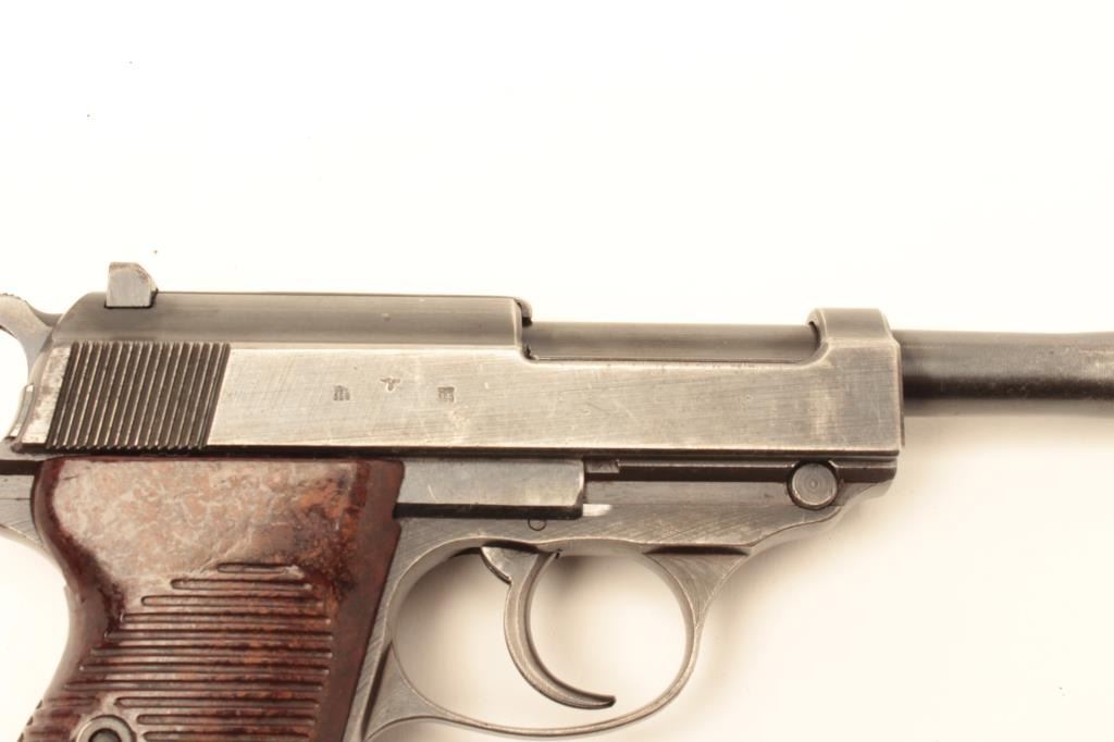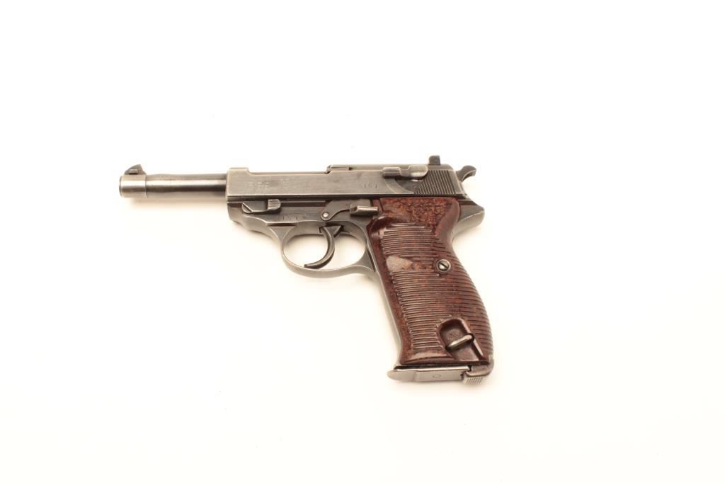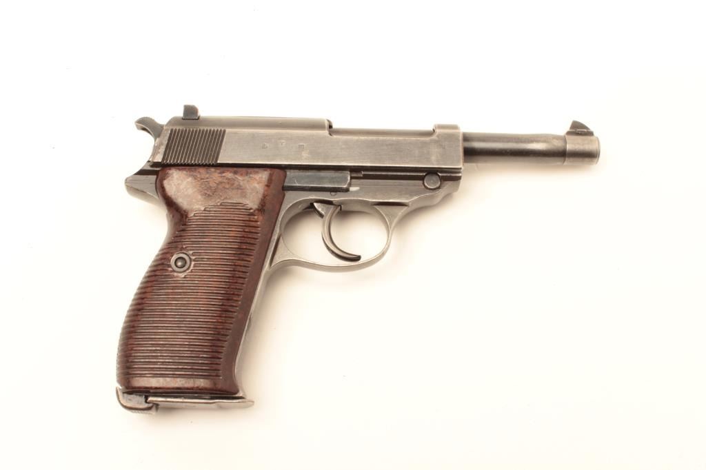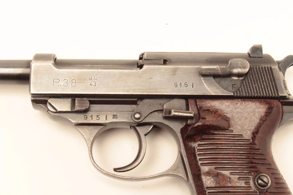 Walther Model P-38 DA semi-automatic pistol, 9mm caliber, 5” barrel that is bulged near the muzzle, blued finish, brown grips, S/N 915 I, ac 43 dated; working action, good markings, good grips; DO NOT FIRE givenbarrel bulge. (C&R/PPT). Est.: $300-$600.