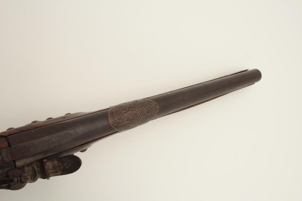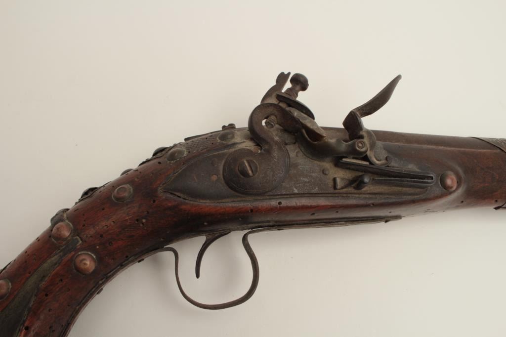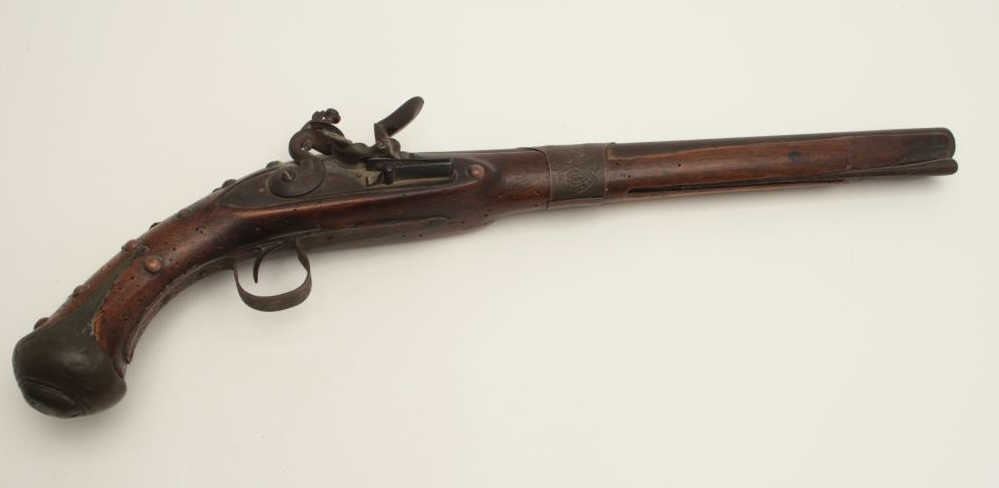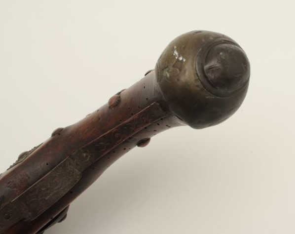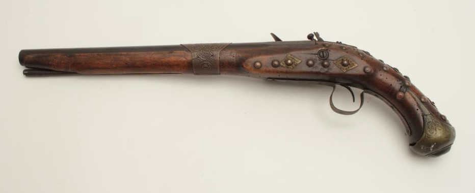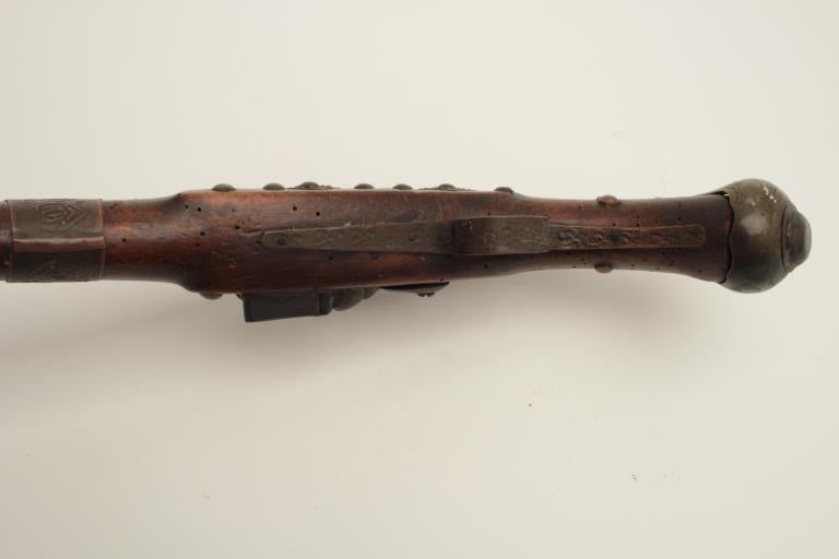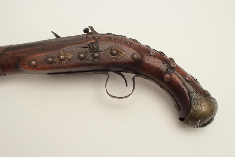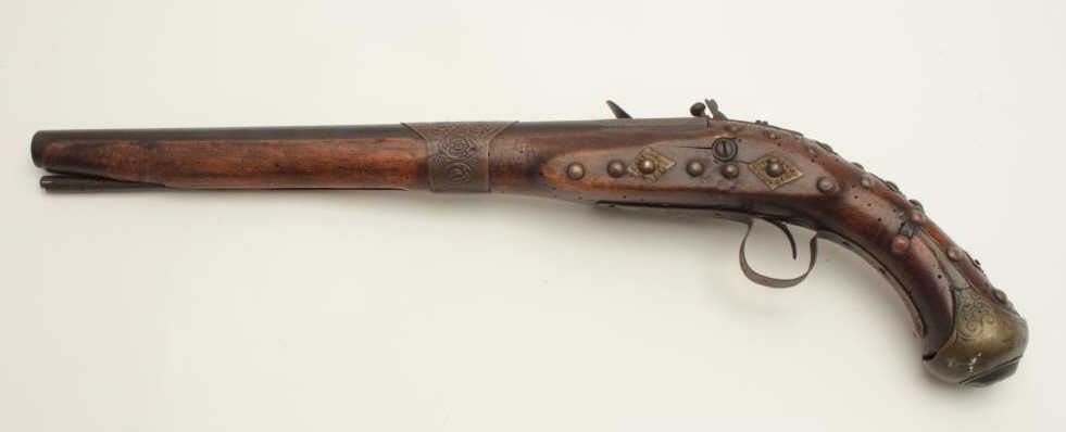 Lot 330 Mid-Eastern flintlock trade pistol, .70 caliber, 14” barrel, wood stock, brass tacked and decorate