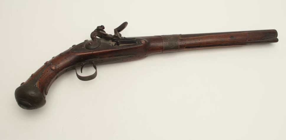 Mid-Eastern flintlock trade pistol, .70 caliber, 14” barrel, wood stock, brass tacked and decorated, un-cleaned with dark patina to metal surfaces, working action, wood stock shows wear, some old edge losses andscattered worm holes. (Antique). Est.: $300-$600.