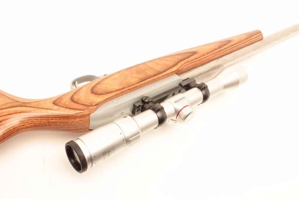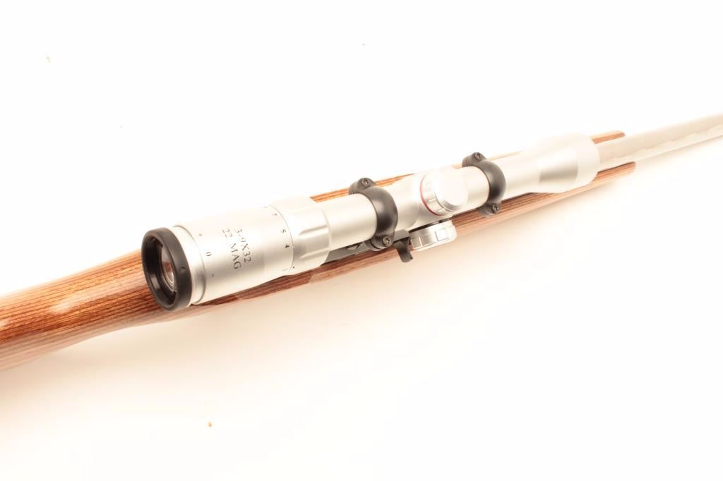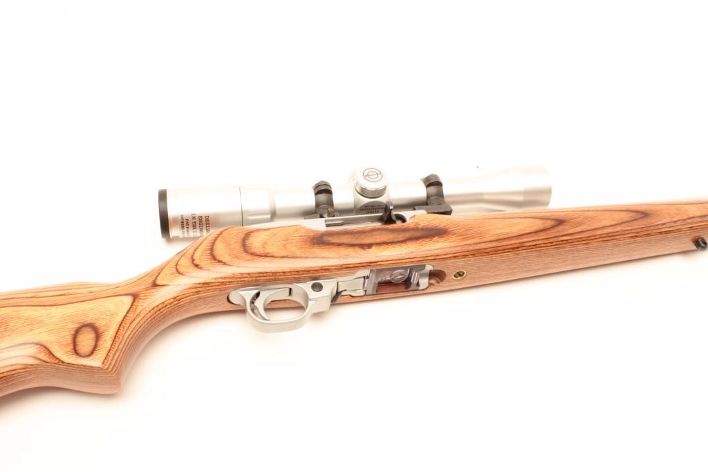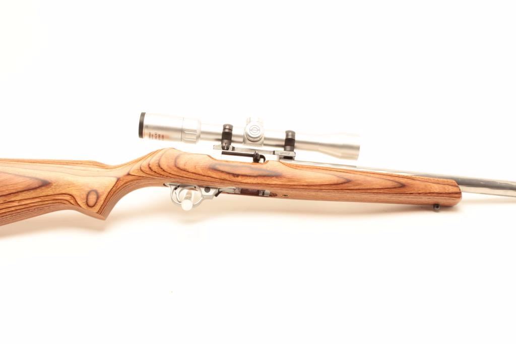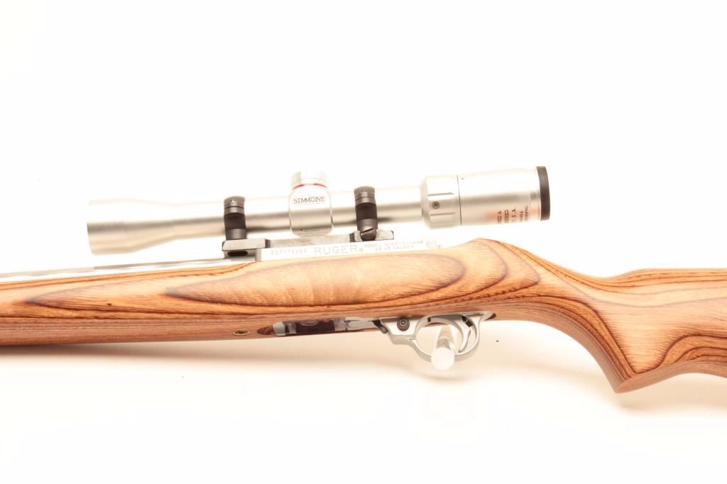 Ruger Model 10/22 semi-automatic carbine, .22LR caliber, 20” Ruger Hammer Forged bull barrel, wood stock, S/N 257-73953, mounted with a Simmons 3-9X32 scope with fine optics; in overall fine condition with fine bore,action, markings and stock. (Modern/No PPT). Est.: $300-$600.