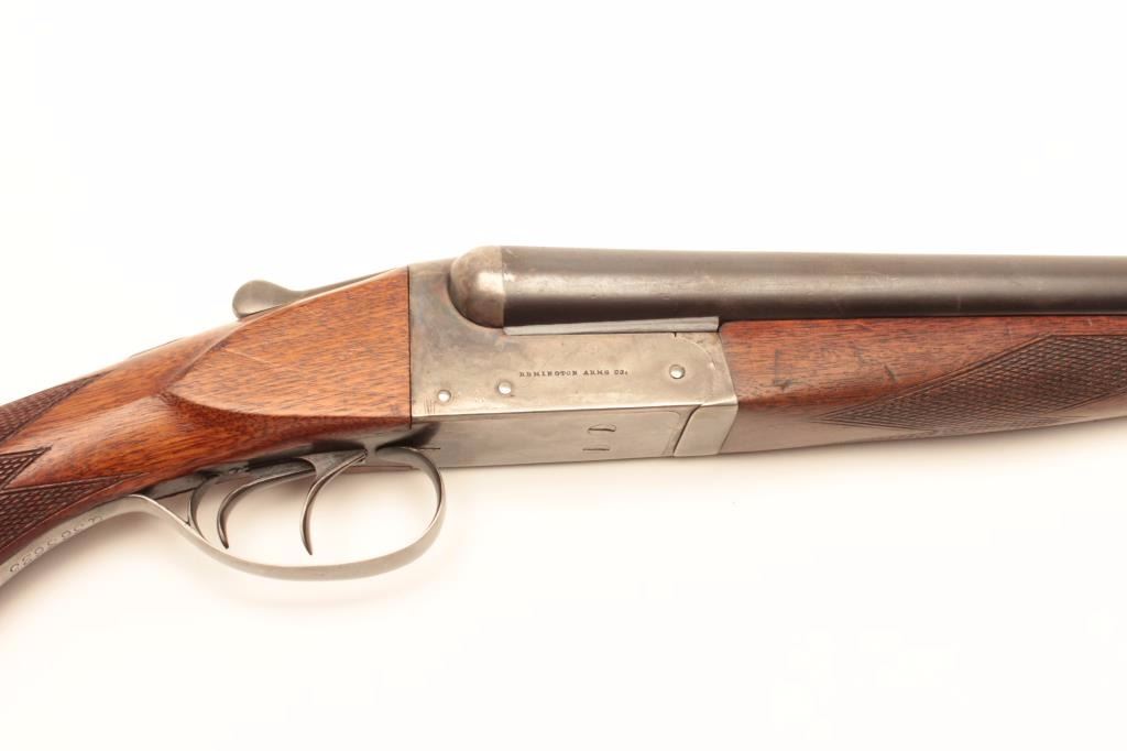 Remington SxS hammerless shotgun, 12 gauge, 28” barrels, blued and case hardened finish, checkered wood stocks, S/N Q363625, in overall very good to near fine condition showing the majority of its muted originalblue to the barrels and traces of original case colors on the receiver; very good to fine bores, very good wood stocks. (C&R/No PPT). Est.: $400-$800.