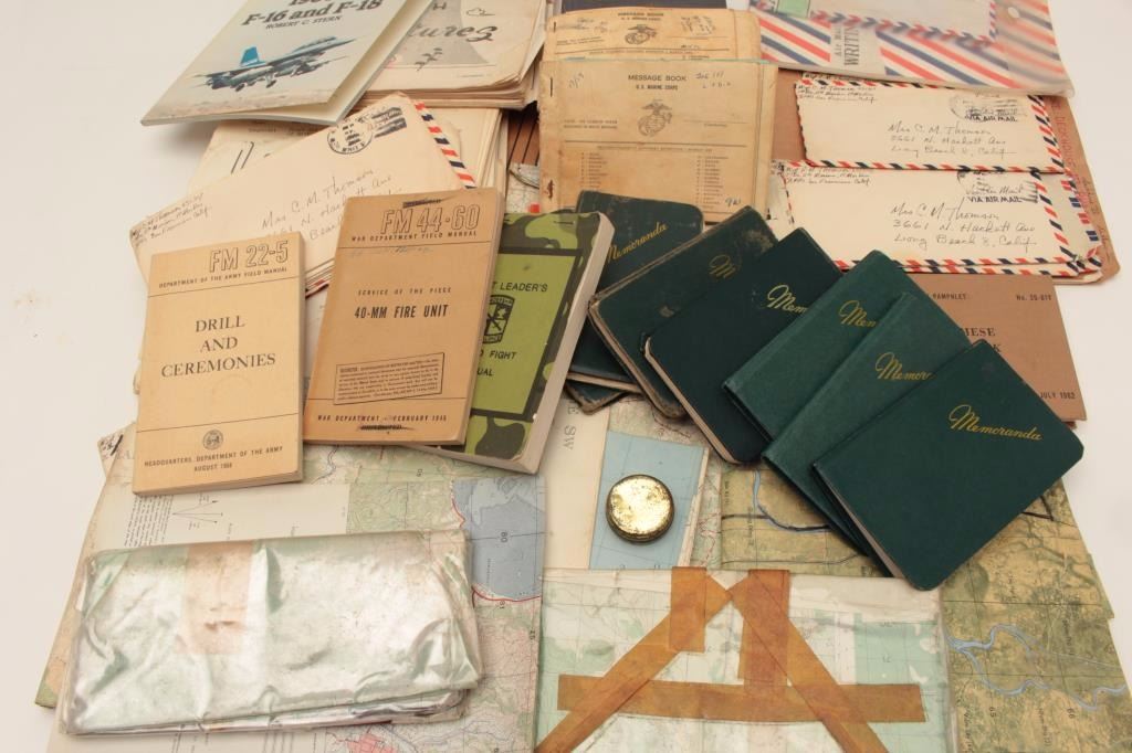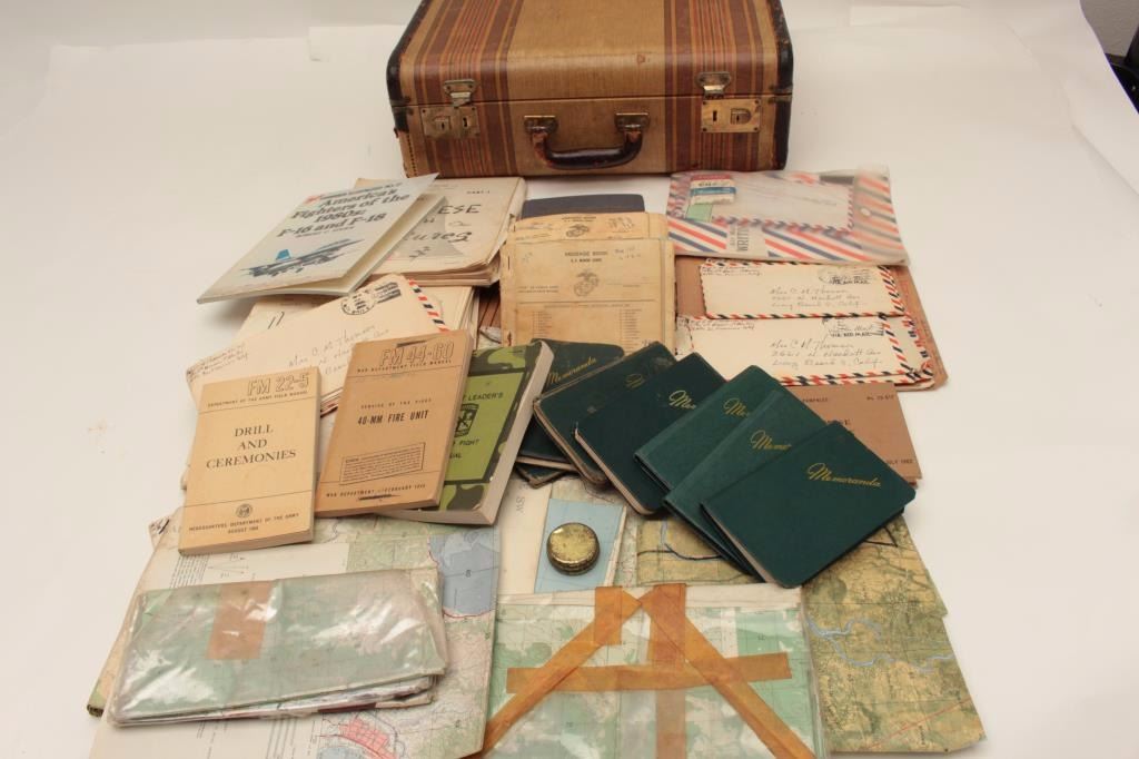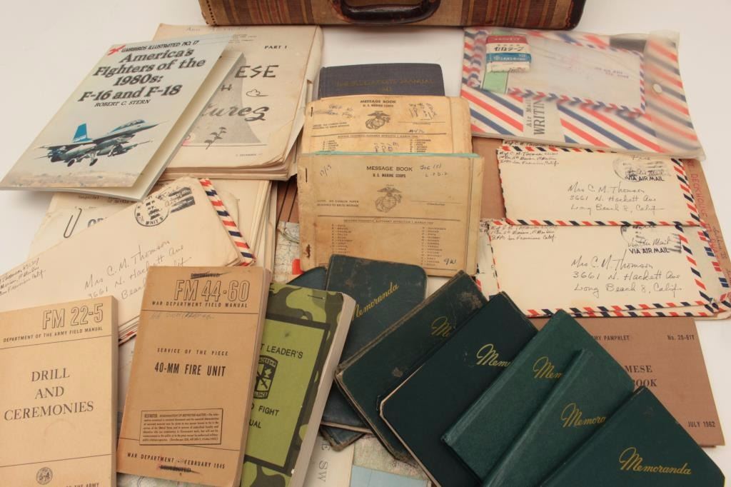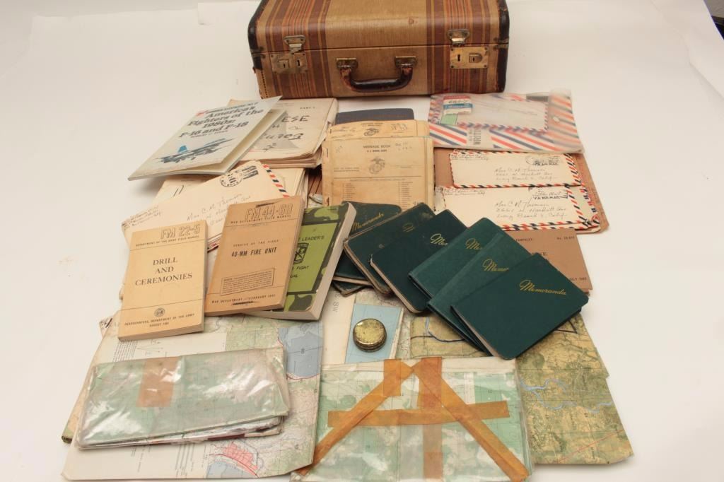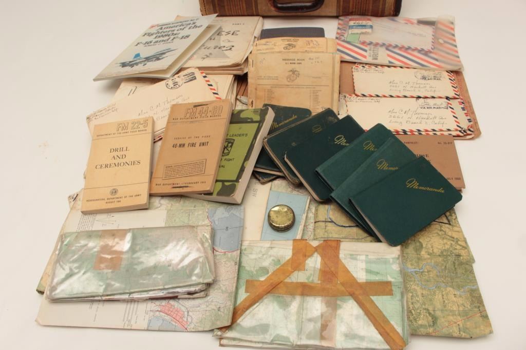 Old valise full of effects and military ephemera belonging to Master Sergeant Charles M. Thomson, USMC; born 1925, served from WW II to Vietnam; 5 pocket journals full of interesting recordings from Oceanside toVietnam; mentions snipers, small maps, locations in 1966 during combat while Sgt. Major; moves, boobie traps, burning villages; mostly 26th Marines; in-theater Vietnam maps, personal letters, after action reports, 2 aerial photos, various manuals, personal letters, etc.; served Co. D, 1st BN, 26th Marines, 5th Division in Vietnam, 1966. Est.: $400-$800.