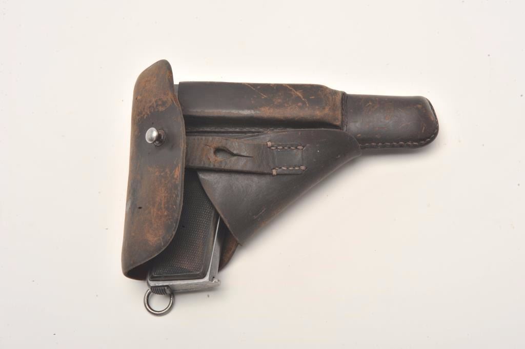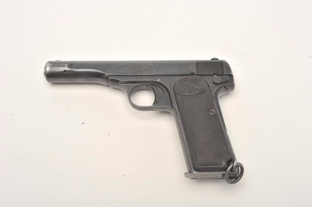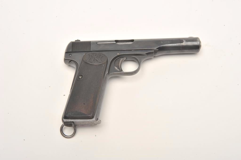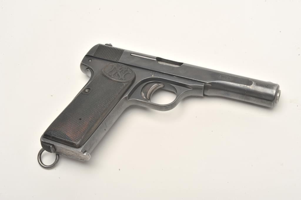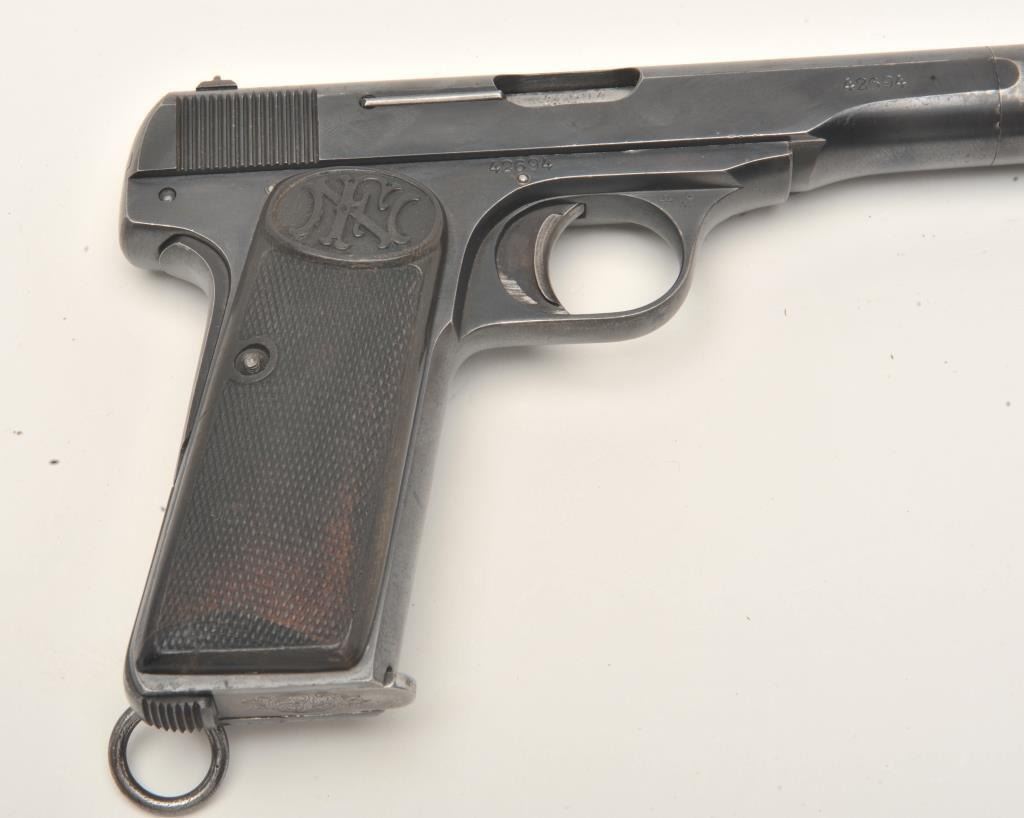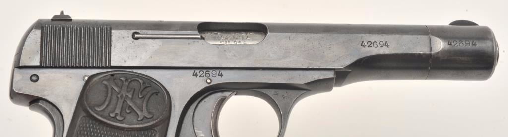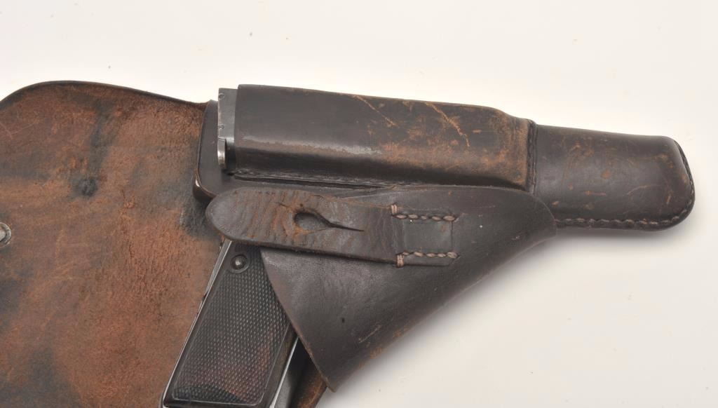 FN semi-automatic pistol, 9mm caliber, 4.5” barrel, blued finish, checkered hard rubber grips, S/N 42694, with leather flap holster and one extra magazine; Queen Willomenia crest on top of barrel, in overall very goodcondition showing the majority of its finish, very good bore, action, markings and grips. Holster is overall good. (C&R/No PPT). Est.: $350-$700.