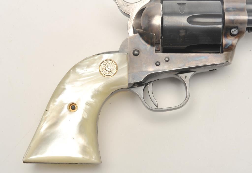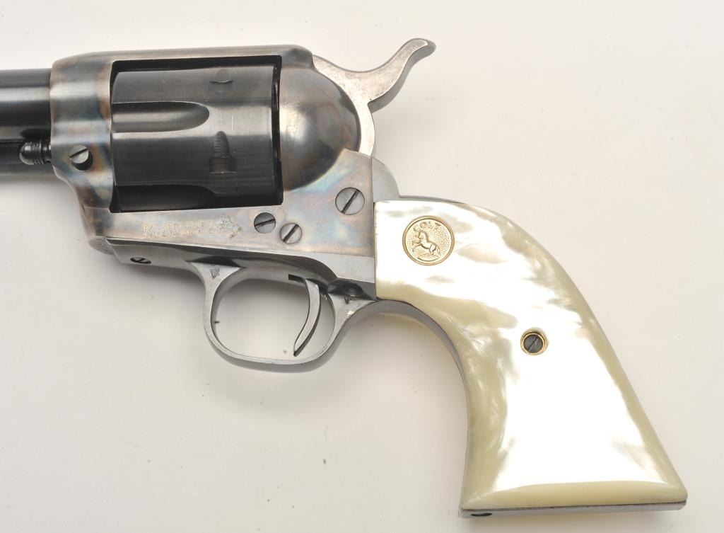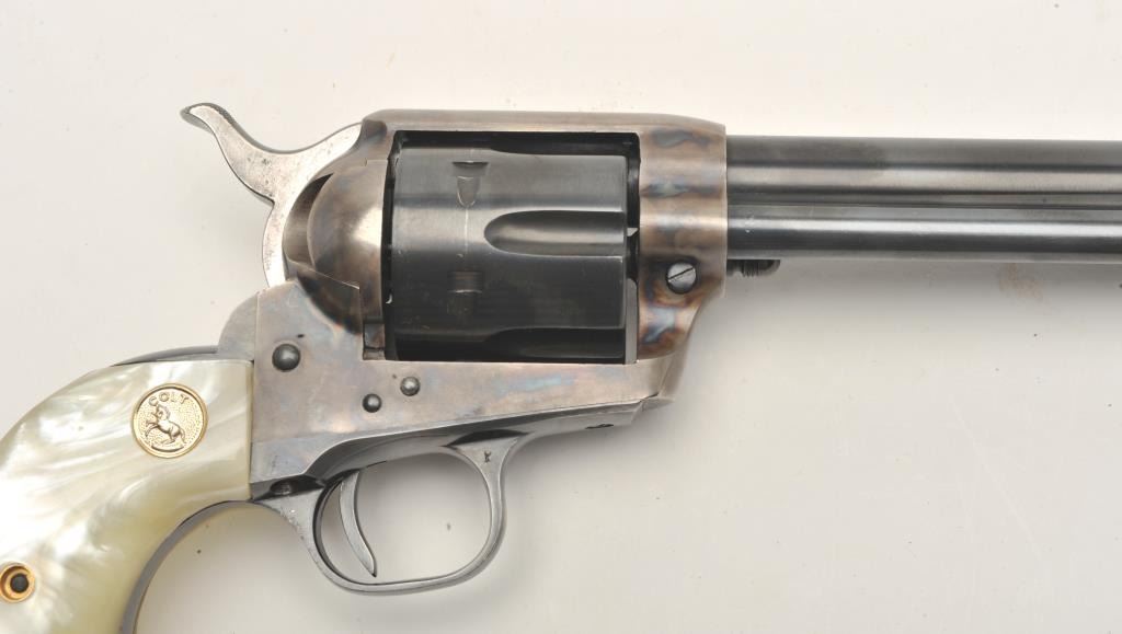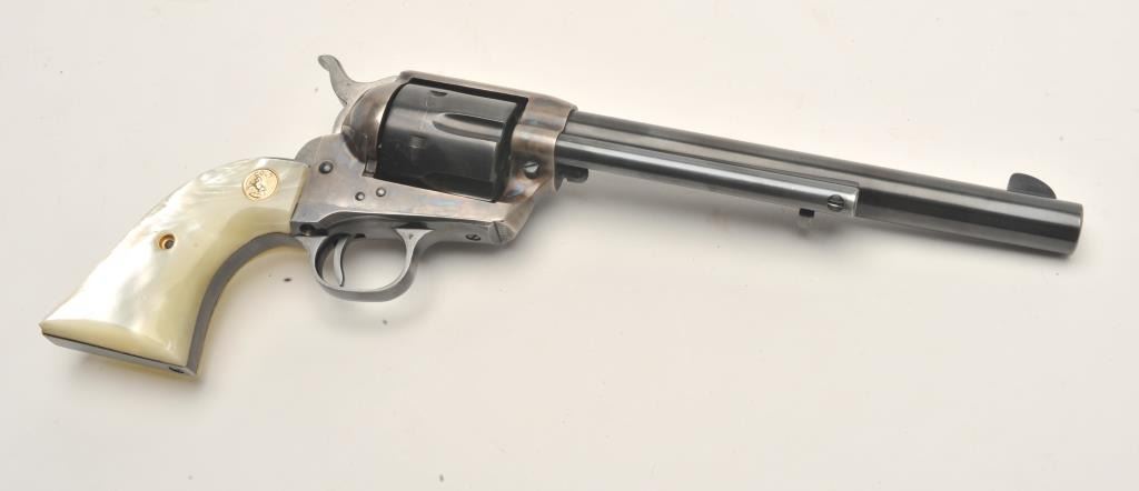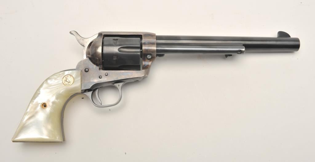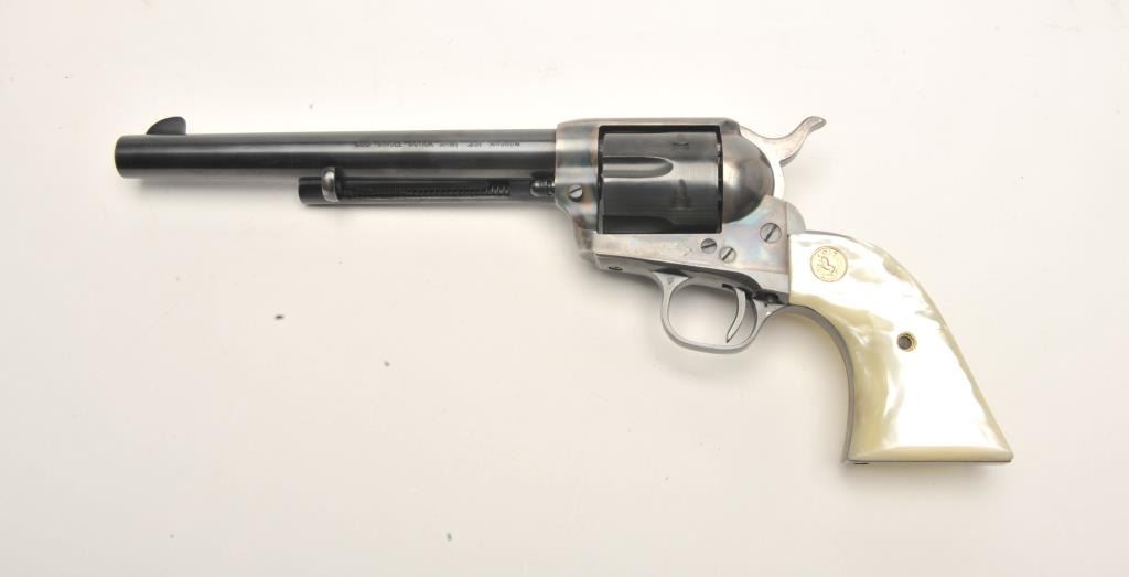 Colt 2nd Generation SAA revolver, .357 Magnum caliber, 7.5” barrel, blued and case hardened finish, simulated pearl medallion grips, S/N 37548SA, in overall fine condition displaying the majority of its original blue and case colors; fine bore, crisp action, sharp markings and very good + grips. (Modern/No PPT). Est.: $1,000-$2,000.