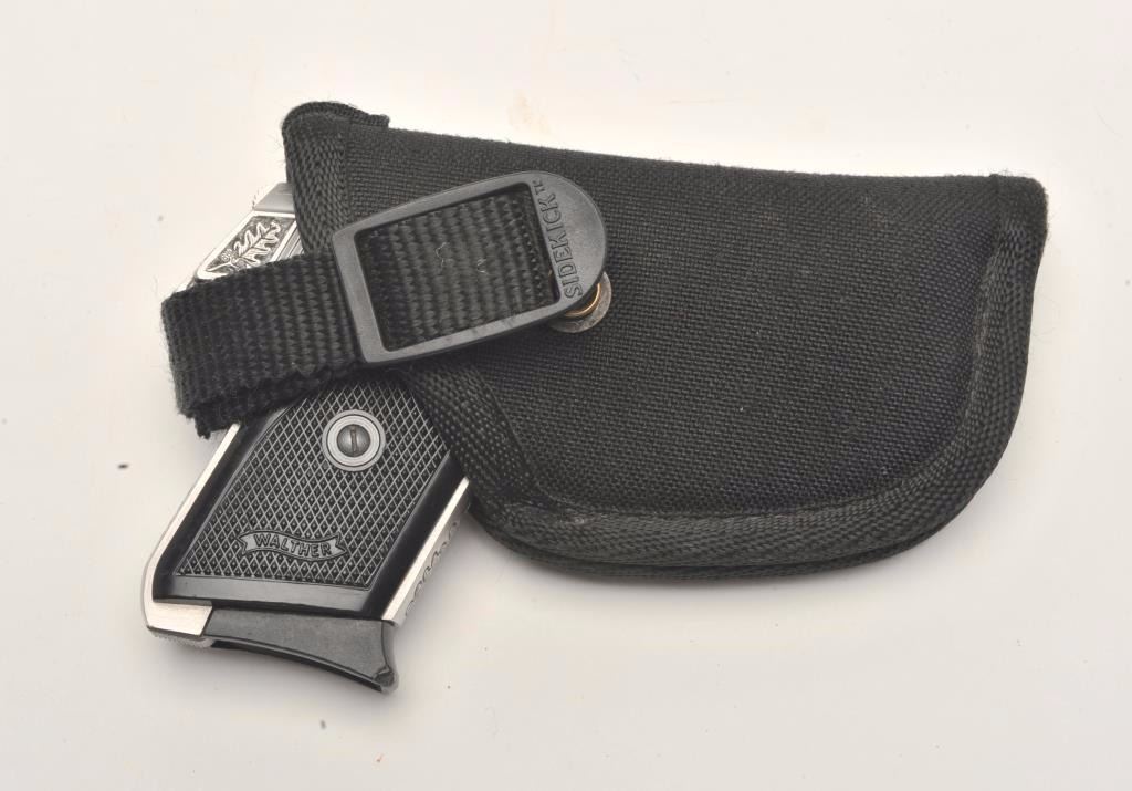 Interarms under Walther license Model TPH engraved semi-automatic pistol, .22LR caliber, 2.75” barrel, stainless, checkered black grips, S/N T004515, in overall excellent condition showing little use orhandling; with black woven holster. (Modern/No PPT/NO CALIF. SALE). Est.: $400-$800.