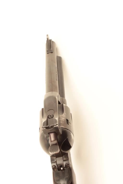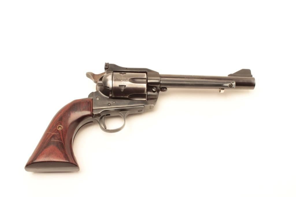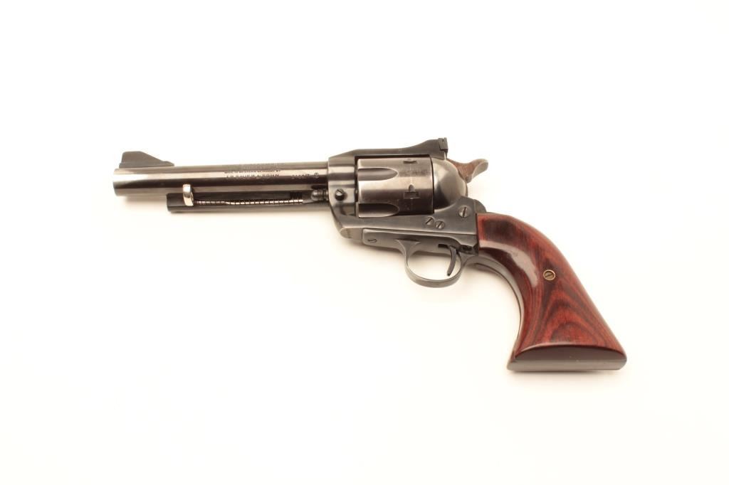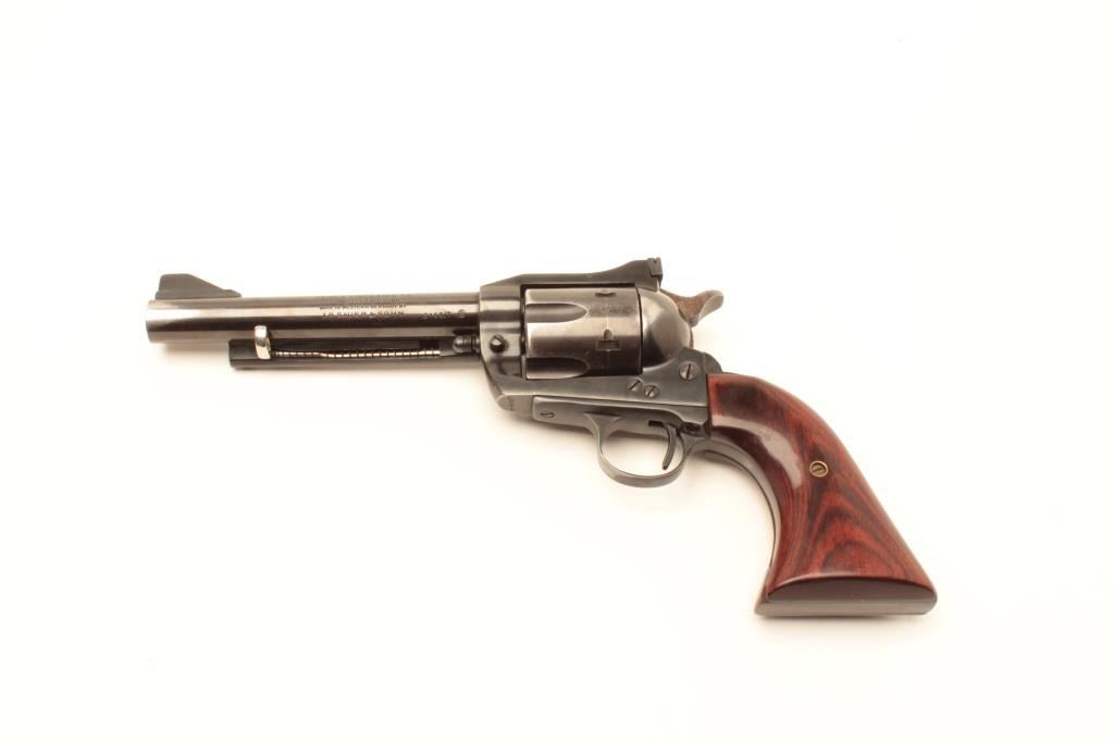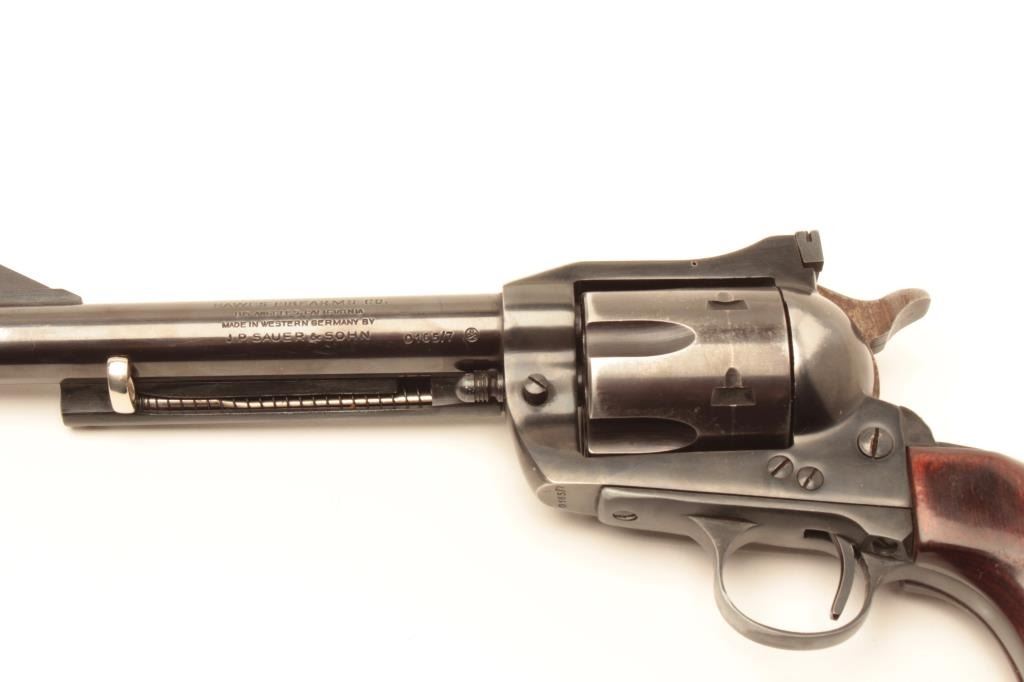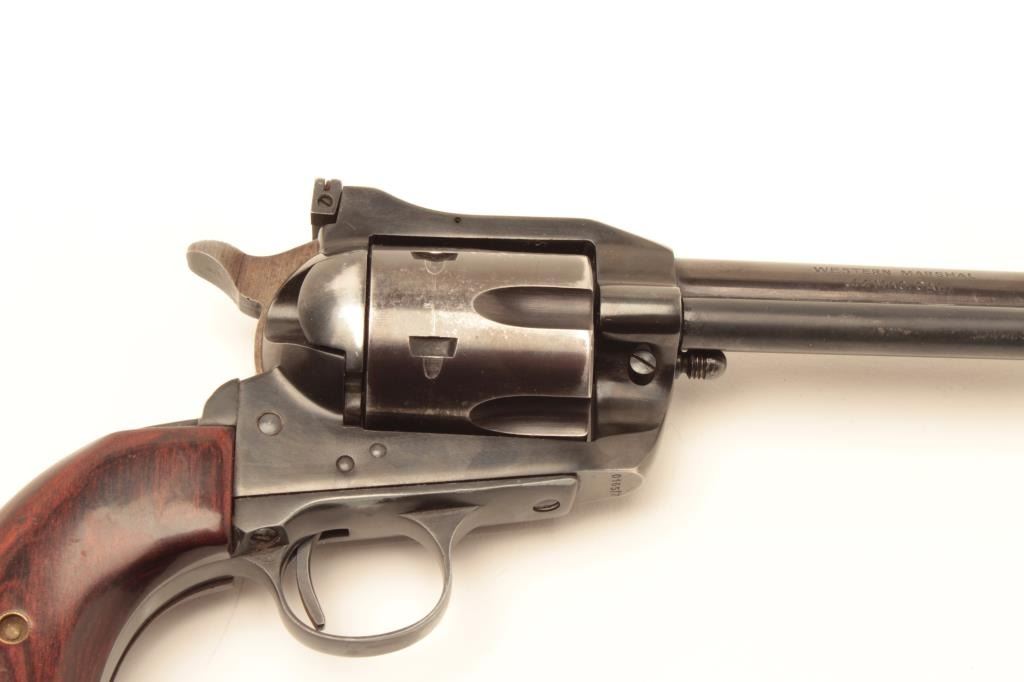 Hawes Firearms Co. Western Marshal Model SAA revolver with leather holster and cartridge belt; .44 Magnum caliber, 6” barrel, blued finish, wood grips, S/N 016517, in overall very good condition displaying the majorityof its muted original finish with holster wear; very good bore, crisp action, sharp markings and very good grips. (Modern/No PPT). Est.: $200-$400.