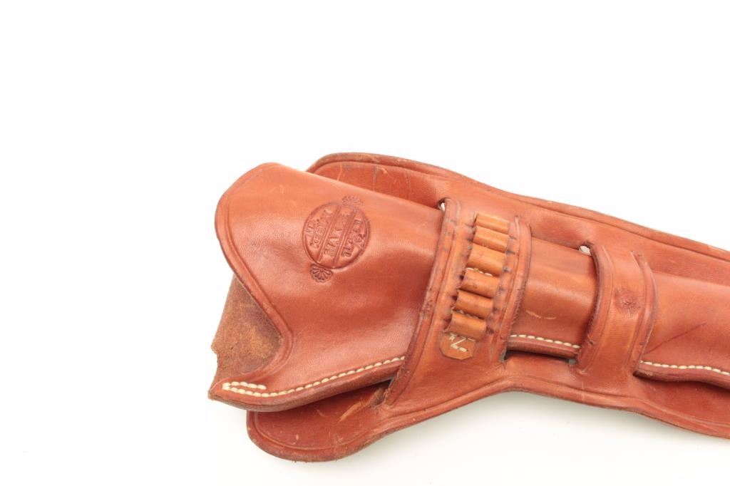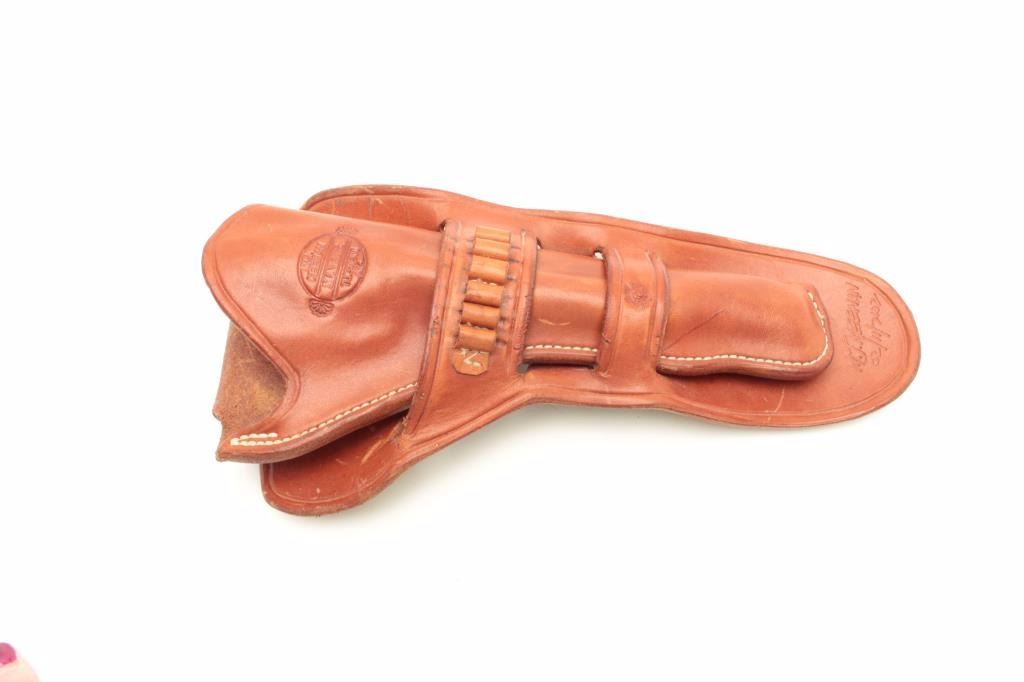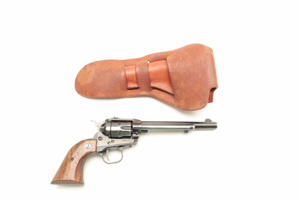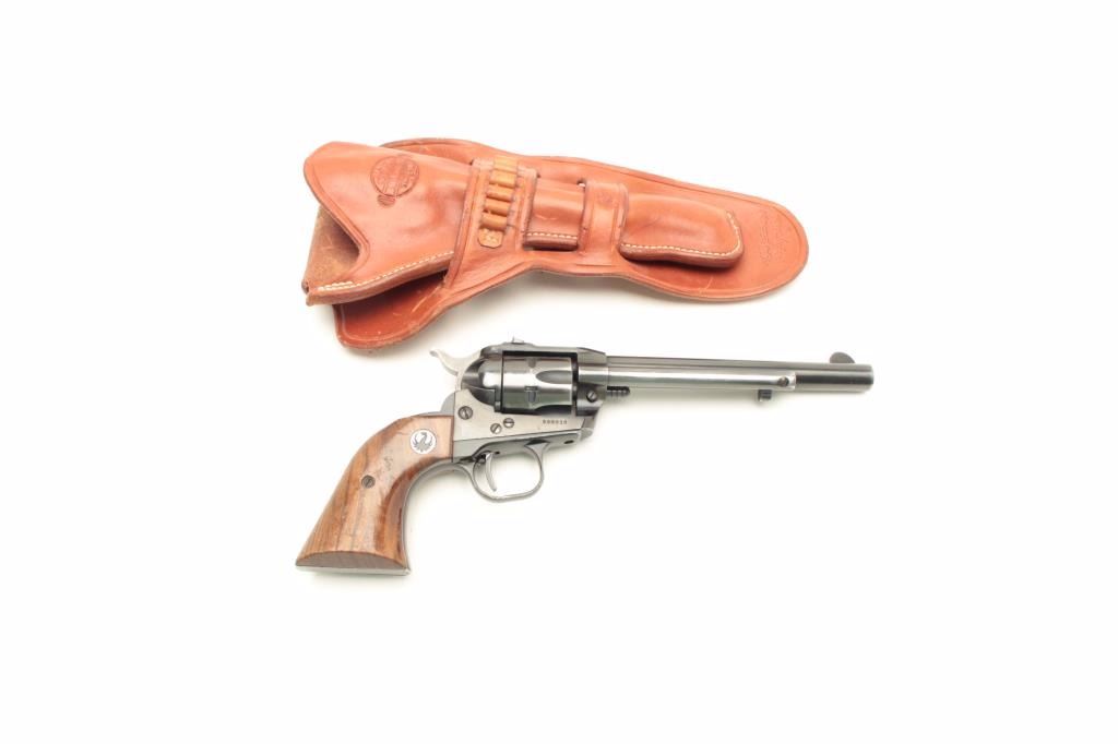 Ruger Single Six revolver, Win. .22RF Mag. caliber, 6.5” barrel, blued finish, wood medallion grips, S/N 309010, in overall very good condition with majority of original finish, some holster wear, crisp action,sharp markings, very good bore and good to very good grips. Accompanied by a Keenan double loop leather holster. (Modern/No PPT). Est.: $200-$400.