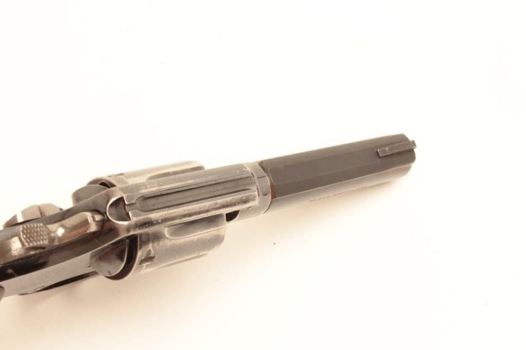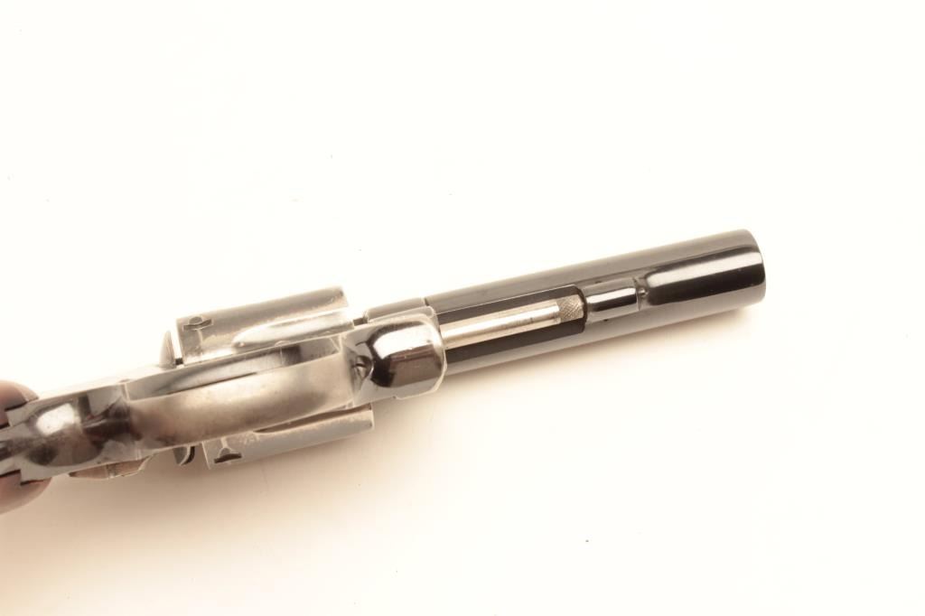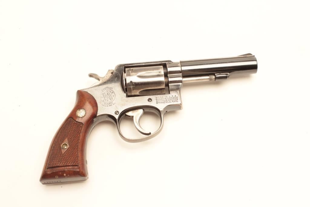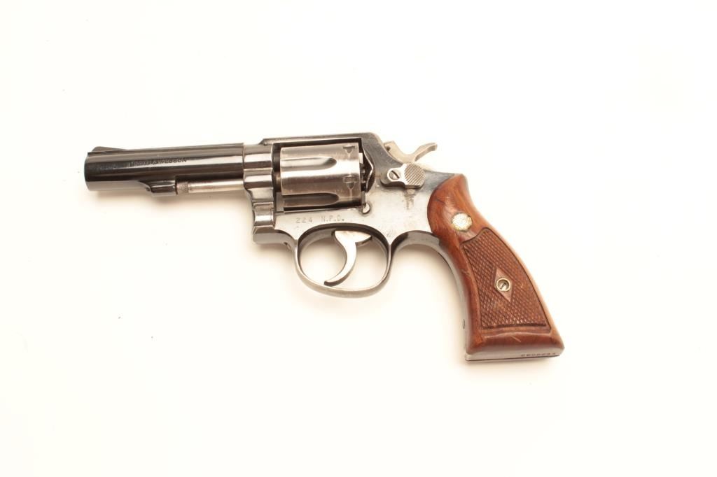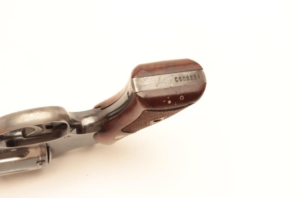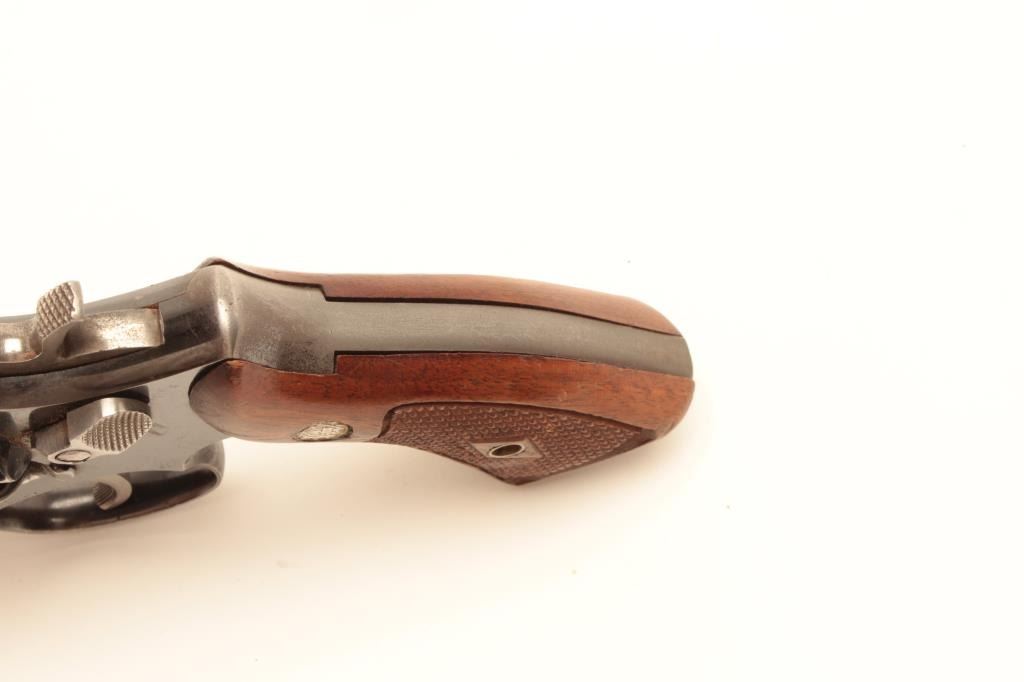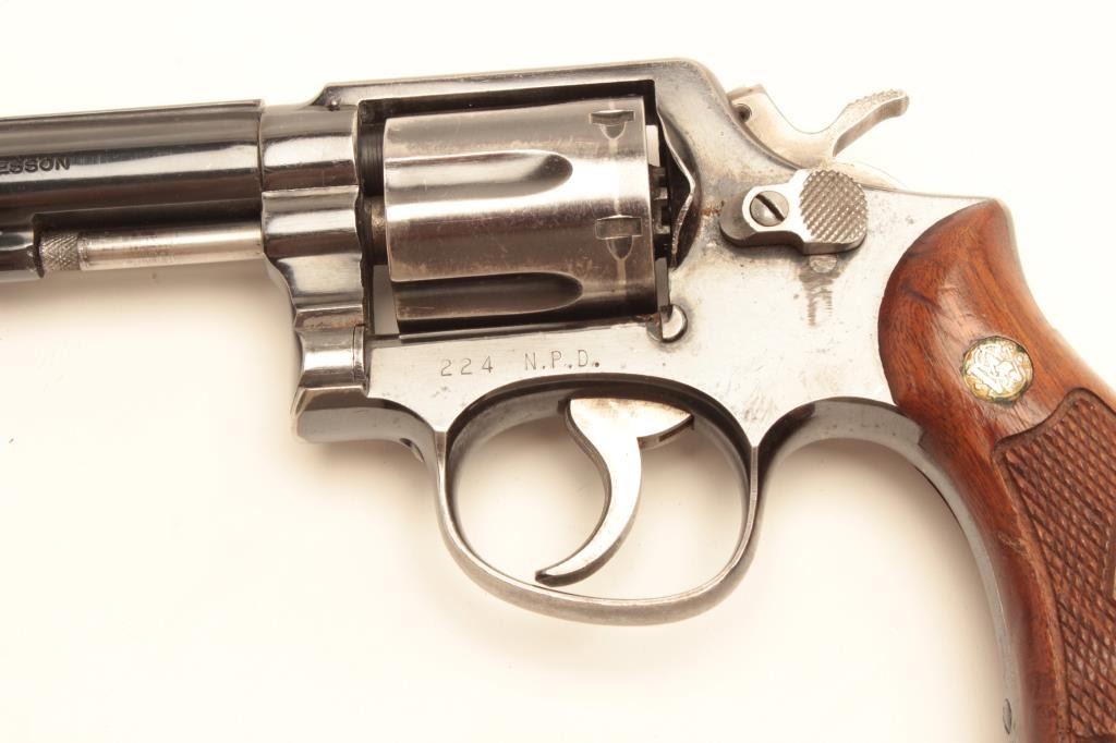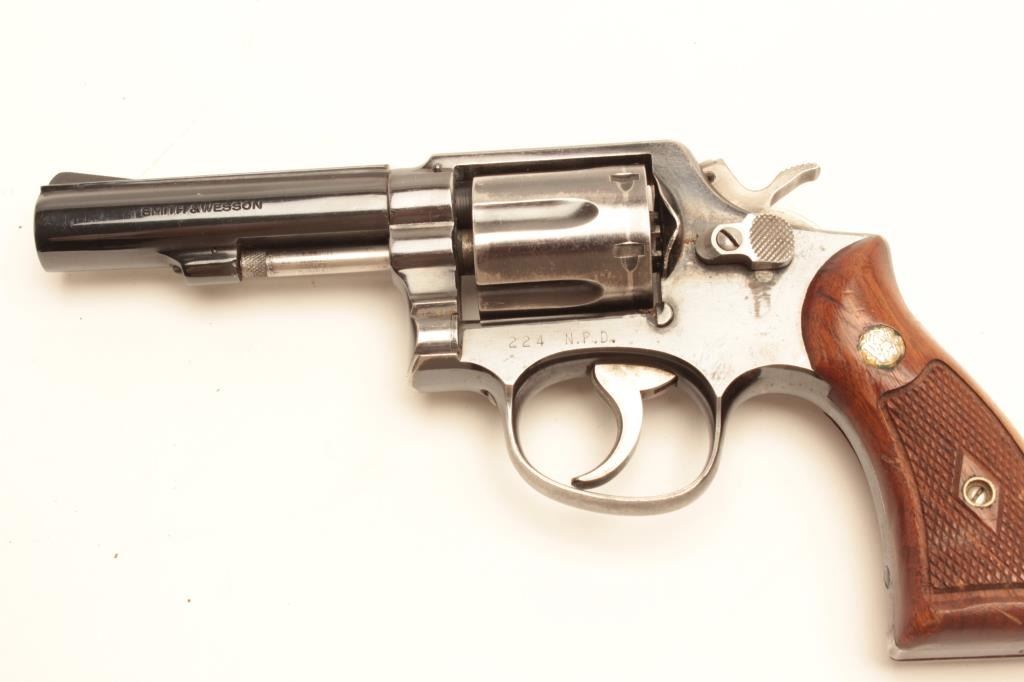 Smith and Wesson Model 10 revolver, .38 Special caliber, Serial #C500234. The pistol is in very good overall condition with a 4”medium heavy barrel. The pistol retains the majority of its blued finish with smallscratches, muzzle wear and a drag line on the cylinder. The trigger and hammer show old, muted case hardening while the frame is marked, “224 N.P.D.” The checkered medallion wood grips are in good condition with smallmars and marks from use and carry. The bore is good, the action crisp and markings are sharp. From the Gil Newton collection. Est.: $400-$800. (C+R).