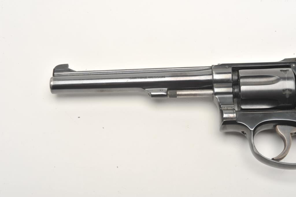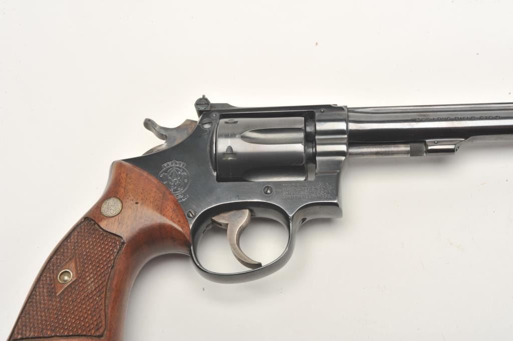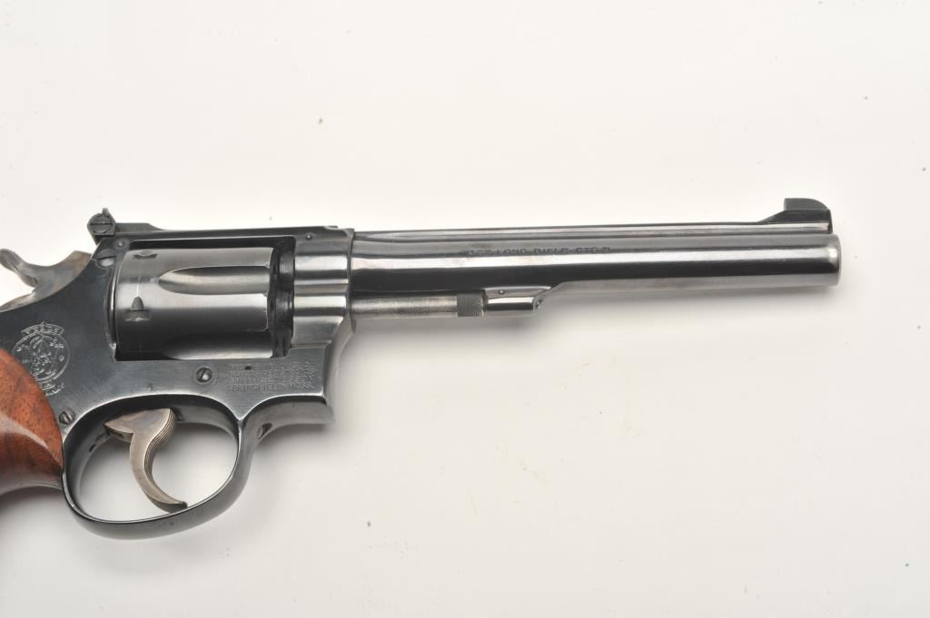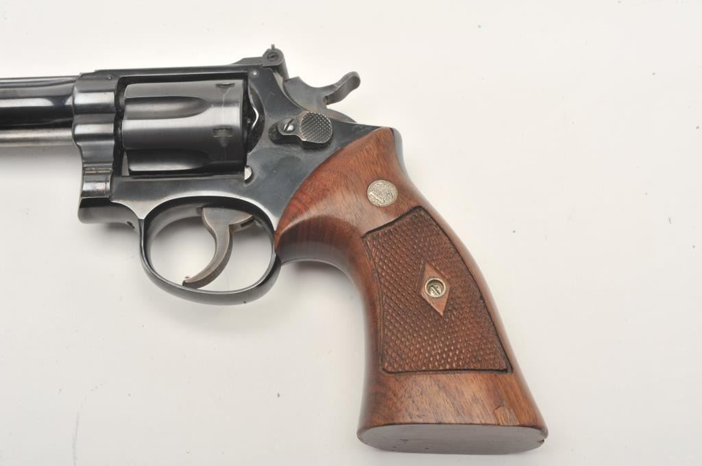 Smith & Wesson DA revolver, 5-screw frame, .22LR caliber, 6” barrel, blued finish, checkered wood medallion grips, S/N K241151, in overall very good to fine condition showing majority of its original finish, fine bore, crisp action, sharp markings and very good grips. (Modern/No PPT). Est.: $400-$800.