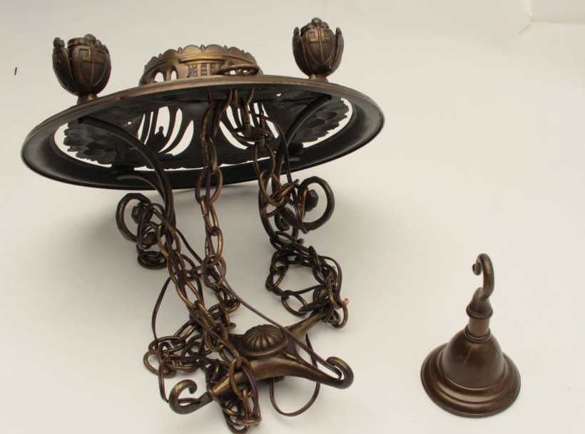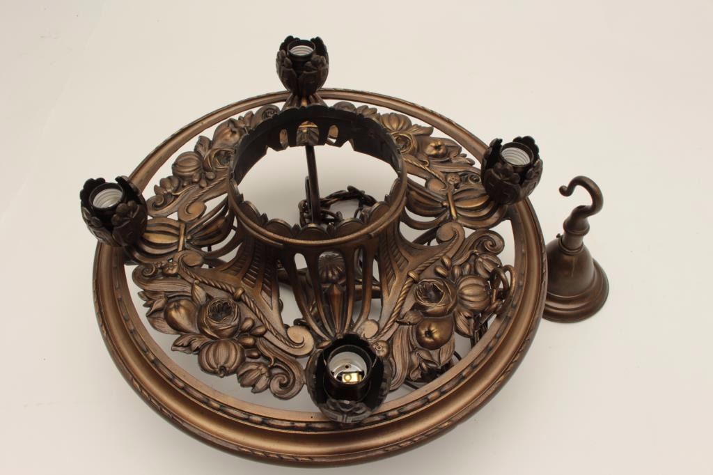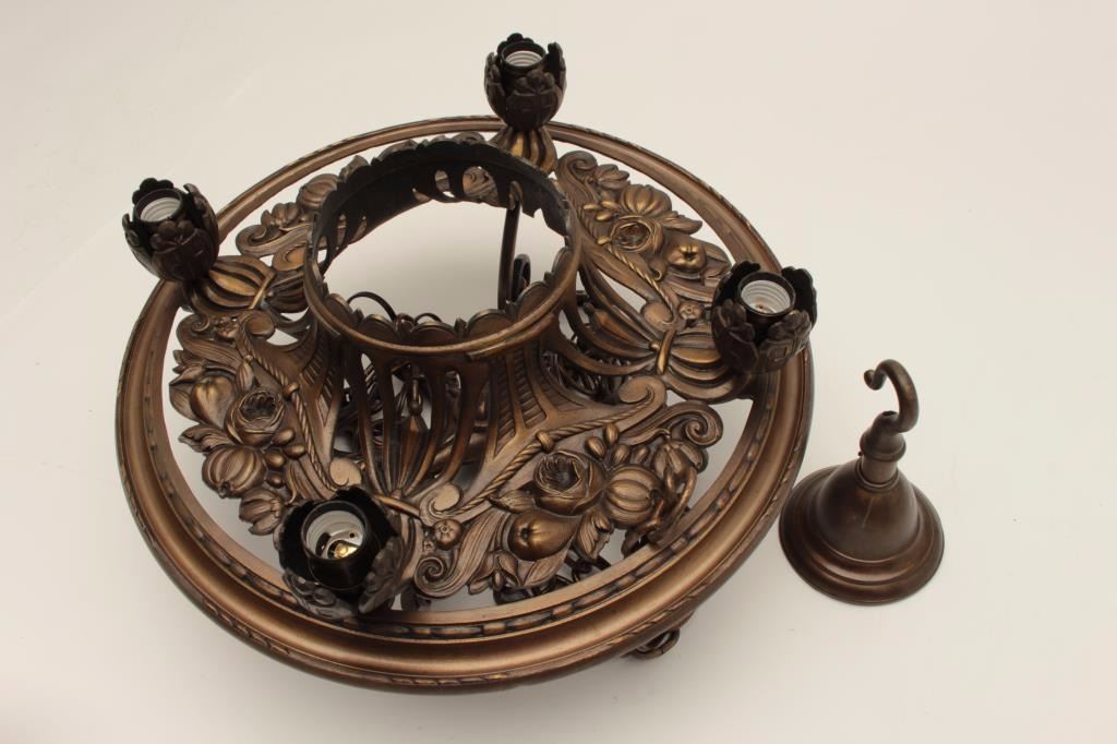 Fancy bronze ceiling lamp in the French Art Nuevo style, approximately 18” in diameter; with ceiling cap and hanging chains. Est.: $400-$800.