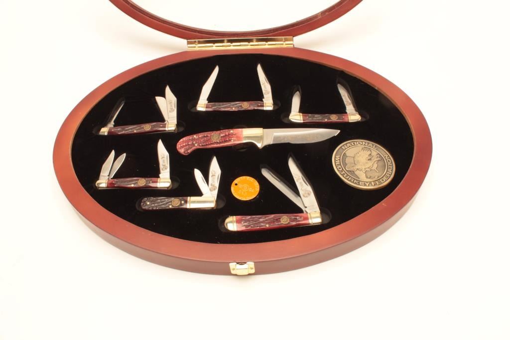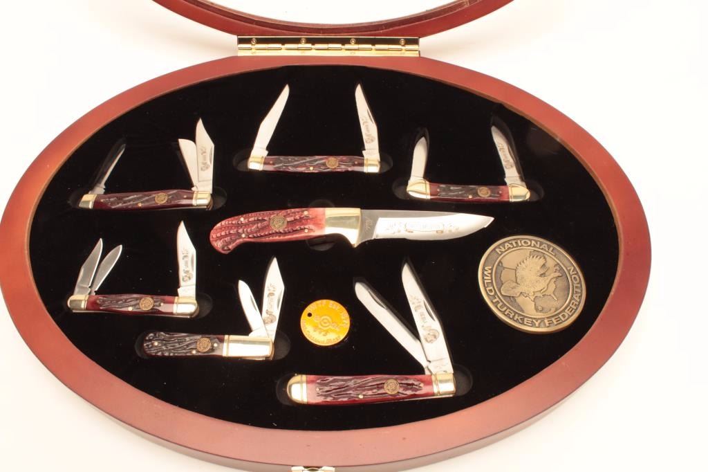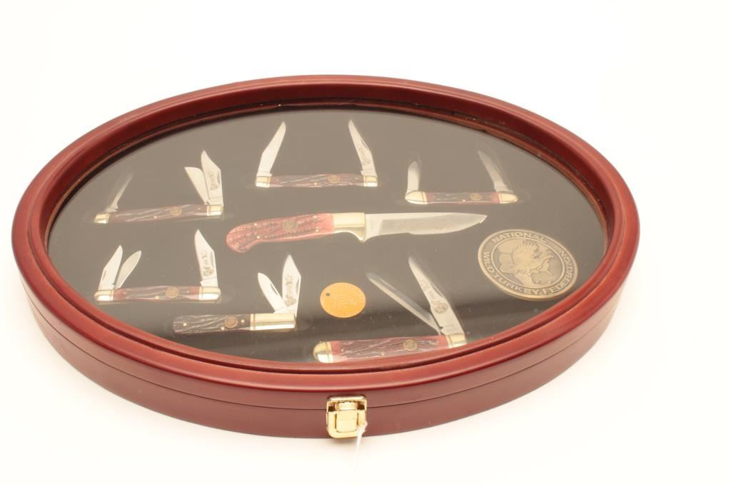 Framed National Turkey Federation knife display, approximately 14” x 18.5” overall and including one skinning knife and six multi-blade folders; all like new condition and each different. A beautifulcommemorative display! Est.: $100-$200.