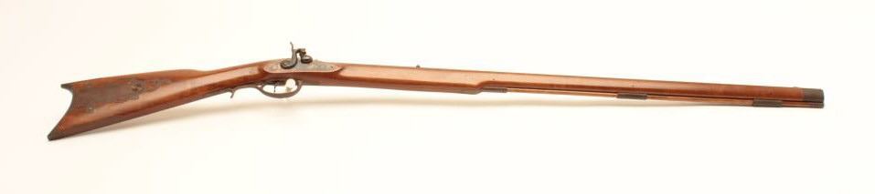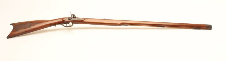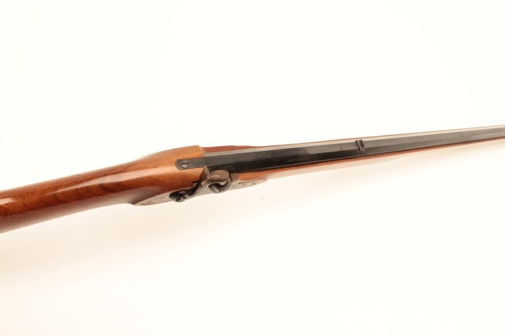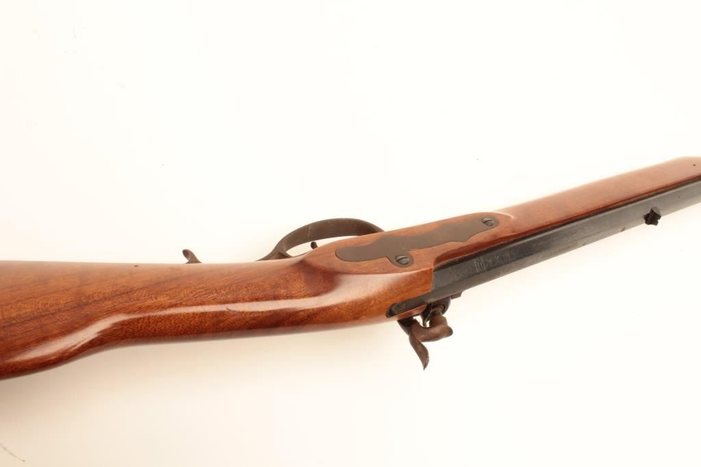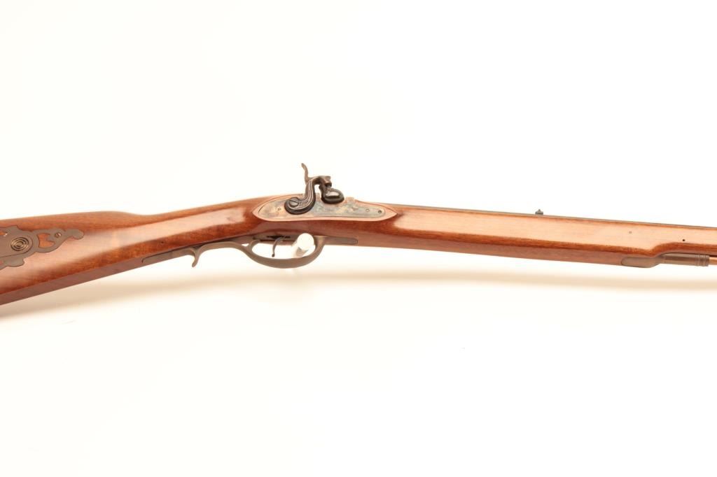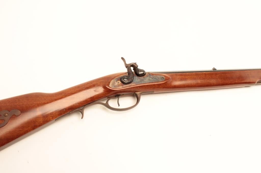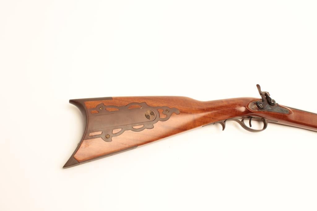 Italian made Kentuckian reproduction percussion rifle, .45 caliber, Serial #99719. The rifle is in fine overall condition with a 35” octagon barrel with a blade front sight. The barrel retains nearly all of itsblued finish with sharp edges. The side plate of the action shows old, muted case colors and fine scroll engraving. The smooth wood stock is in very good condition with small mars and brass hardware. The buttstock ends with a smooth, brass crescent butt plate. Est.: $225-$450.