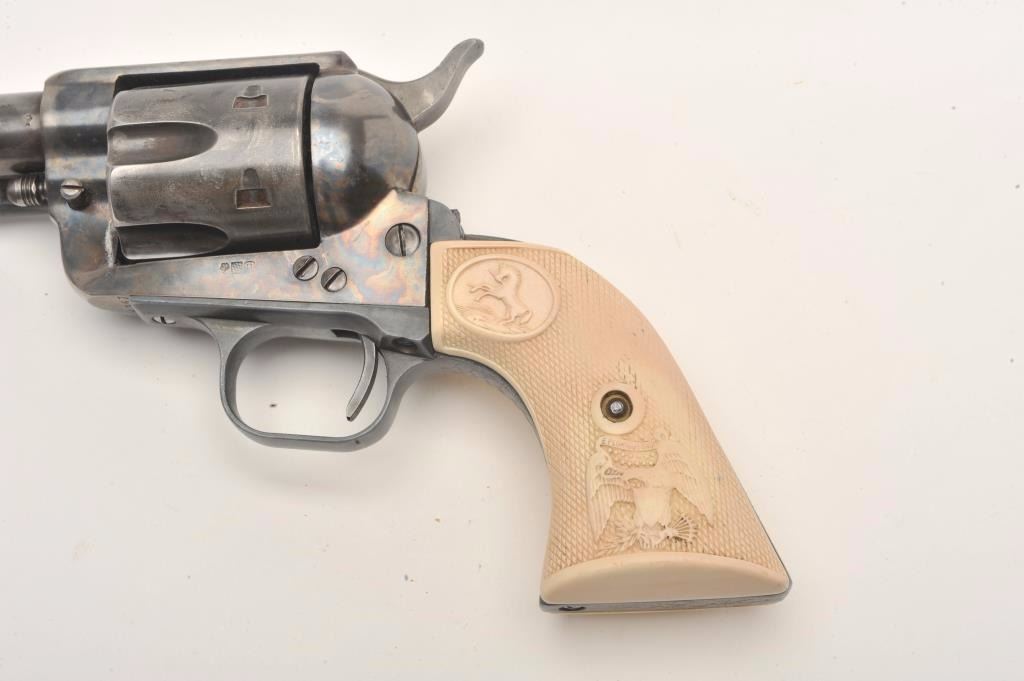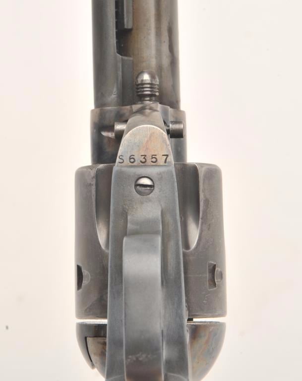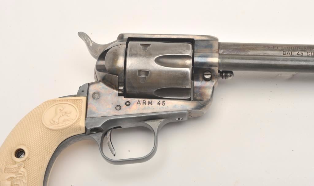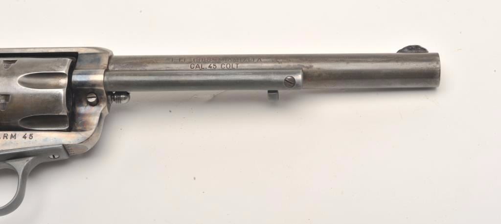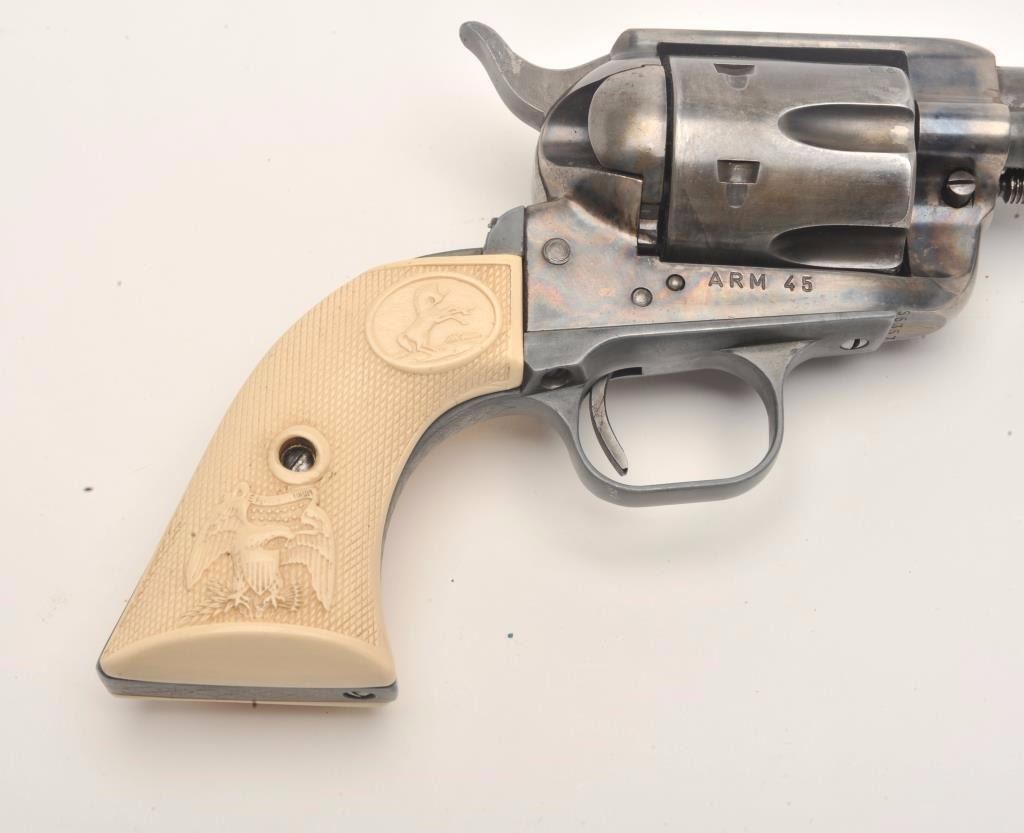 West German Arminius SAA by H. Weihrauch, .45 caliber, Serial #56357. The pistol is in good overall condition with a 7 ½” barrel. The barrel and cylinder retain a significant amount of muted blue finish while the frameshows vivid case colors. The checkered faux ivory eagle grips are in good condition showing wear from carry and use. The bore is good, the action crisp and markings are legible. Est.: $250-$500. (Modern).