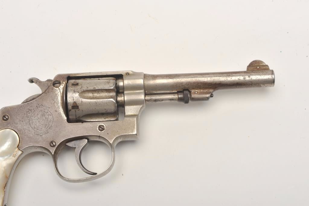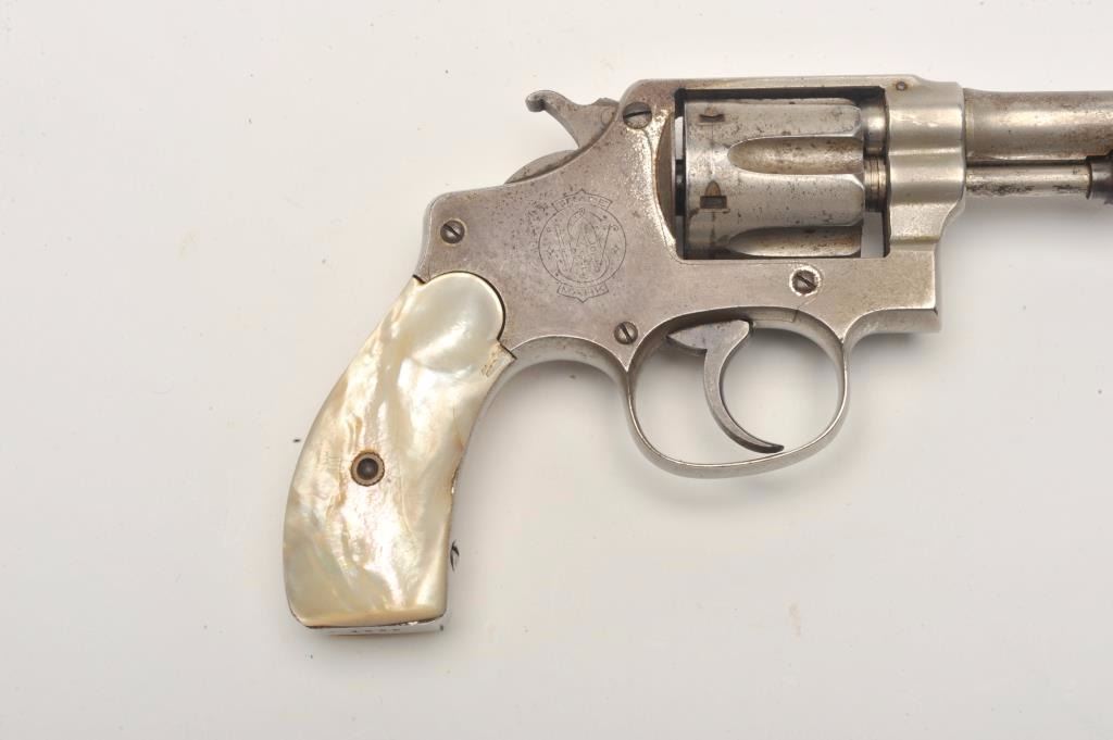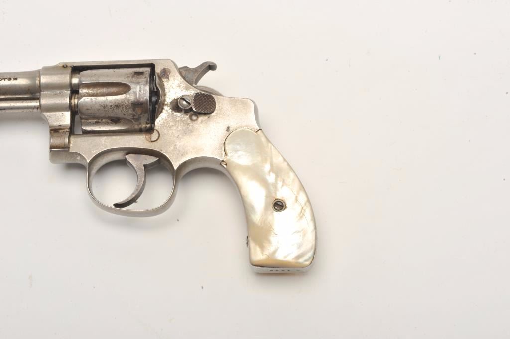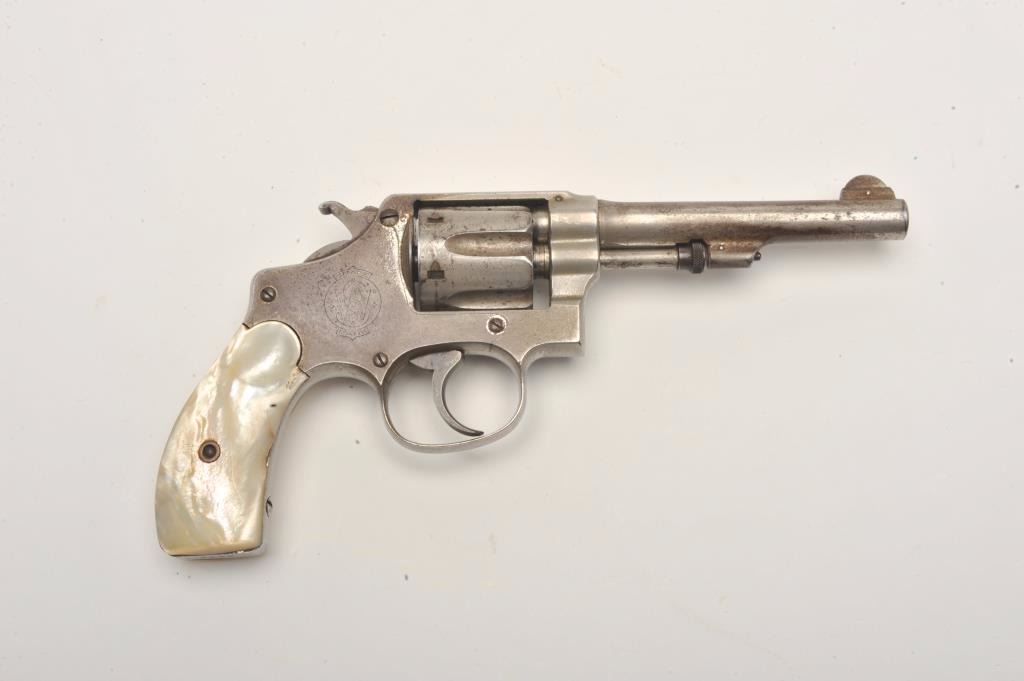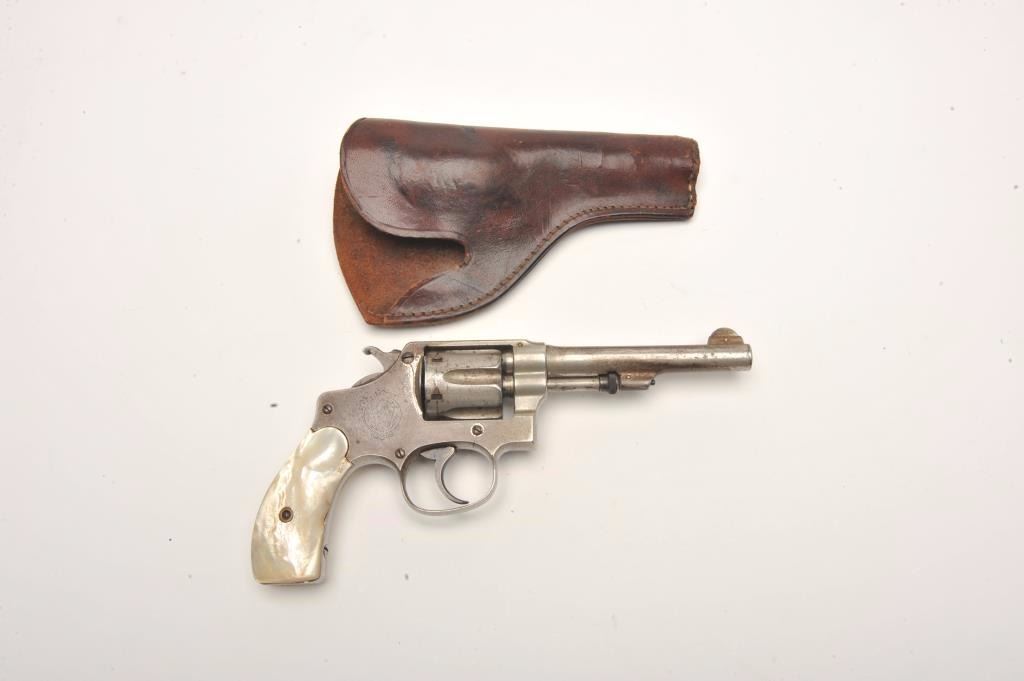 Smith and Wesson Hand Ejector revolver, .32 caliber, Serial #1662. The pistol is in good overall condition with a 4” barrel. The revolver retains a significant amount of its flaking factory nickel finish with losses ontop of the barrel and on the cylinder. The pearl grips are in good condition with natural age crackleture and fit well. The bore is good, the action crisp and markings are sharp. The lot includes a period leather holster in good condition. Est.: $200-$400. (C+R).