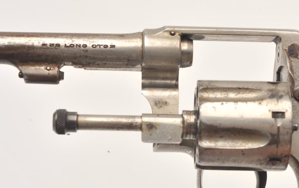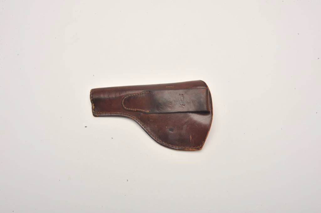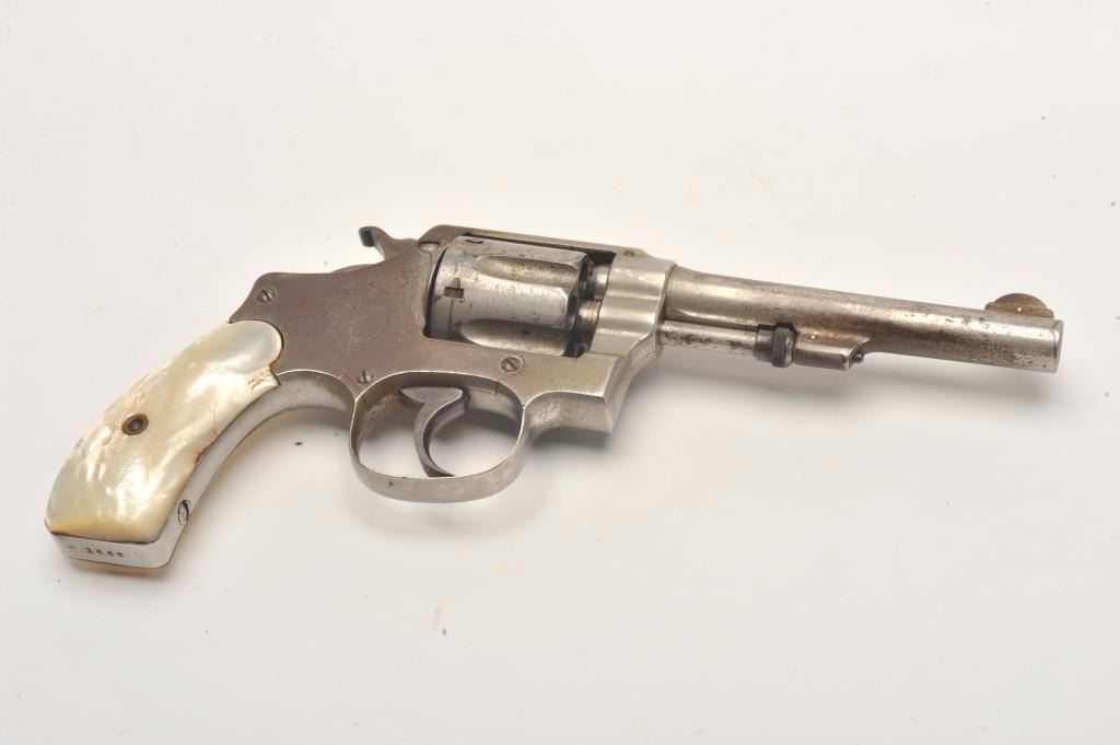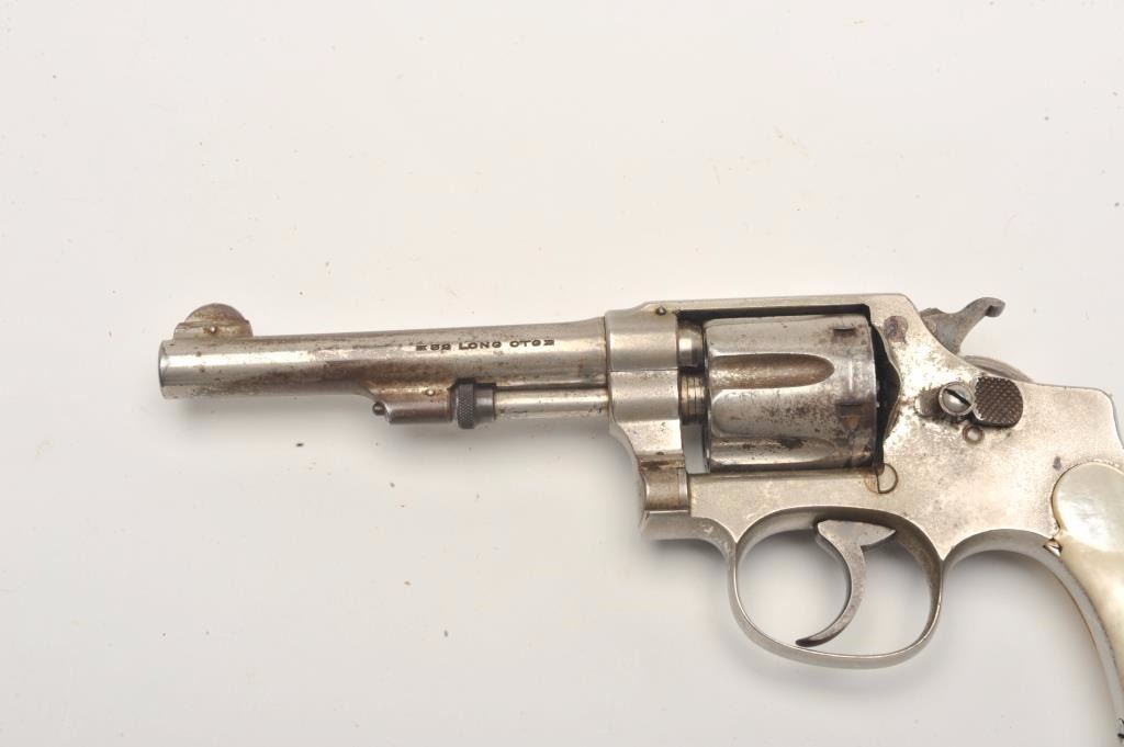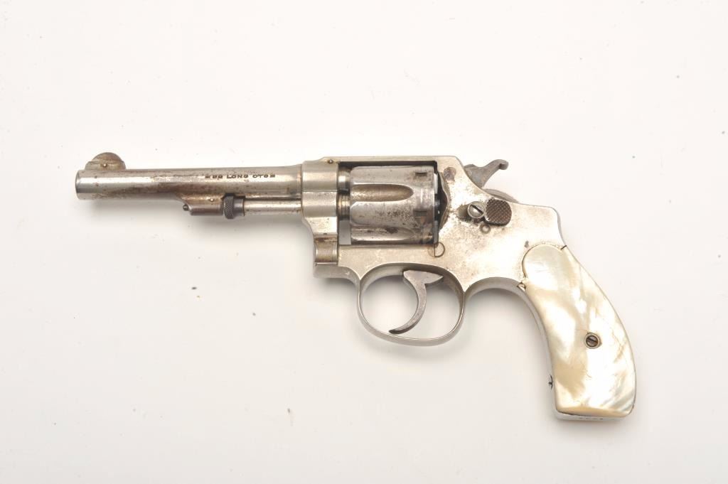 Smith and Wesson Hand Ejector revolver, .32 caliber, Serial #1662. The pistol is in good overall condition with a 4” barrel. The revolver retains a significant amount of its flaking factory nickel finish with losses ontop of the barrel and on the cylinder. The pearl grips are in good condition with natural age crackleture and fit well. The bore is good, the action crisp and markings are sharp. The lot includes a period leather holster in good condition. Est.: $200-$400. (C+R).