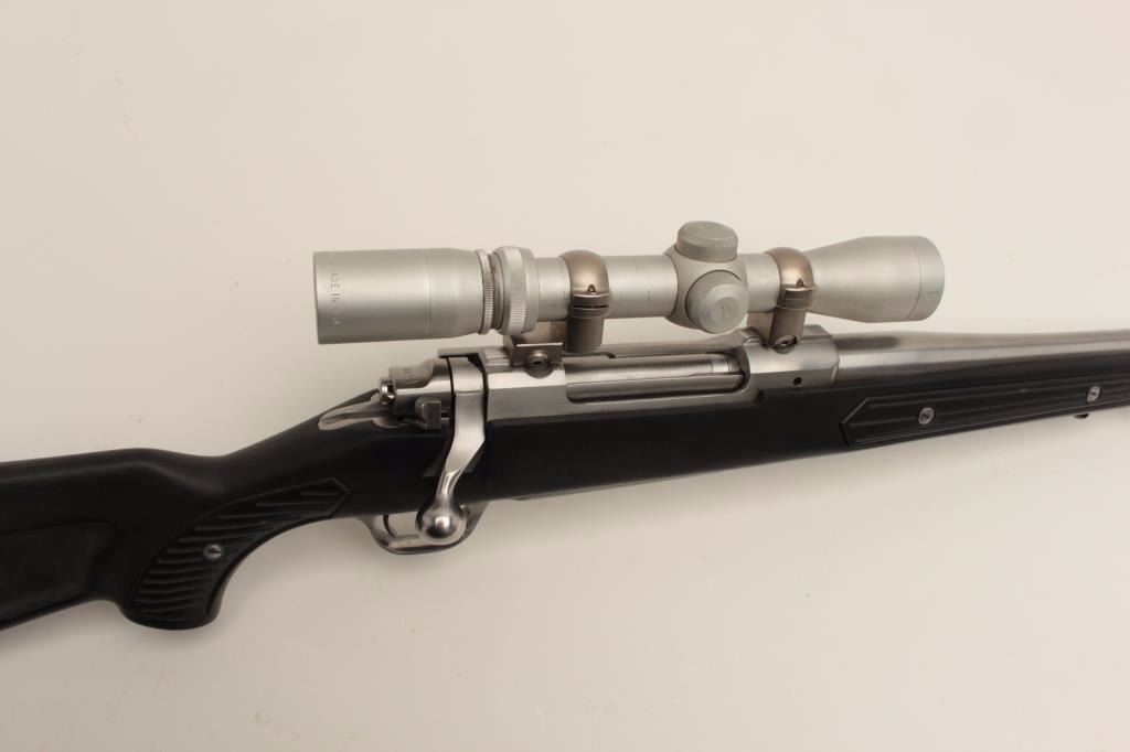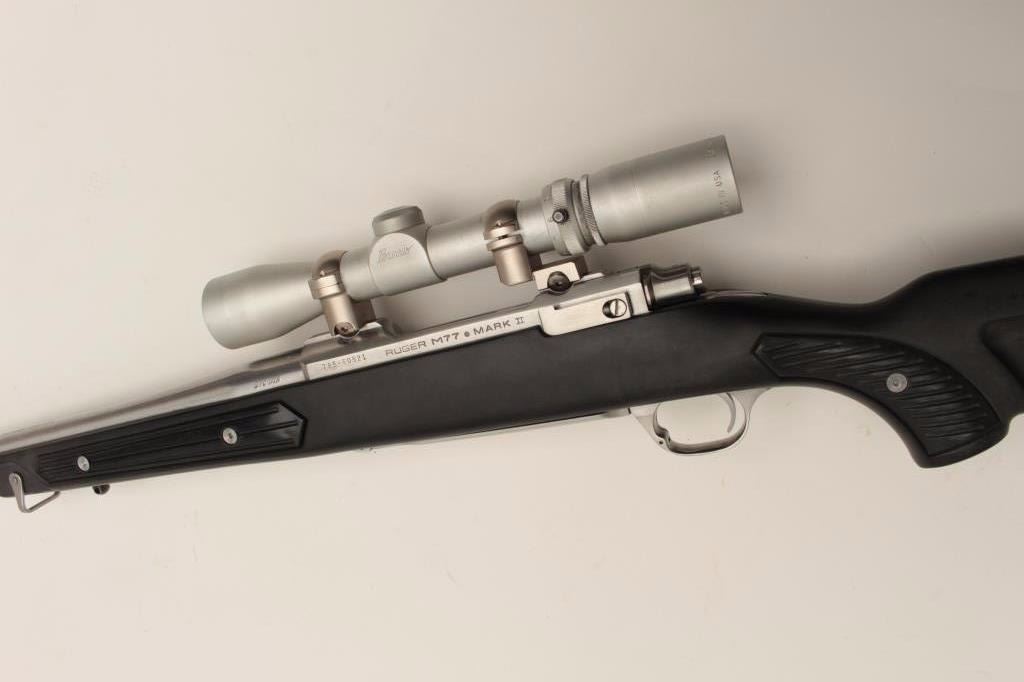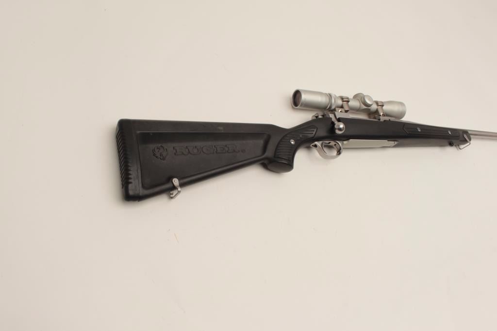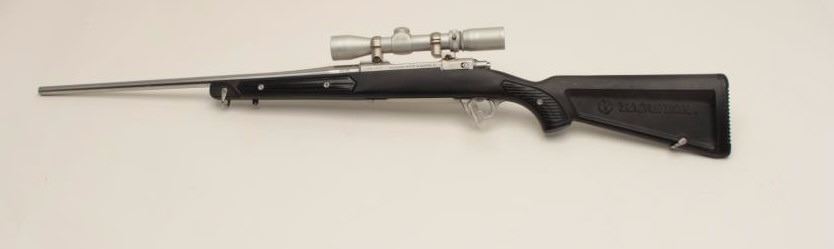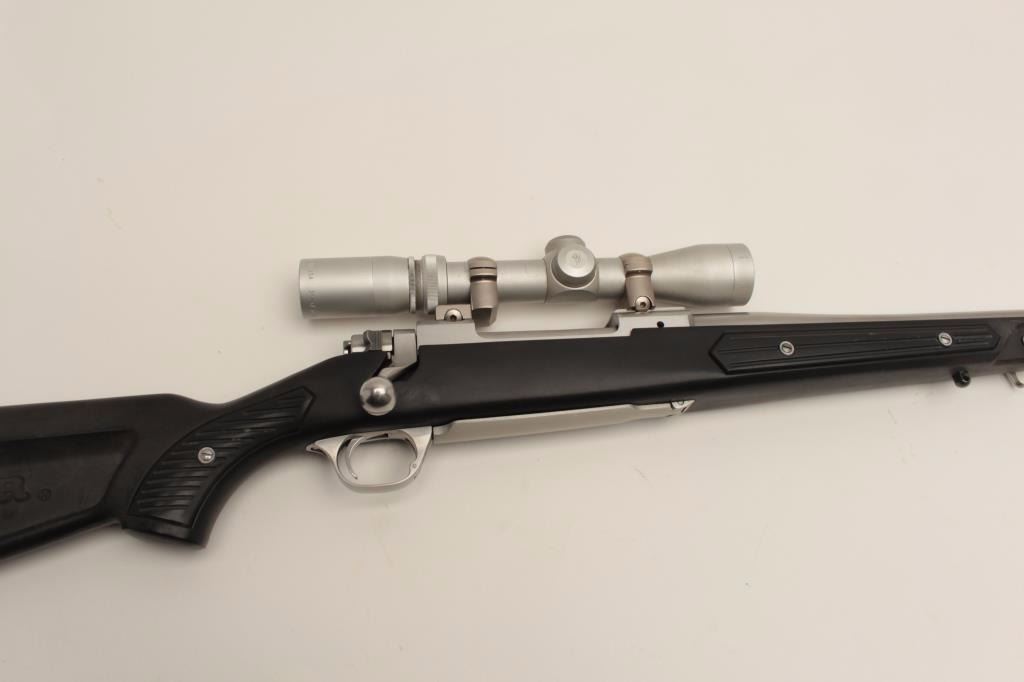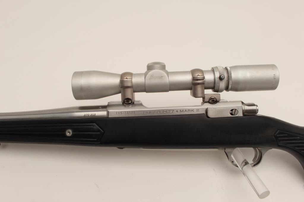 Ruger Model 77 bolt action rifle, .270 Win. caliber, 22” barrel, stainless, Zytel stock, S/N 785-50521, mounted with a Burris 3x-9x scope with sharp optics, in overall very good to fine condition with very good + bore,crisp action, sharp markings and fine Ruger stock. (Modern/No PPT). Est.: $300-$600.