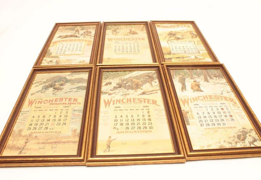 Lot 616 Lot of 6 framed reproductions of early Winchester Repeating Arms Co. color calendar advertisers; e