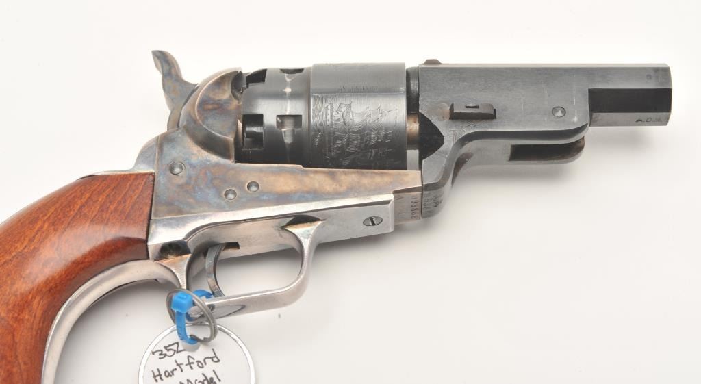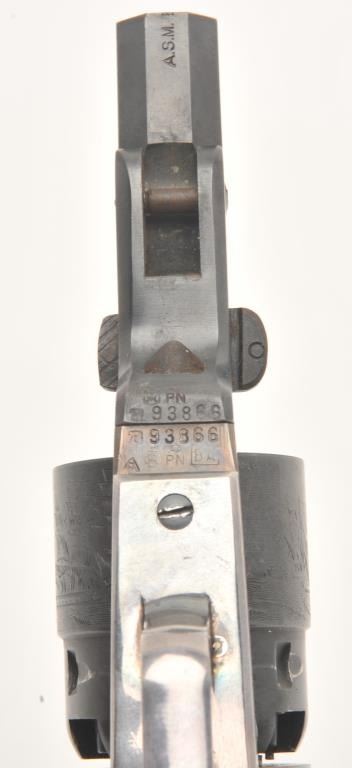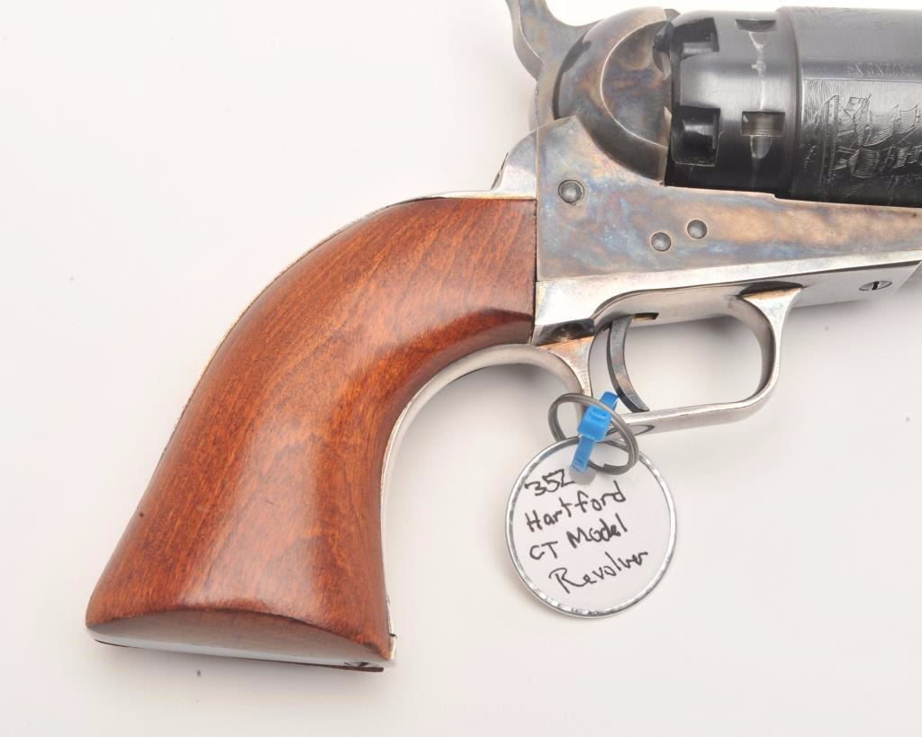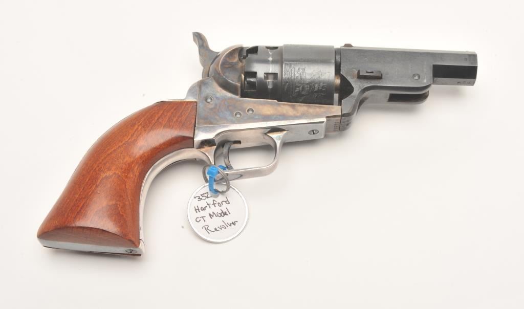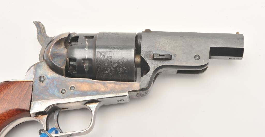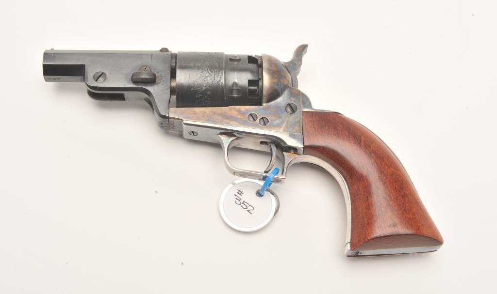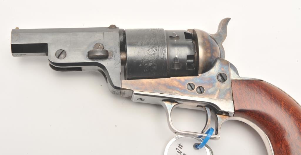 Custom modern black powder reproduction percussion revolver, .44 caliber, Serial #93866. The pistol is in very good overall condition as customized. The pistol has a shortened 3” octagon barrel on reproductionColt belt model percussion pistol. The cylinder shows considerable scene and the frame is brightly case colored. The back strap and trigger guard show considerable silver finish. The smooth wood grips are invery good condition. An interesting combination of features. Est.: $125-$250.