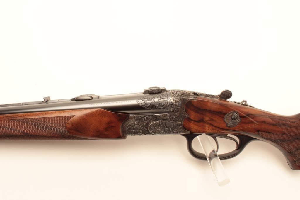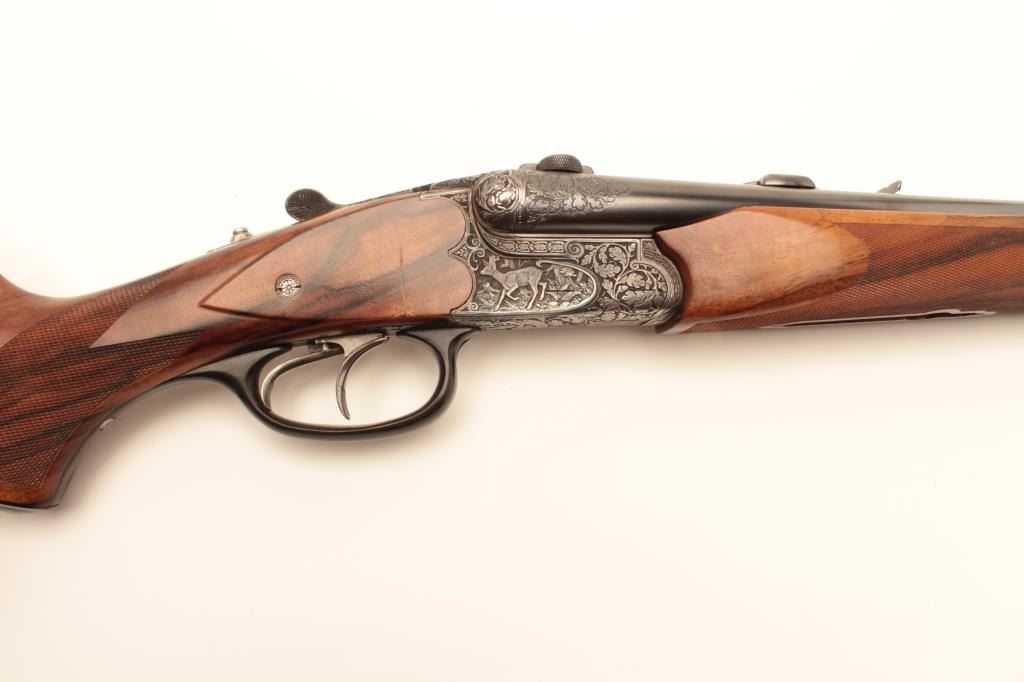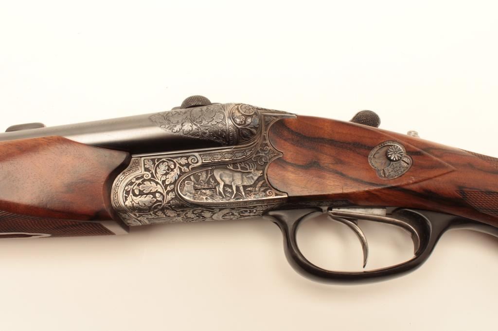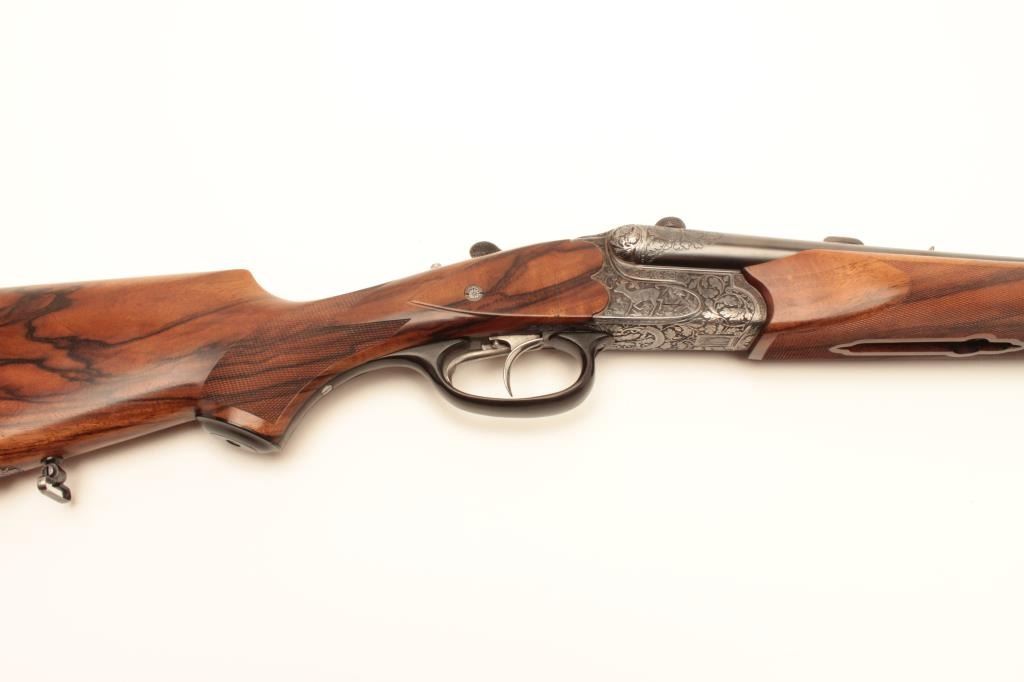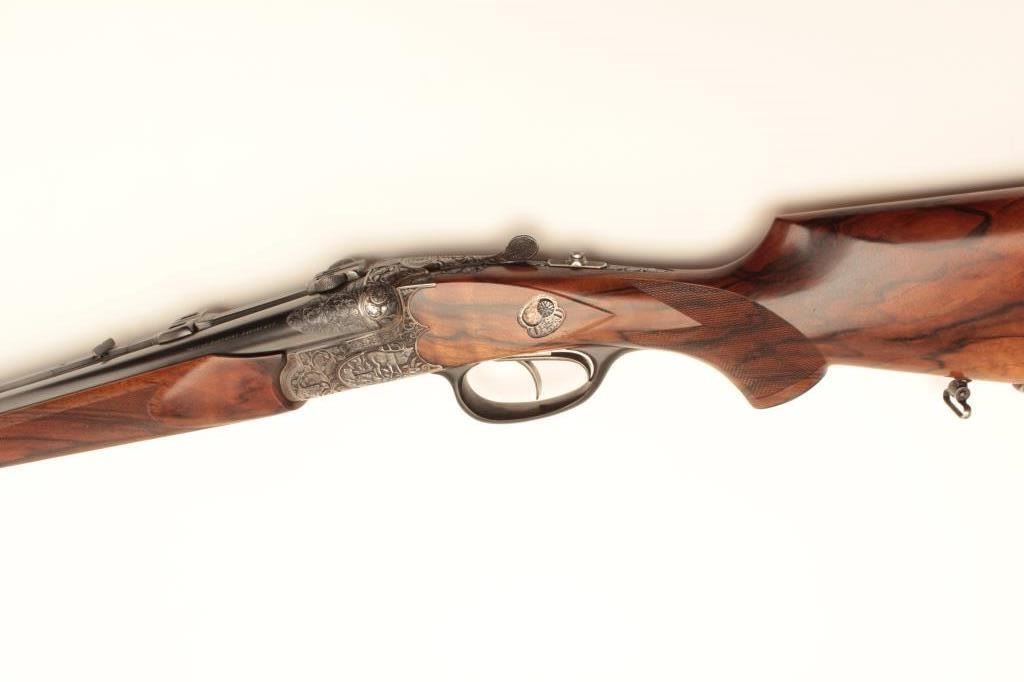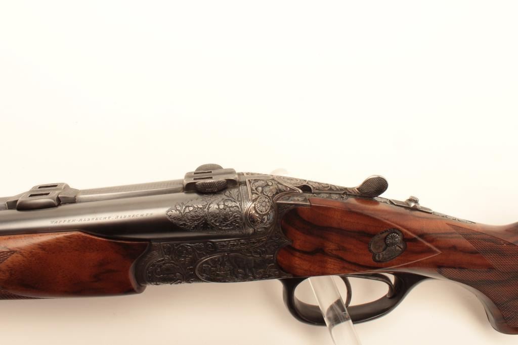 High relief engraved deluxe drilling rifle, 20 gauge SxS over 6.5x58RHO mm caliber, 23.5” barrel, blued finish to barrel assembly, double set triggers, deluxe checkered wood stocks, S/N 6345, in overall fine conditionwith fine bores, crisp actions and beautifully grained wood stocks. Accompanied by a 3 die set, ammunition and a hard carry case. (C&R/No PPT). Est.: $2,500-$5,000.