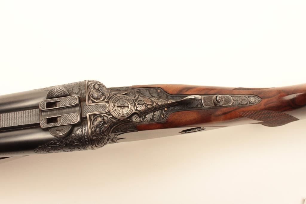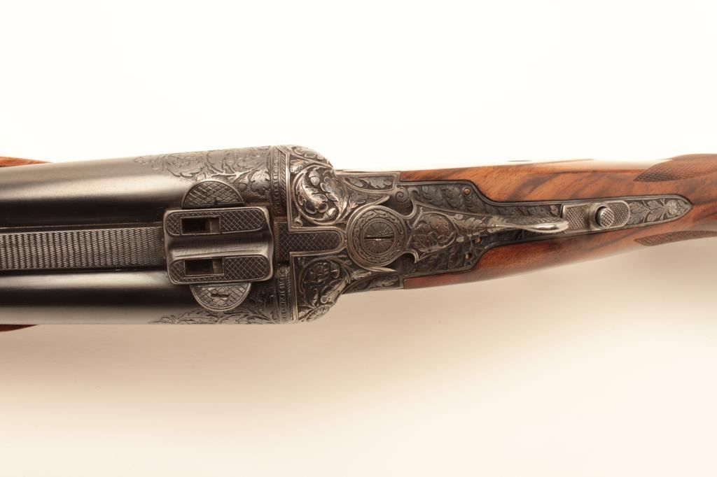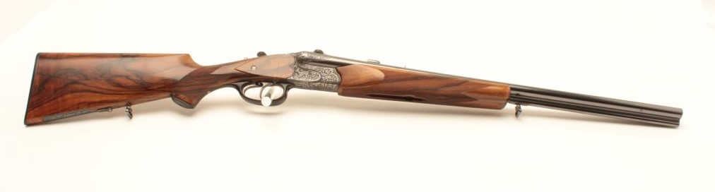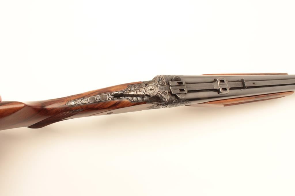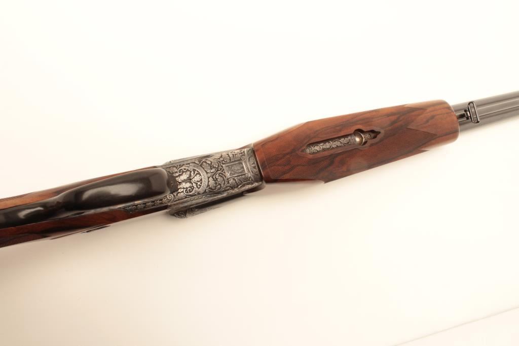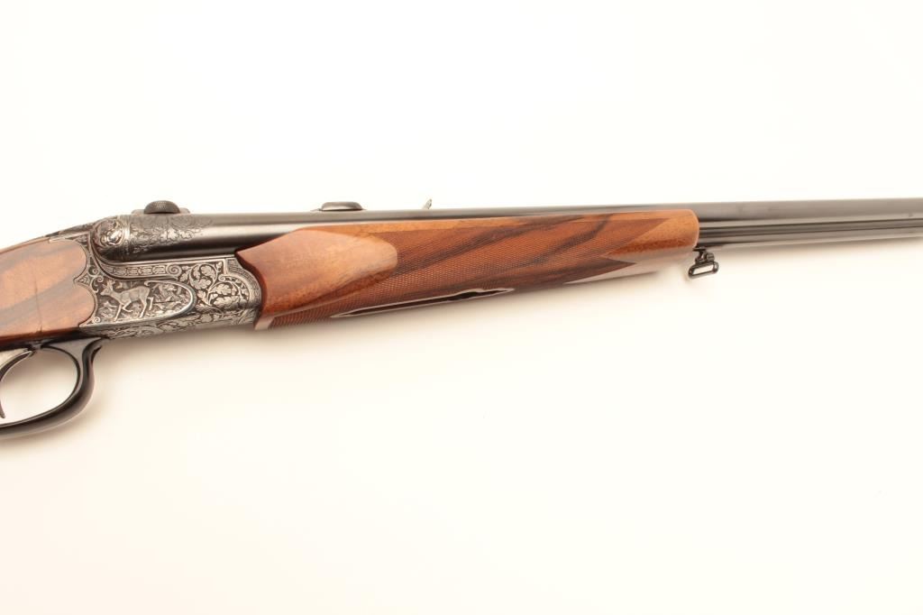 High relief engraved deluxe drilling rifle, 20 gauge SxS over 6.5x58RHO mm caliber, 23.5” barrel, blued finish to barrel assembly, double set triggers, deluxe checkered wood stocks, S/N 6345, in overall fine conditionwith fine bores, crisp actions and beautifully grained wood stocks. Accompanied by a 3 die set, ammunition and a hard carry case. (C&R/No PPT). Est.: $2,500-$5,000.
