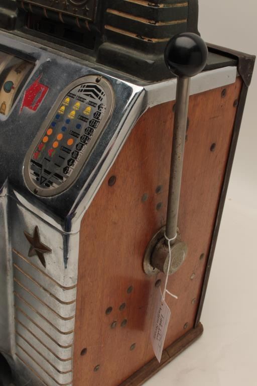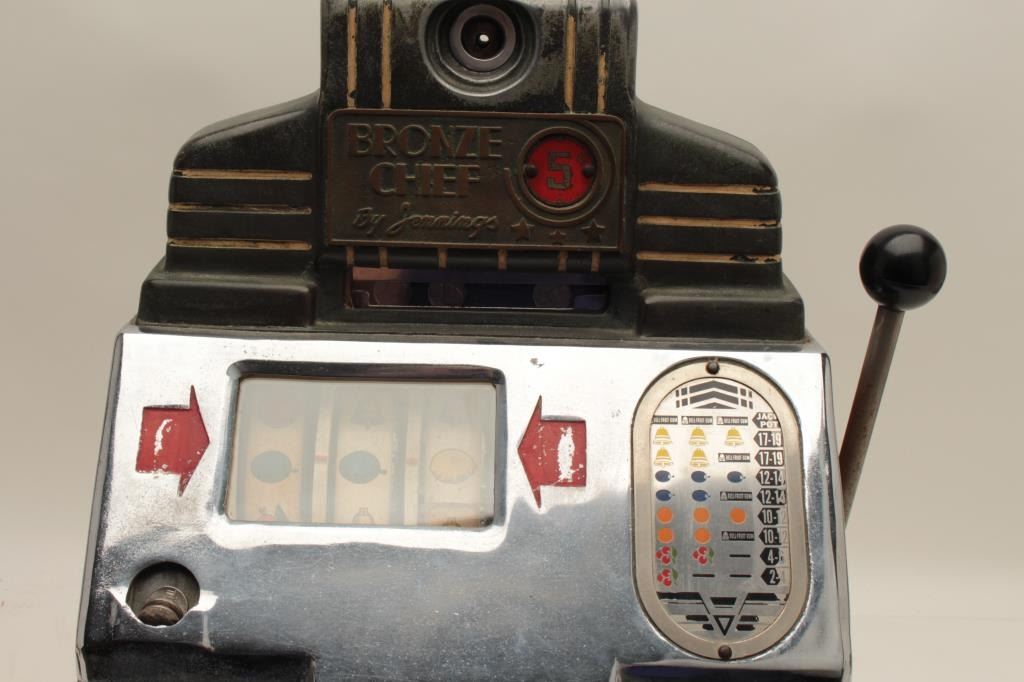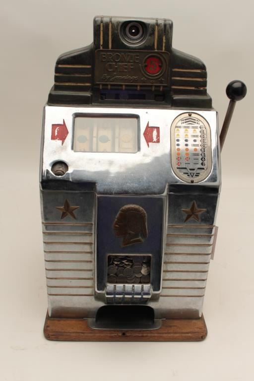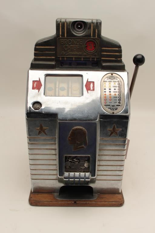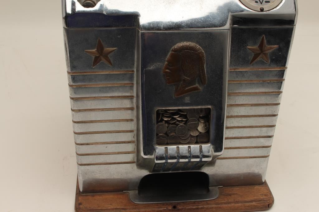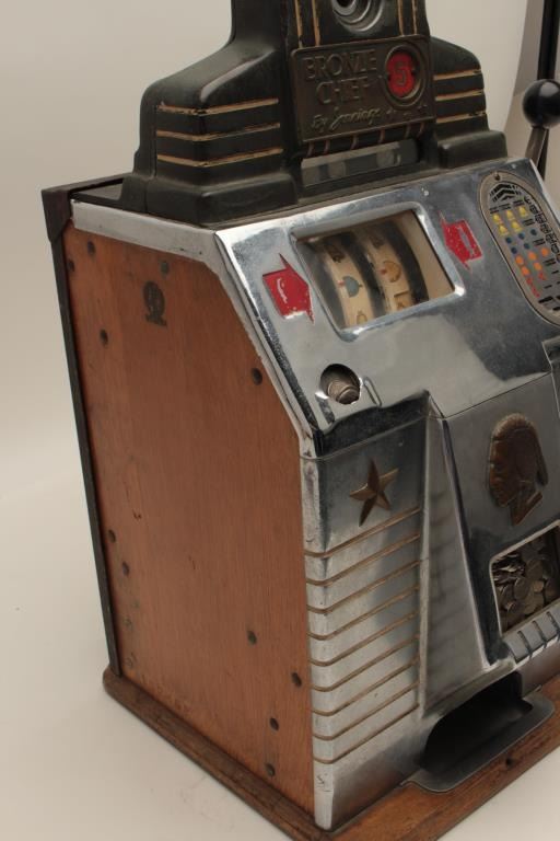 Bronze chief by Jennings .05 cent slot machine with key and cash box. Good to very good condition. Est.: $1000-$2000