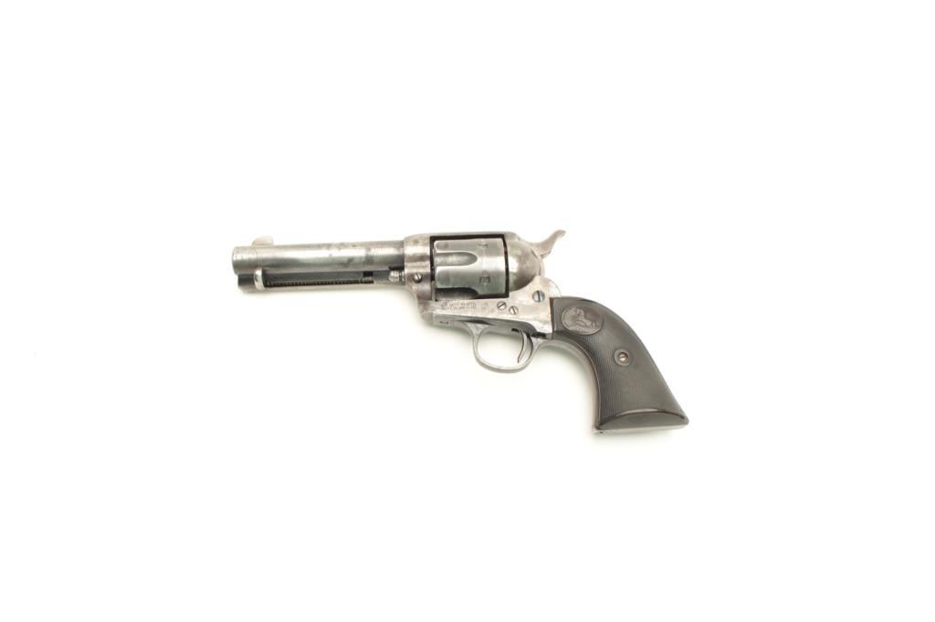 Colt SAA revolver, .38 W.C.F. caliber, 4.75” barrel, blued and case hardened finish, checkered hard rubber grips, S/N 272739, in overall good condition showing some original finish in protected areas with some scattered spots of erosion and light pitting; good action and markings, fair to good bore, good grips; accompanied by a Colt factory letter confirming caliber, barrel length and finish, stocks “Not Listed”; shipped to MontgomeryWard & Co., Chicago, IL. on Dec. 11, 1905, two guns in shipment. (C&R/No PPT). Est.: $1,250-$2,500.