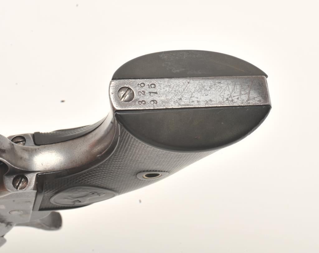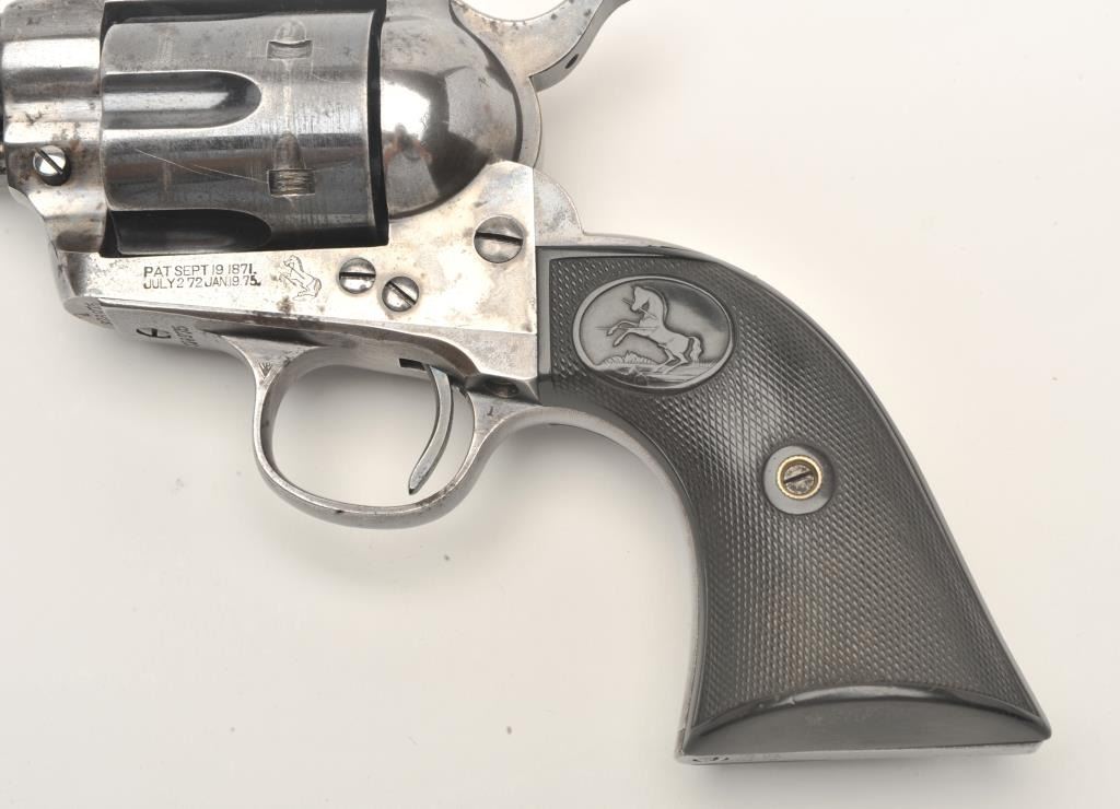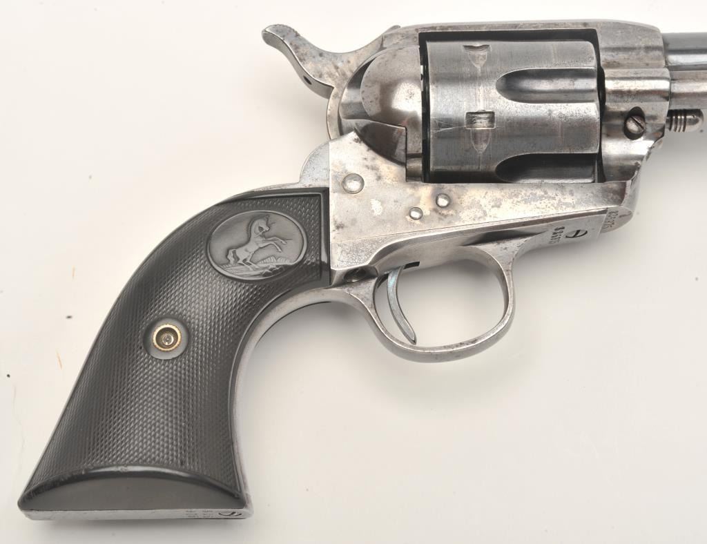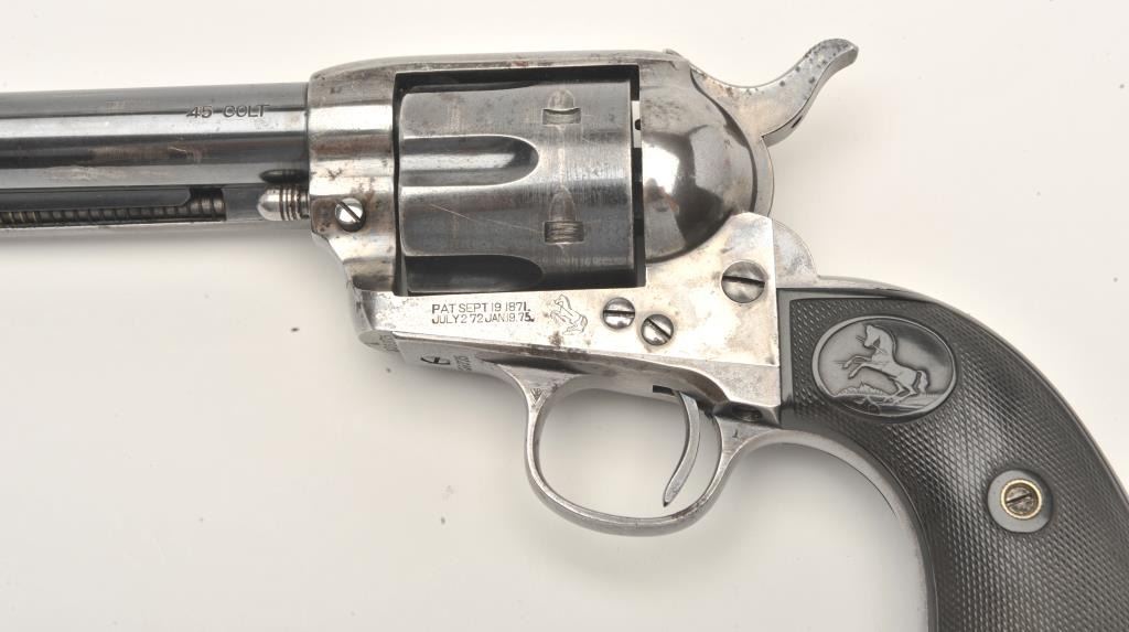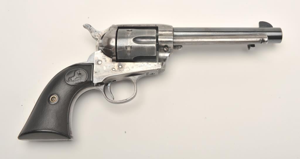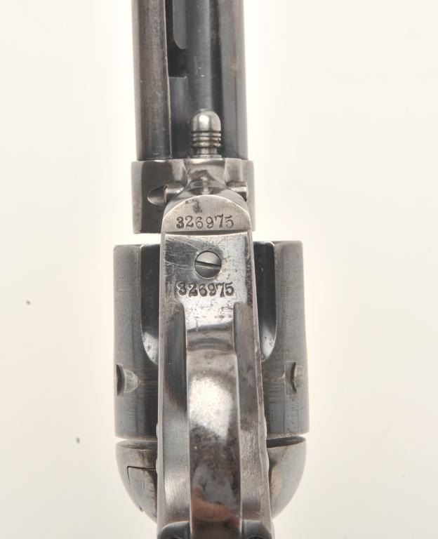 Colt SAA revolver, .45 caliber, 5.5” barrel, blued and case hardened finish, checkered hard rubber grips, S/N 326975, in overall very good to near fine condition displaying the majority of its original blued finishwith traces of case colors on frame, near fine bore, crisp action, sharp markings and very good + grips. Accompanied by a Colt factory letter confirming features except barrel listed as 7.5” and stocks “NotListed”; shipped to Montgomery Ward and Co., Chicago, IL. on June 14, 1913, one gun in shipment. (C&R/No PPT). Est.: $1,750-$3,500.