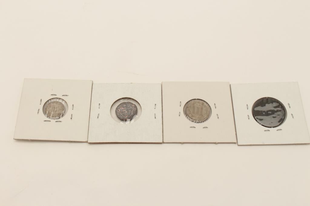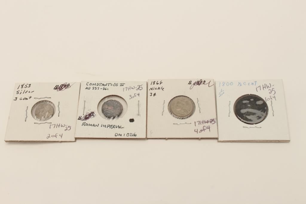 Lot of coins as described: 1853 3 cent U.S., Roman imperial 337 A.D.-361 A.D., 1866 nickel, 1800 half cent. Est.: $80-$160