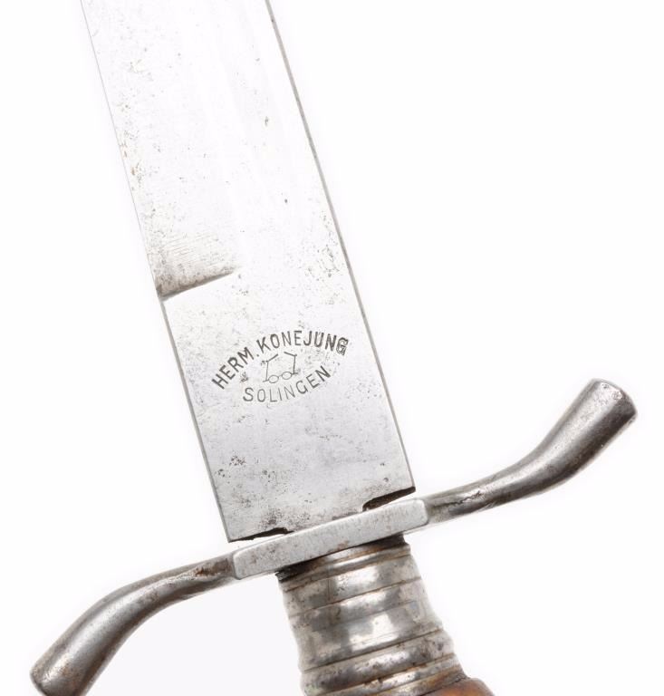 Late 19th Century German hunting knife, approximately 13.5” overall with an 8.5” blade marked “HERM. KONEJUNG/SOLINGEN”; overall good condition with stag grip and some scattered spots of erosion on blade.Est.: $150-$300.