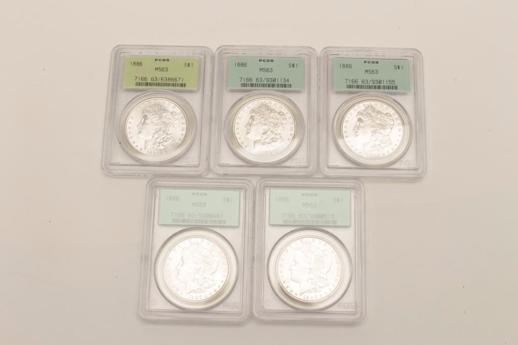 PCGS Graded MS-63 U.S. Dollars 5 total. Dated 1886 Est:$275-550