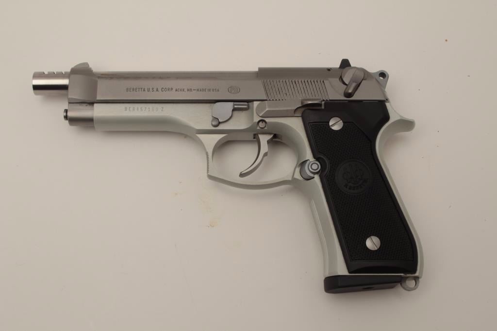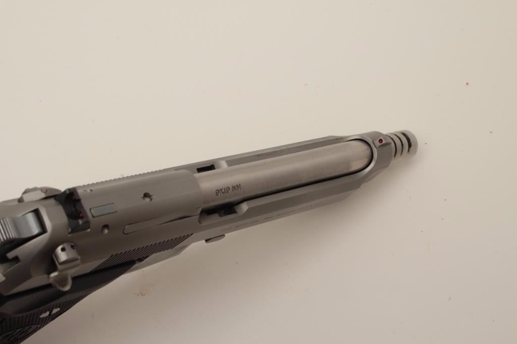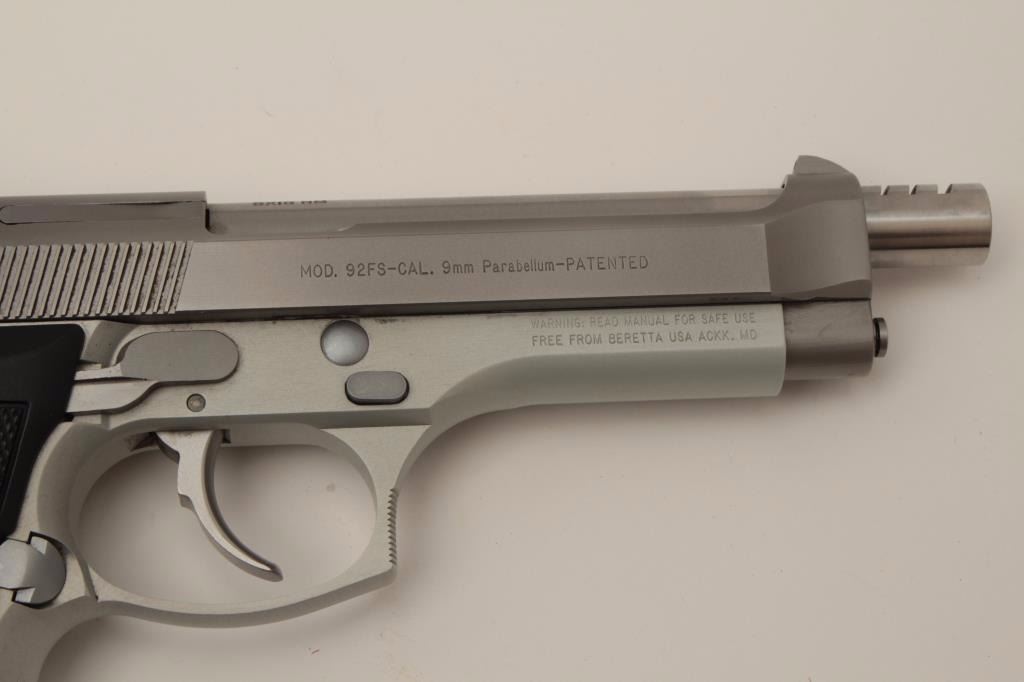 Beretta 92FS 9mm Semi-Auto pistol hard chrome finish with aftermarket compensated and extended barrel marked 9x19mm (Barrel not maker marked) and measures 5 3/8”. Fine to excellent condition with 10 round mag.(Modern/PPT) Est.: $300-600