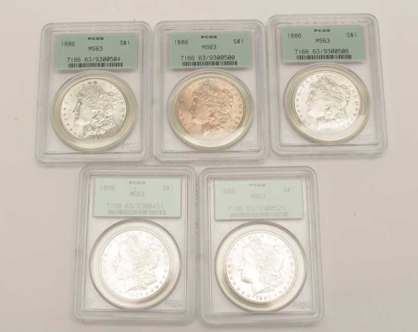 Lot 1448 PCGS Graded MS-63 U.S. Dollars 5 total. Dated 1886 Est:$275-550