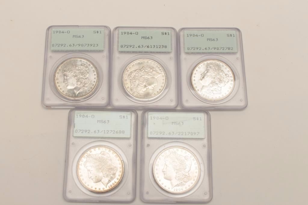 Lot 1449 PCGS 1904-O U. S. Dollars, old holders, 5 total. Est:$275-550